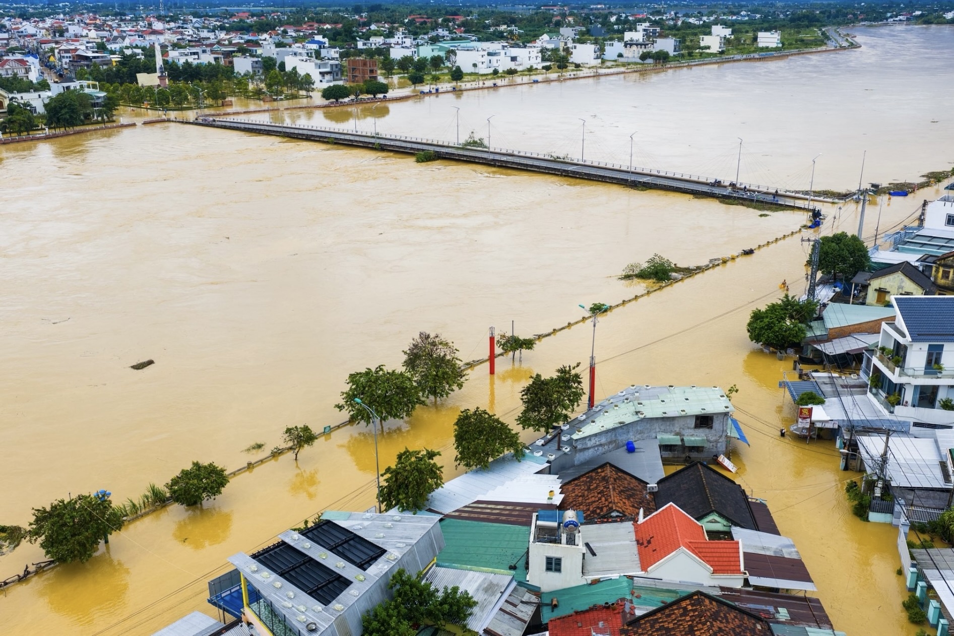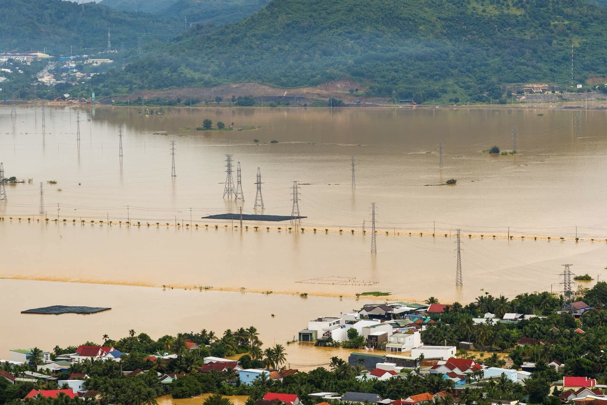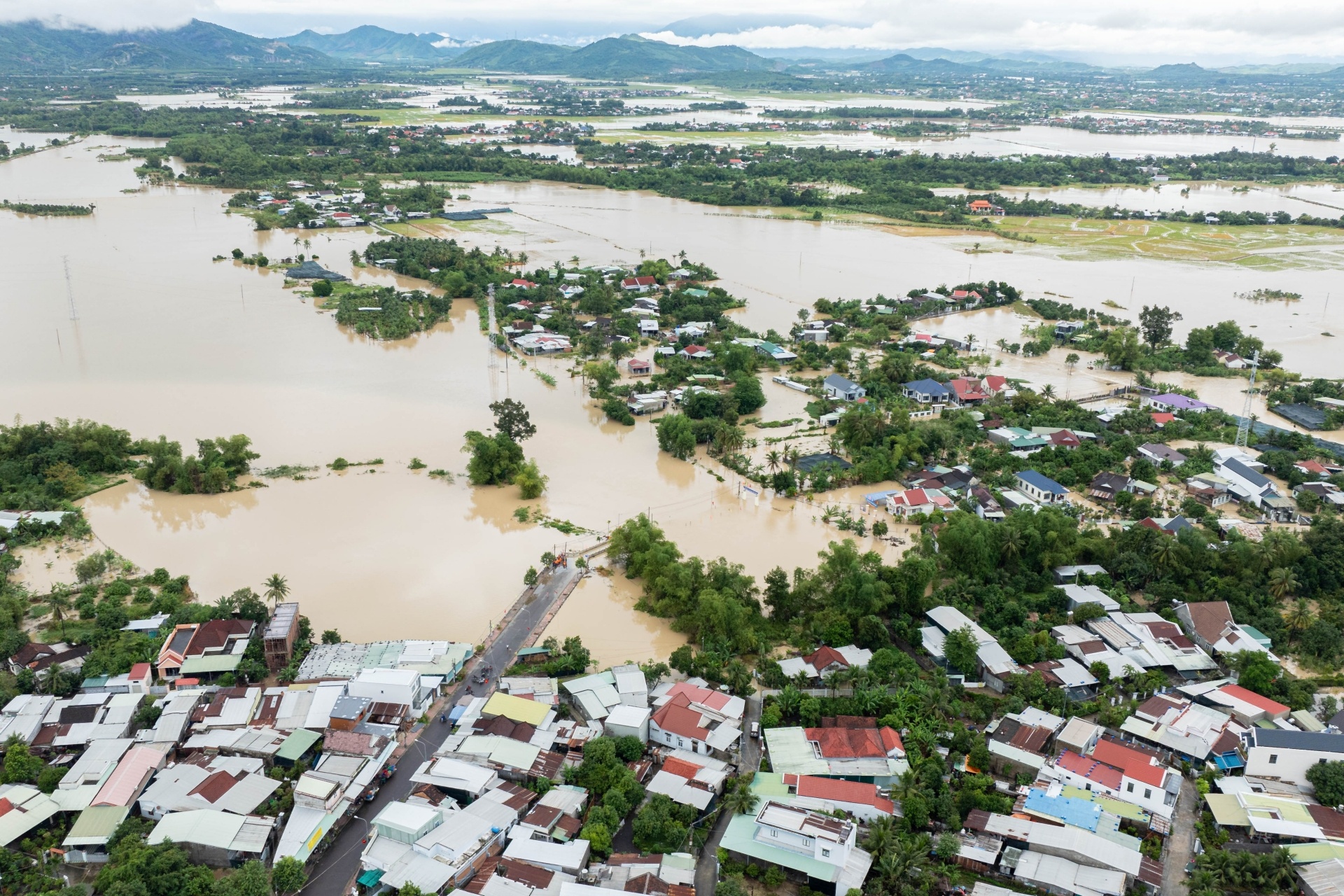 Trong khi đó, do ảnh hưởng hoàn lưu áp thấp, nhiều nơi ở Khánh Hòa ngập sâu. Tại Nha Trang, nhiều tuyến đường bị nước lũ chia cắt, đặc biệt là khu vực gần sông Cái và vùng trũng như đường 23 Tháng 10, Nguyễn Khuyến, 2 Tháng 4. Hình ảnh chụp xã Suối Hiệp trên cao lúc 12h30 ngày 17/11. Ảnh: Ken Huy.