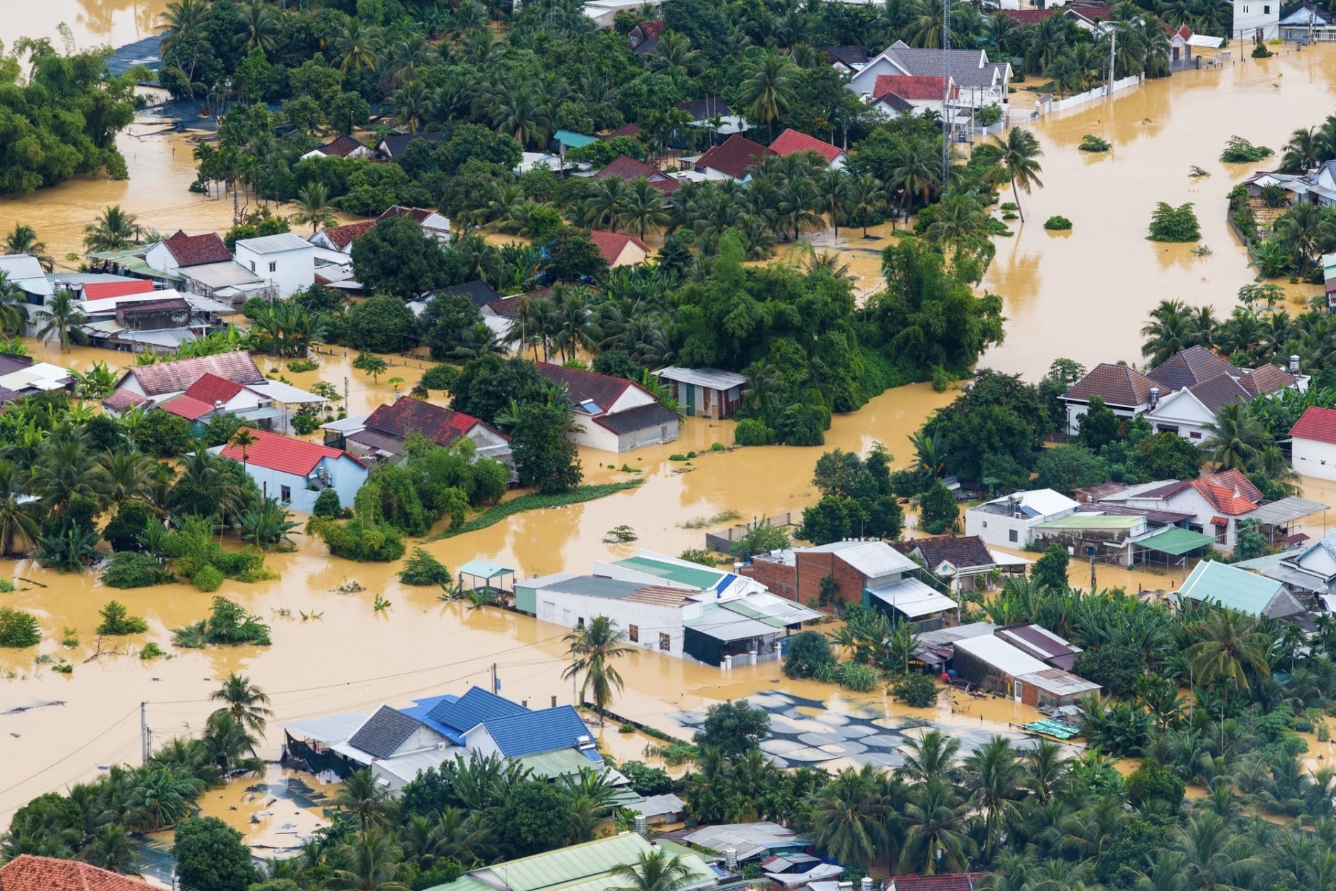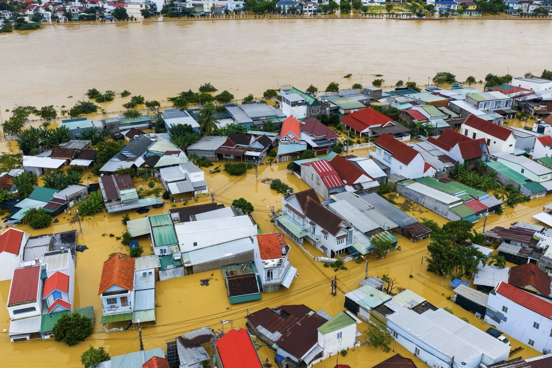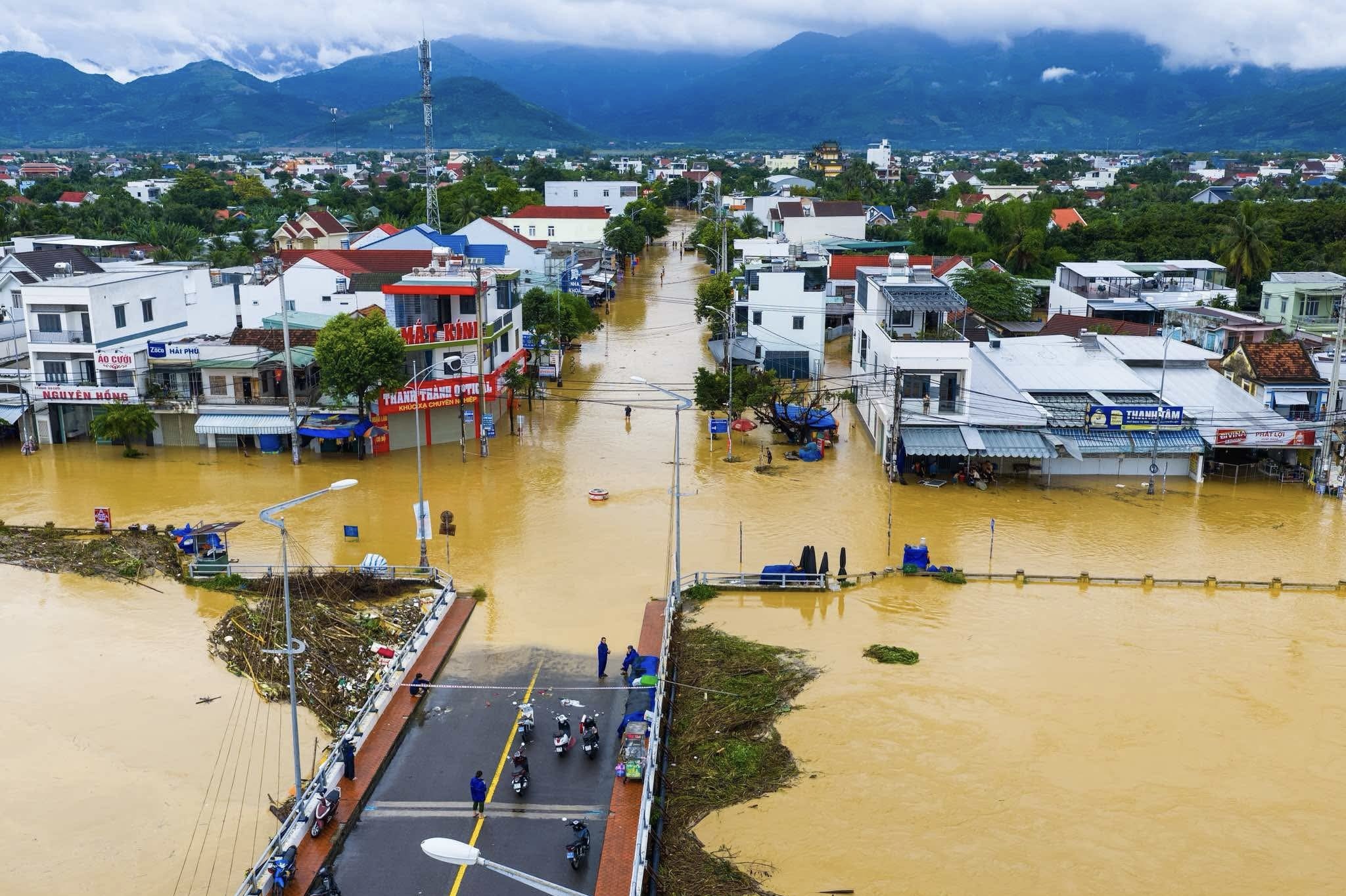 Trong khi đó, do ảnh hưởng hoàn lưu áp thấp, nhiều nơi ở Khánh Hòa ngập sâu. Tại Nha Trang, nhiều tuyến đường bị nước lũ chia cắt, đặc biệt là khu vực gần sông Cái và vùng trũng như đường 23 Tháng 10, Nguyễn Khuyến, 2 Tháng 4. Hình ảnh chụp xã Suối Hiệp trên cao lúc 12h30 ngày 17/11. Ảnh: Ken Huy.