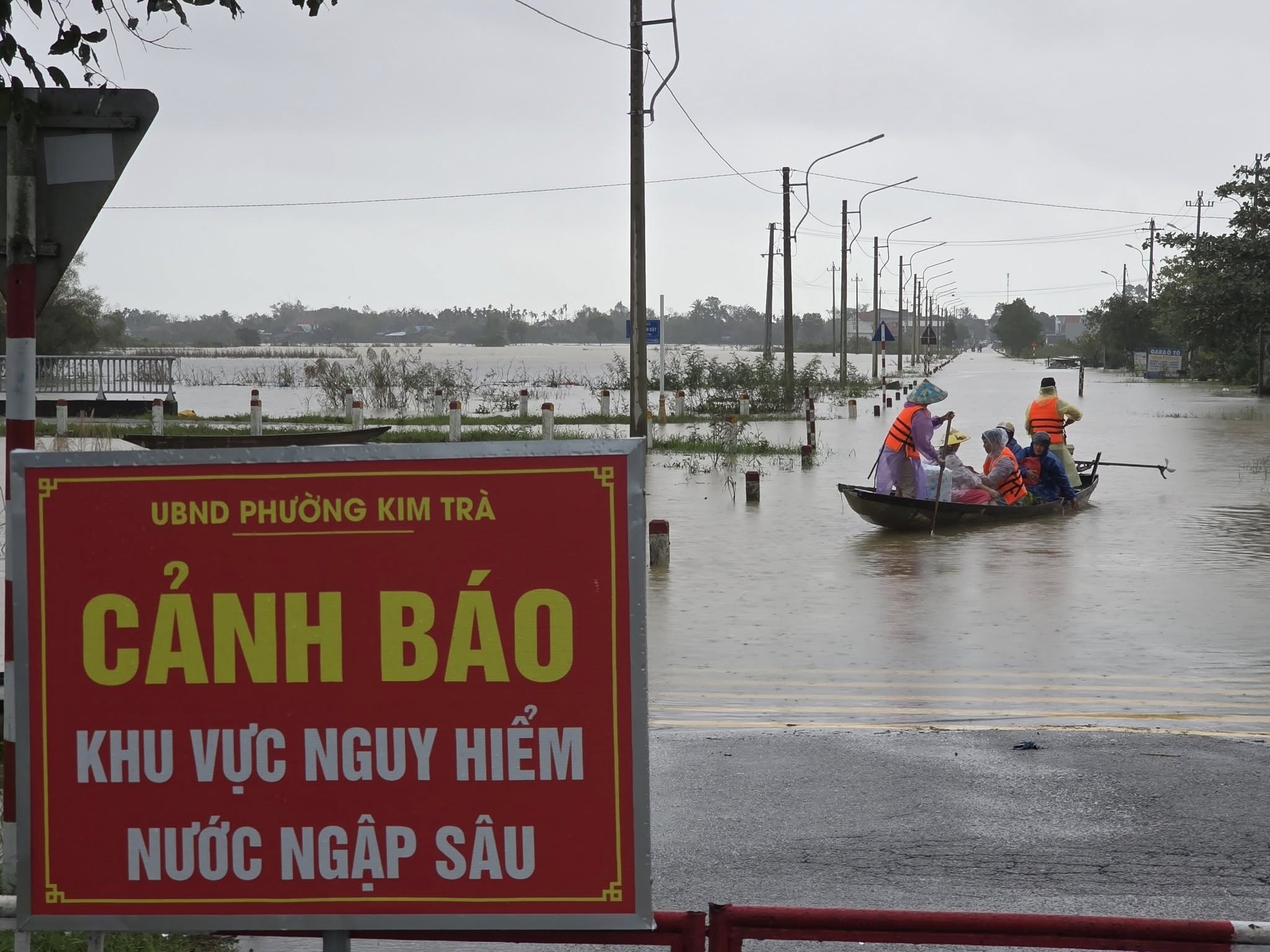 Đường vào khu di tích lưu niệm Đại tướng Nguyễn Chí Thanh ngập sâu lúc 9h05 ngày 17/11. Người dân, lực lượng cứu hộ buộc di chuyển bằng thuyền. Ảnh: Nguyễn TA Phong.