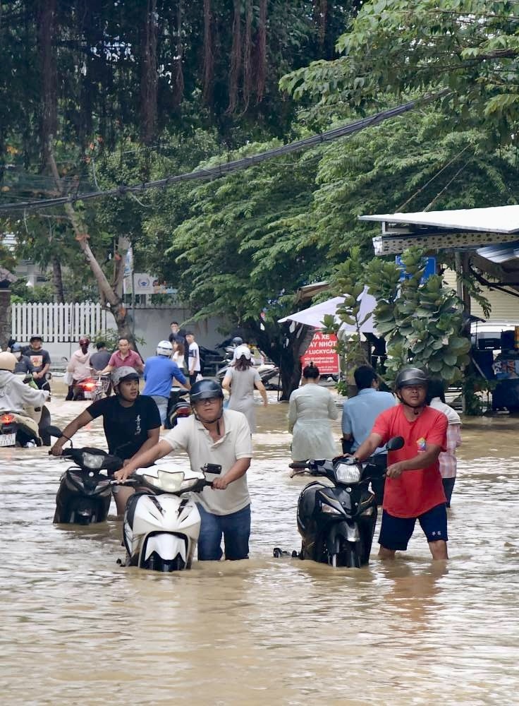 TP Nha Trang "thất thủ" tại nhiều tuyến đường. Trong đó, phường Ba Ngòi là một trong số khu vực ngập sâu bậc nhất thành phố. Ông Nguyễn Quốc Bảo - Bí thư phường Ba Ngòi - cho biết địa phương đang huy động lực lượng cứu trợ bà con ở vùng trũng. Mực nước lên nhanh khiến người dân không kịp trở tay, một số buộc cố thủ trên mái nhà. Hình ảnh chụp lúc 16h ngày 17/11. Ảnh: Quốc Bảo.