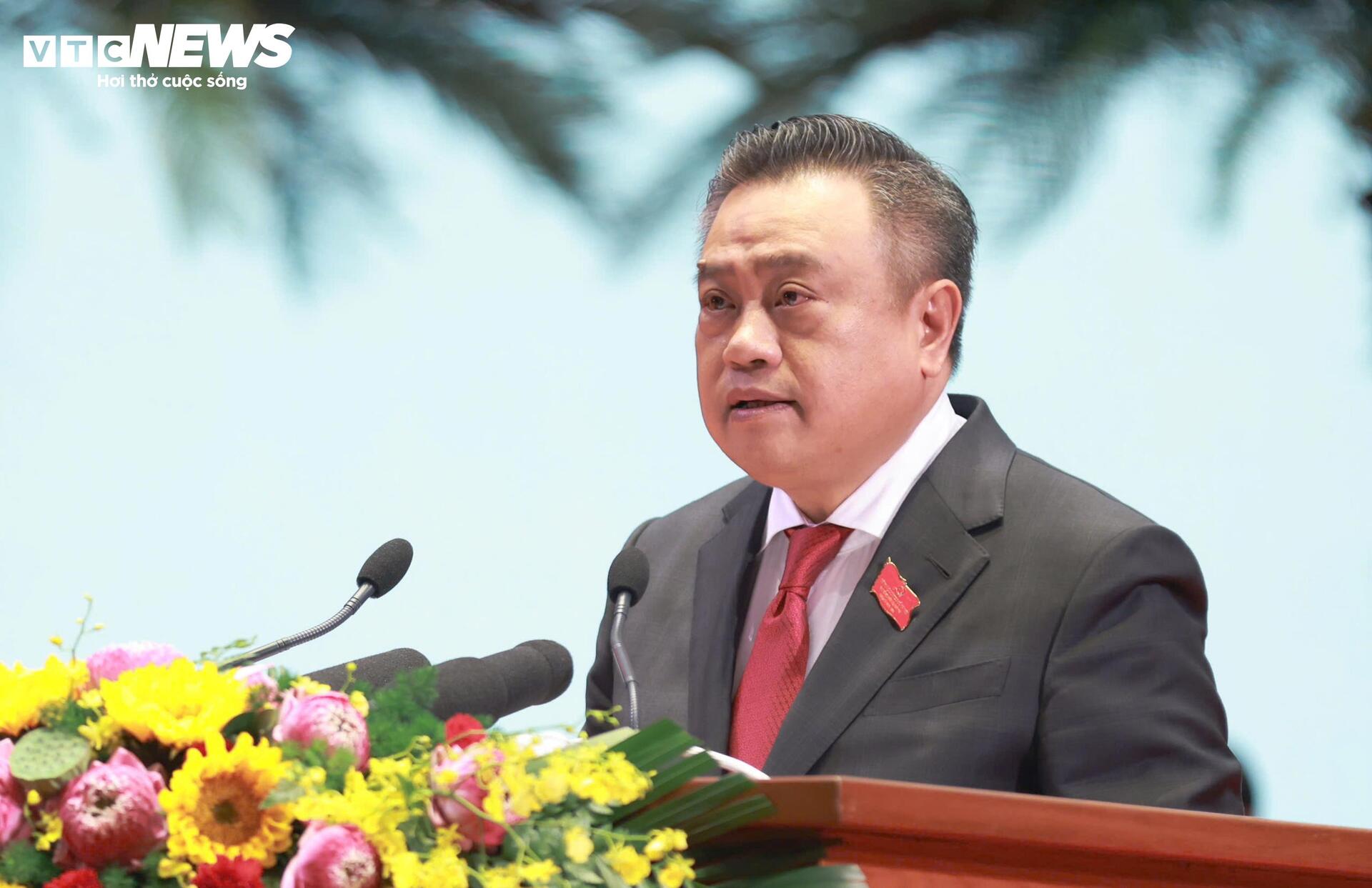 Ủy viên Trung ương Đảng, Phó Bí thư Thành ủy, Chủ tịch UBND TP Hà Nội Trần Sỹ Thanh trình bày Báo cáo kiểm điểm của Ban Chấp hành Đảng bộ TP khóa XVII tại Đại hội.