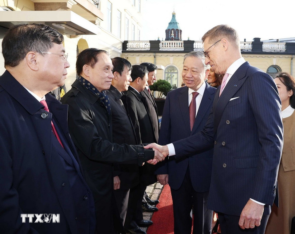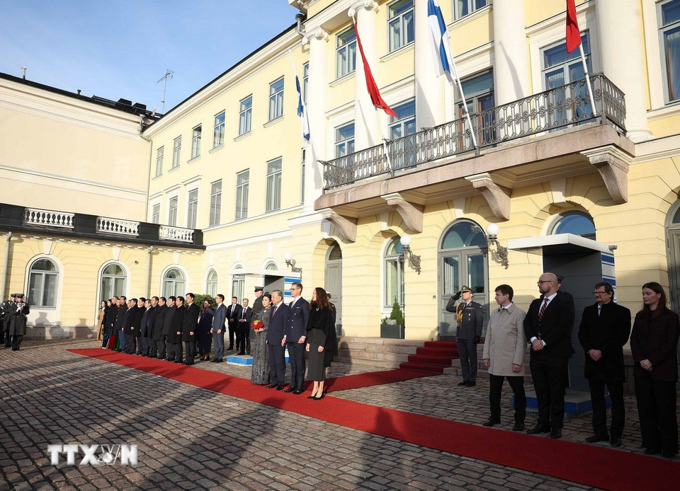 Tổng thống Cộng hòa Phần Lan Alexander Stubb và Phu nhân chủ trì Lễ đón chính thức Tổng Bí thư Tô Lâm và Phu nhân thăm chính thức Cộng hòa Phần Lan. (Ảnh: Thống Nhất/TTXVN)