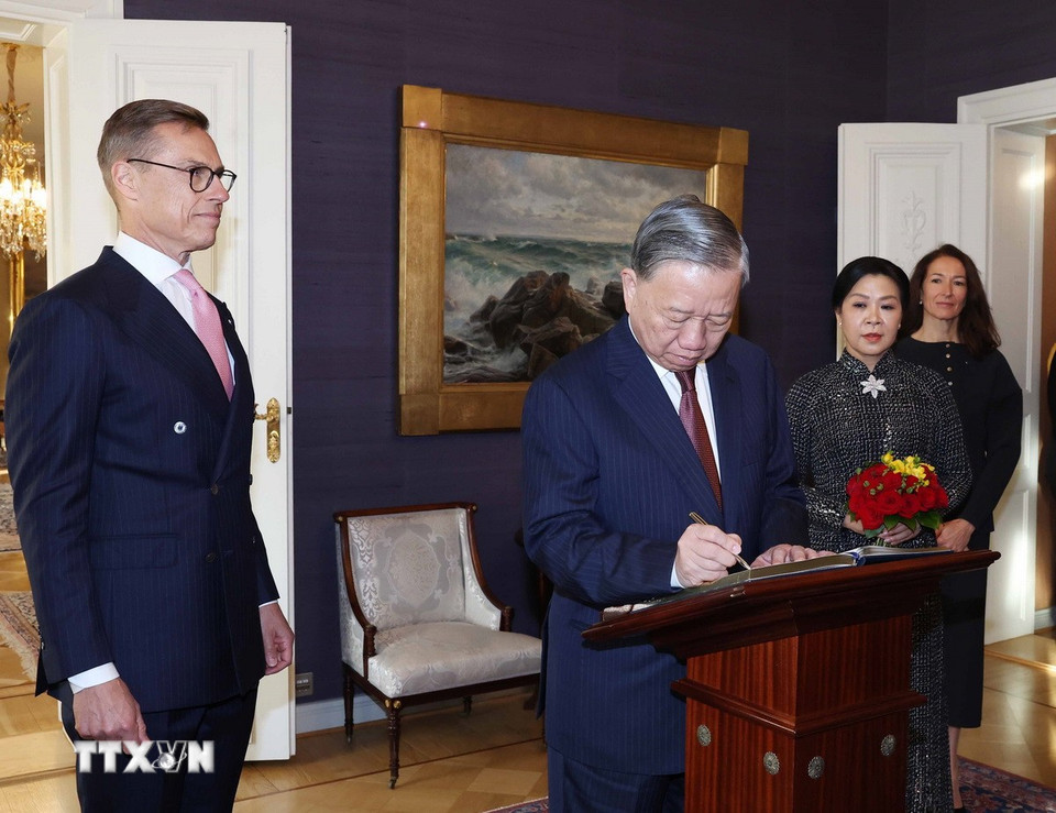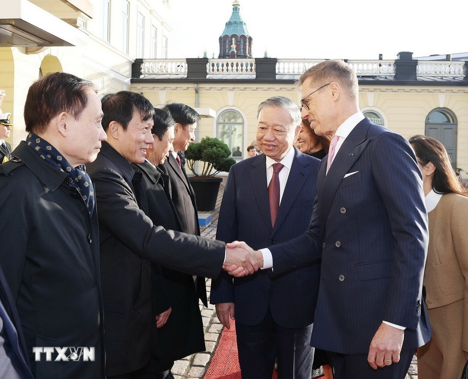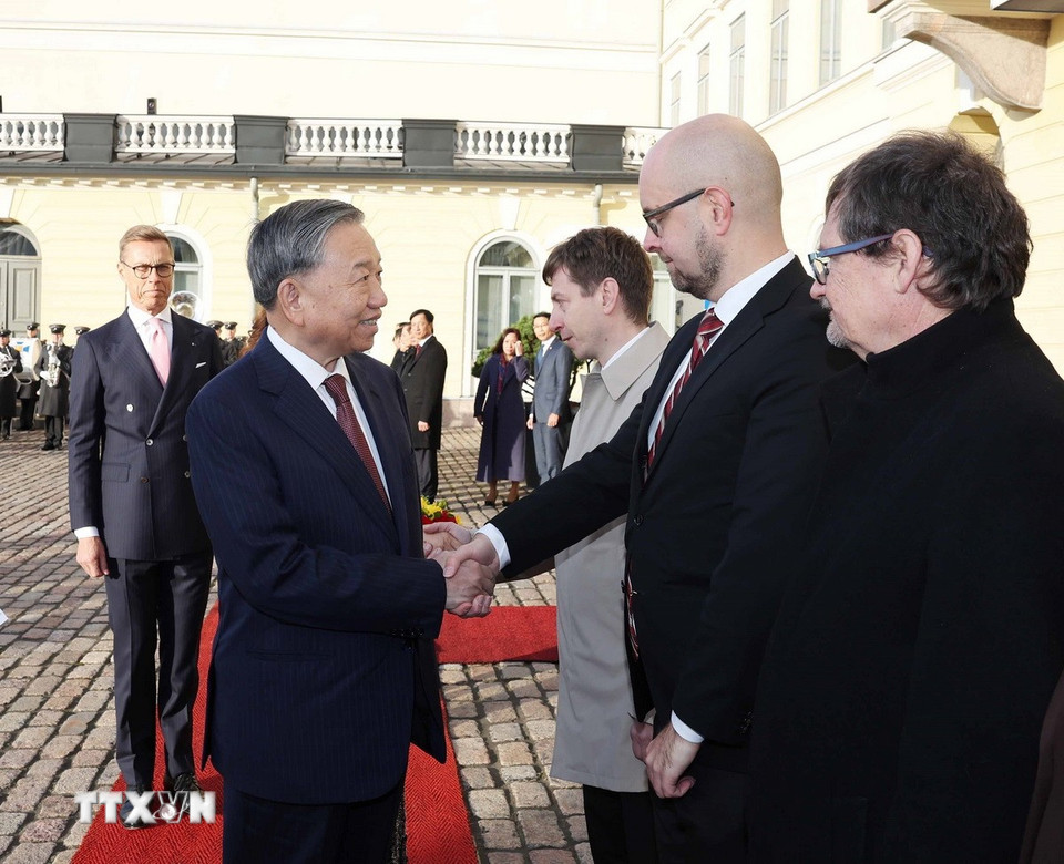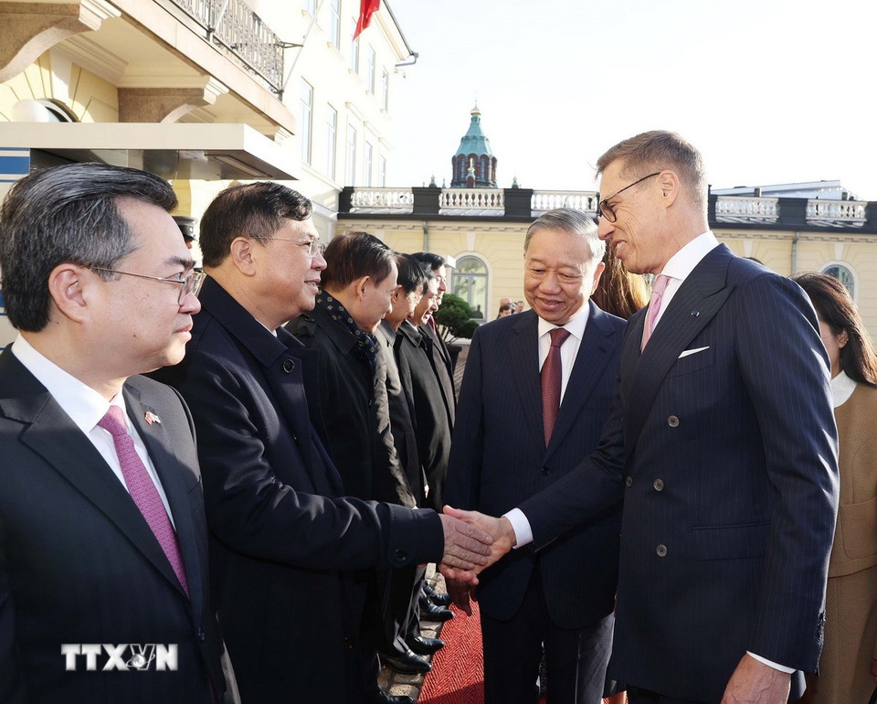Tổng Bí thư Tô Lâm và các quan chức Phần Lan. (Ảnh: Thống Nhất/TTXVN)