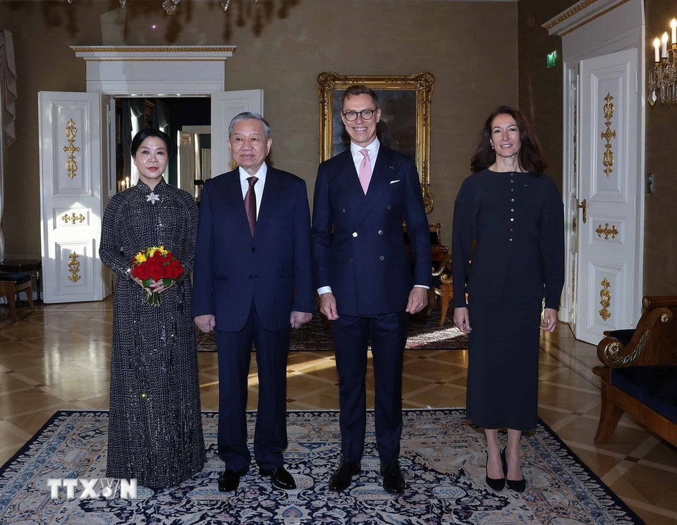 Tổng Bí thư Tô Lâm và Phu nhân với Tổng thống Cộng hòa Phần Lan Alexander Stubb và Phu nhân chụp ảnh chung. (Ảnh: Thống Nhất/TTXVN)