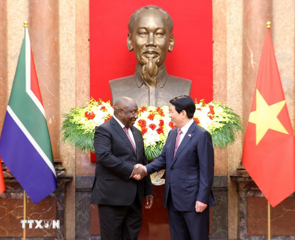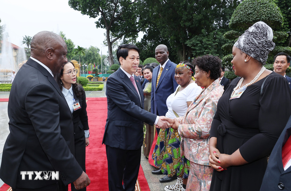 Chủ tịch nước Lương Cường đón Tổng thống Nam Phi Matamela Cyril Ramaphosa tại Phủ Chủ tịch. (Ảnh: Lâm Khánh/TTXVN)
