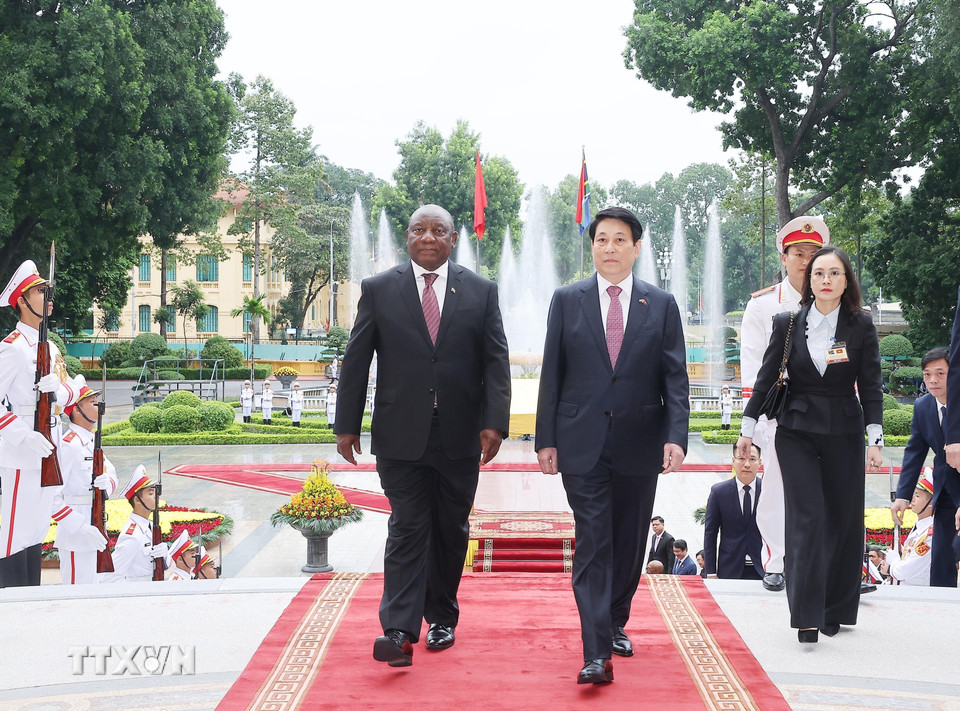 Chủ tịch nước Lương Cường và Tổng thống Nam Phi Matamela Cyril Ramaphosa duyệt Đội danh dự Quân đội nhân dân Việt Nam. (Ảnh: Lâm Khánh/TTXVN)