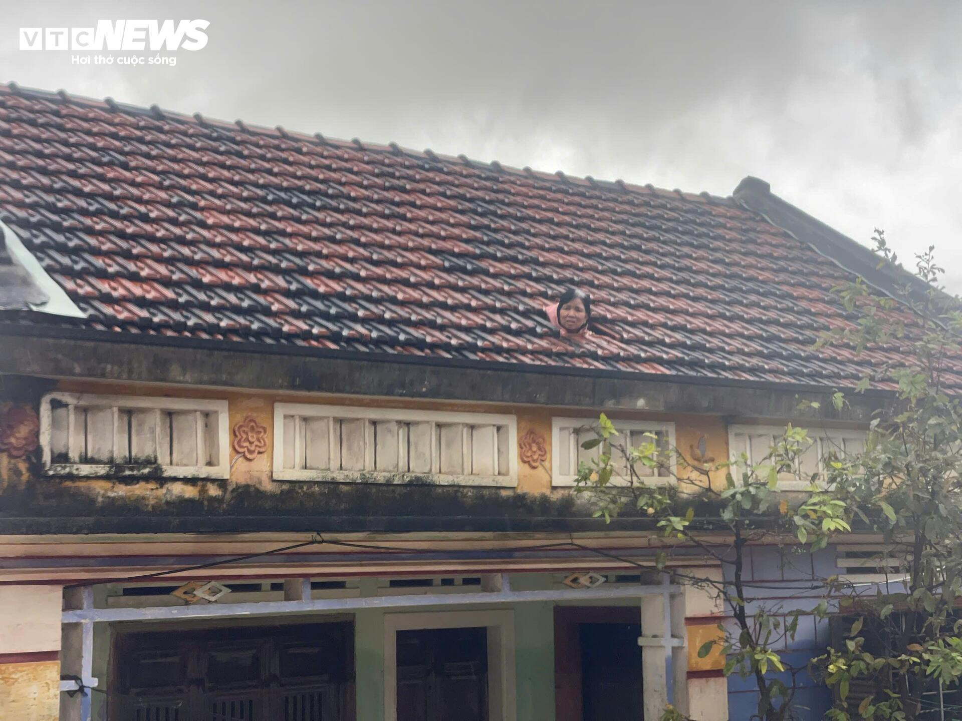 Tại Gia Lai, tình hình ngập lụt kéo dài khiến nhiều người dân cầu cứu. Trong ảnh là người phụ nữ ở phường Quy Nhơn Đông dỡ ngói để ngoi lên cầu xin sự giúp đỡ.