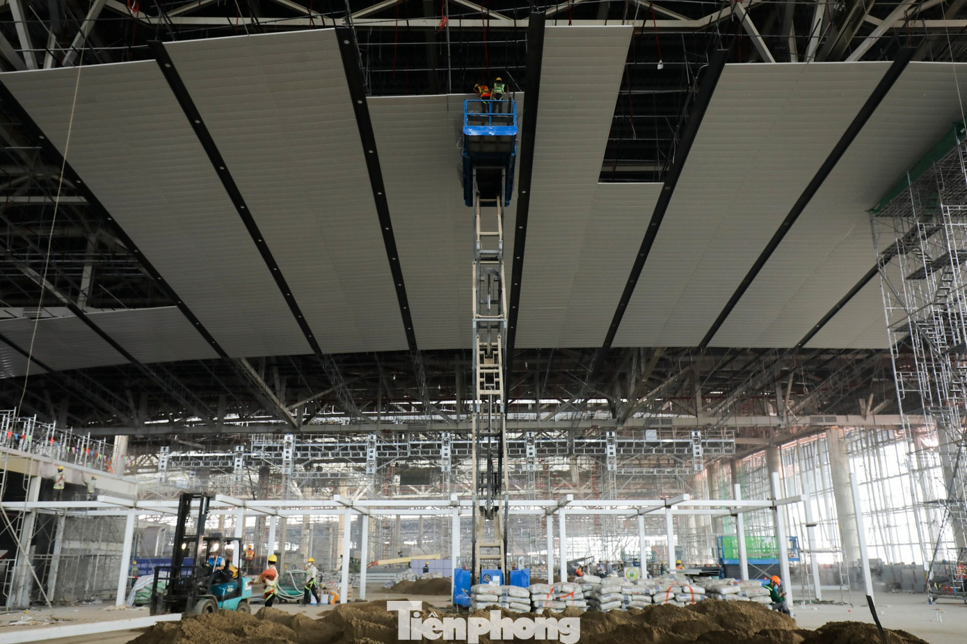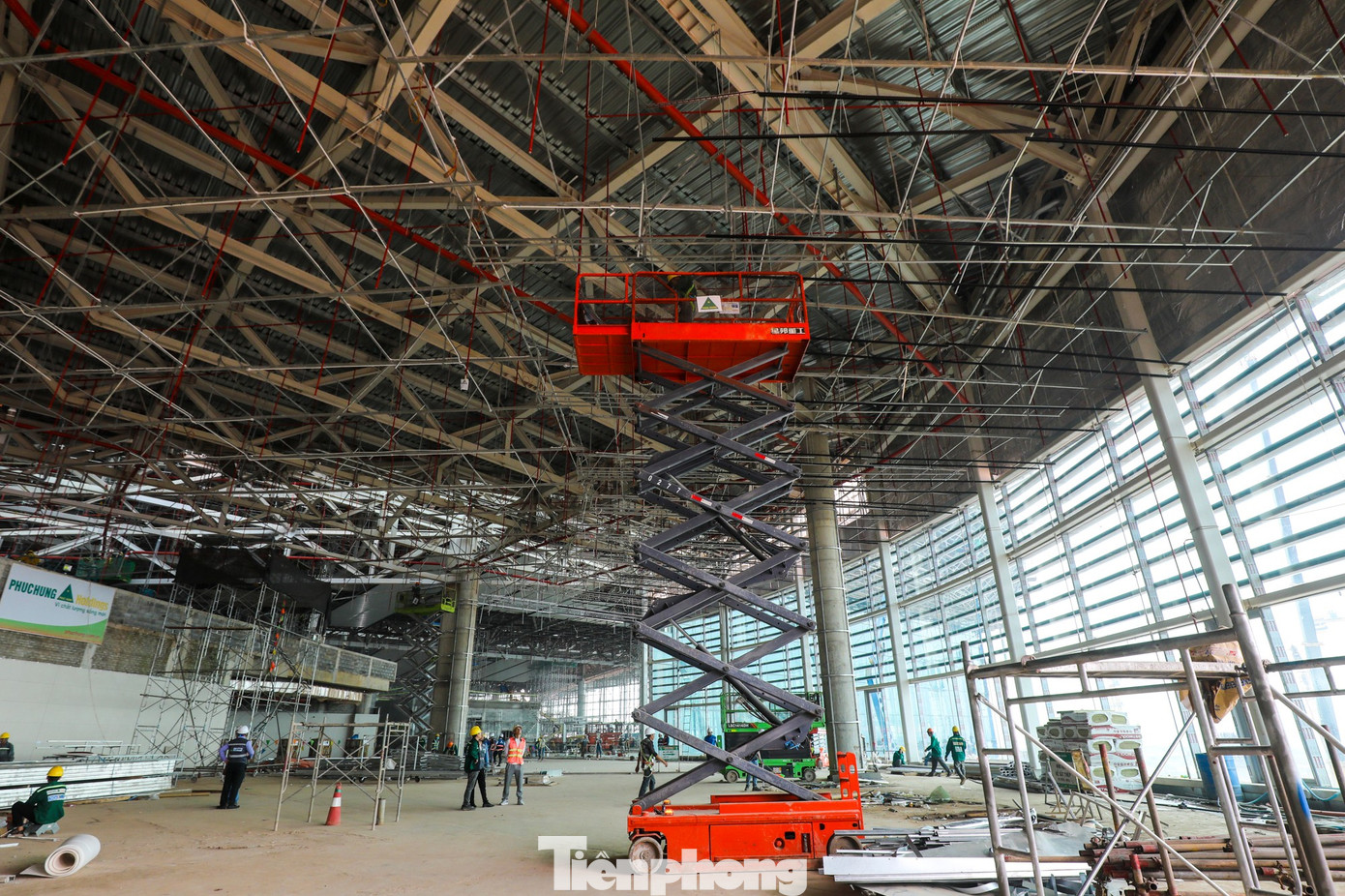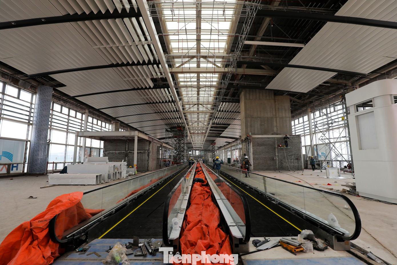 Bên trong nhà ga, ba tầng đang đồng loạt thi công lợp trần, lát nền, phòng chức năng, băng chuyền. Mặt bên ngoài nhà ga cũng đang lắp kính được khoảng 80%. Theo nhà thầu, diện tích kính phủ bề mặt nhà ga khoảng 70.000 m2.
