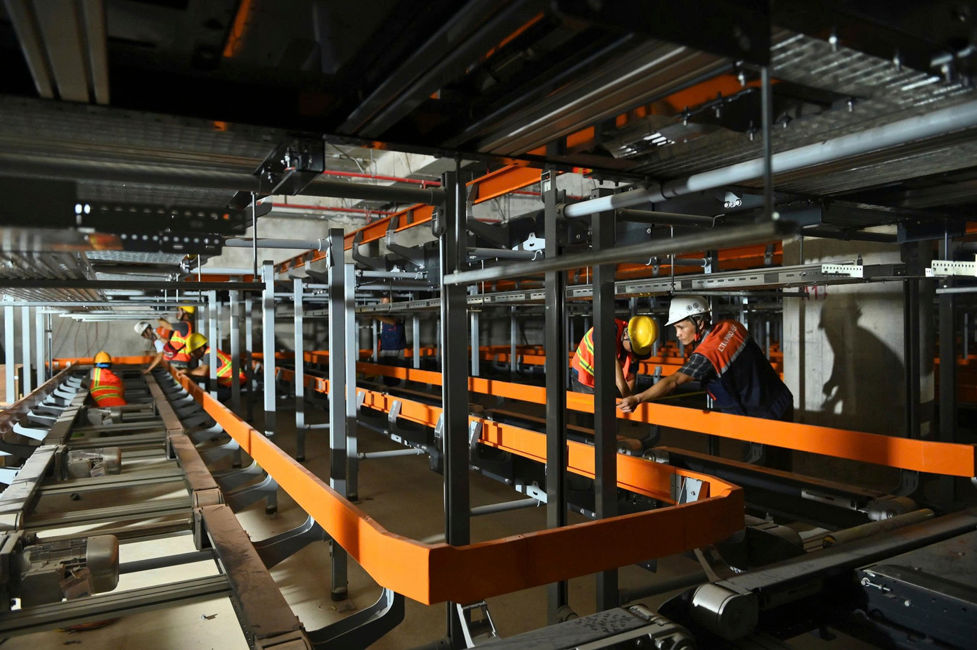 Máy soi chiếu hành lý được lắp ráp bên trong nhà ga. Chủ đầu tư cho biết khu kiểm tra an ninh có 12 làn kiểm tra tự động nhận diện khuôn mặt, kèm hệ thống soi chiếu và dò chất nổ hiện đại, rút ngắn thời gian kiểm tra. Hệ thống băng tải và băng chuyền đang được lắp đặt giữa các tầng của nhà ga.