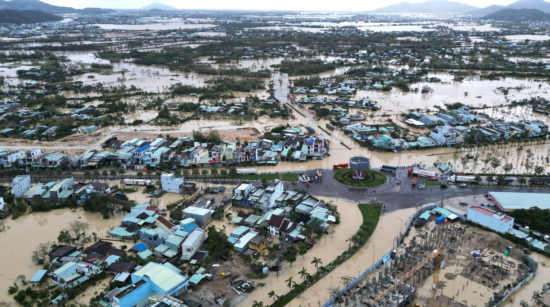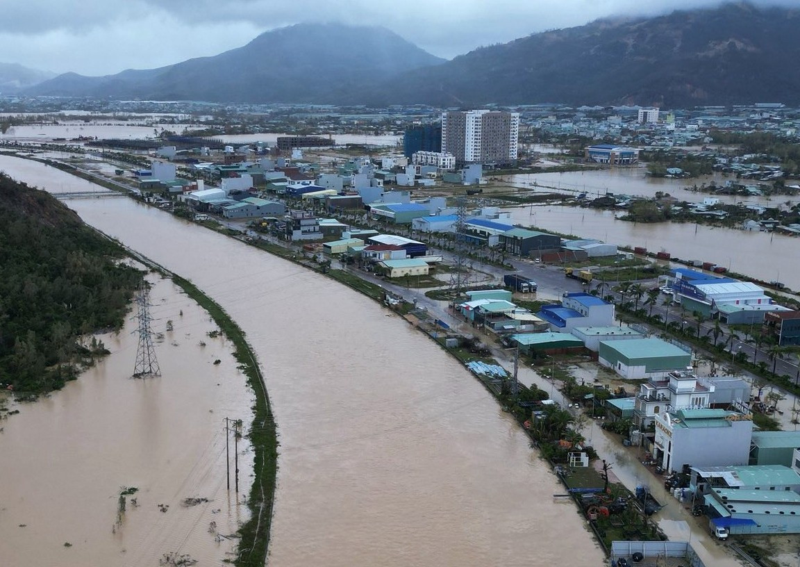 Khu vực Tuy Hòa sáng 20/11, nước lũ vẫn còn rất lớn. Ảnh: Tuy Hòa Young TV