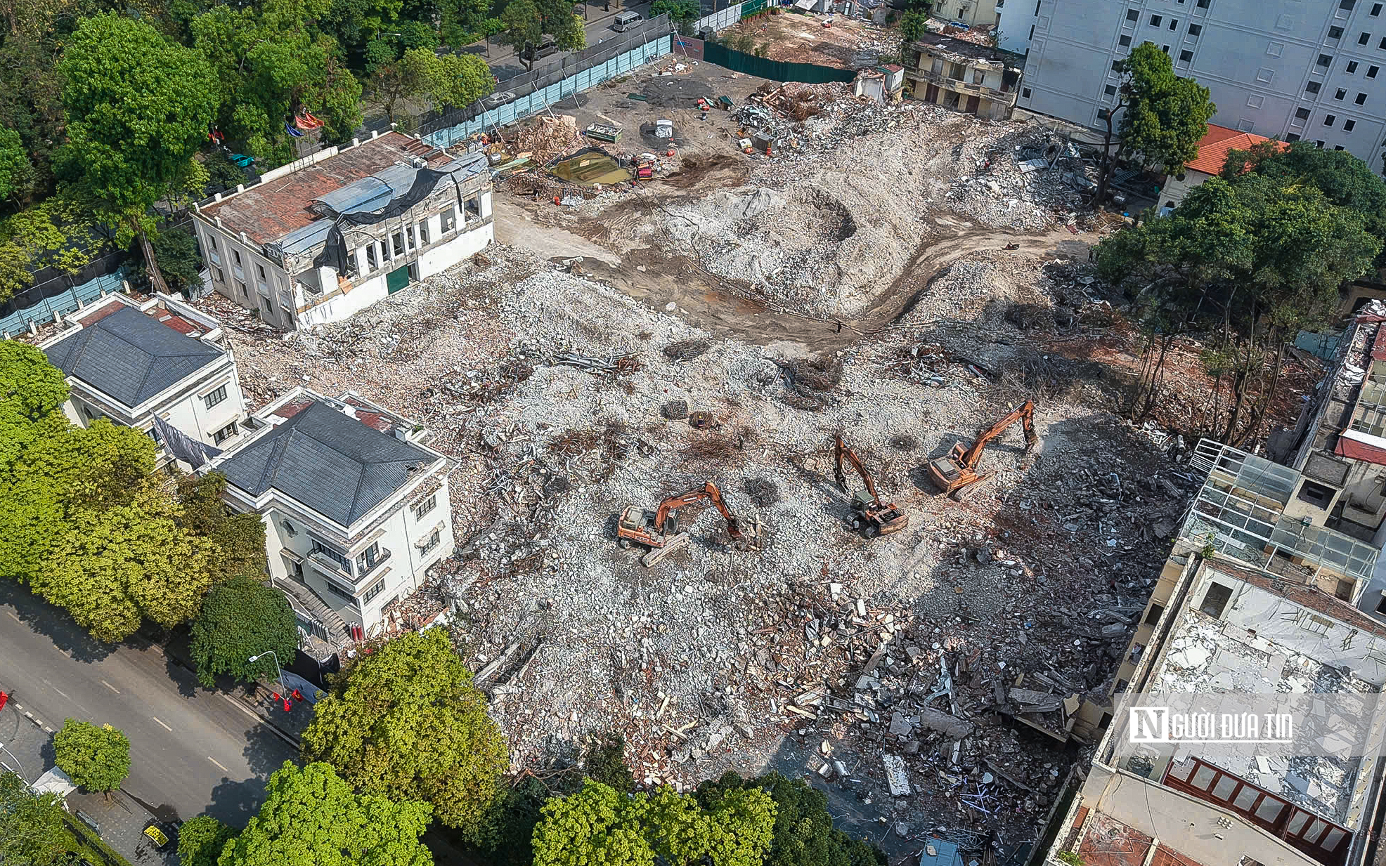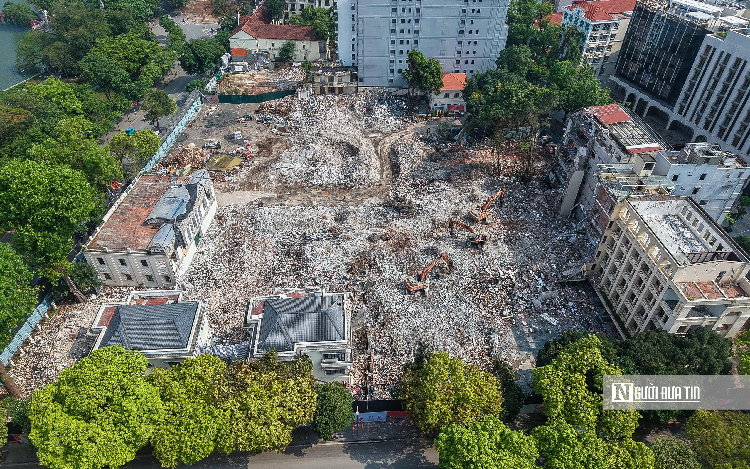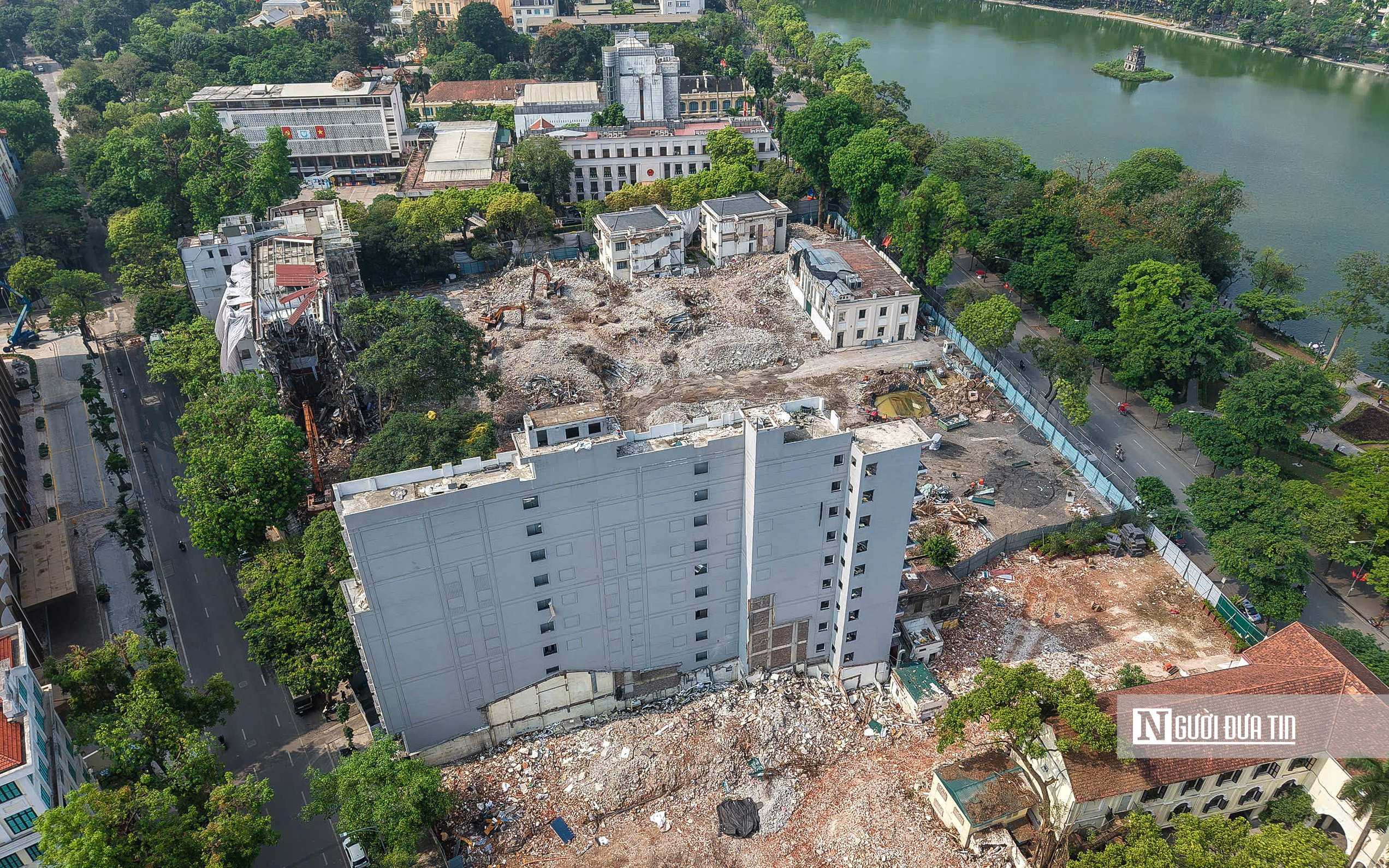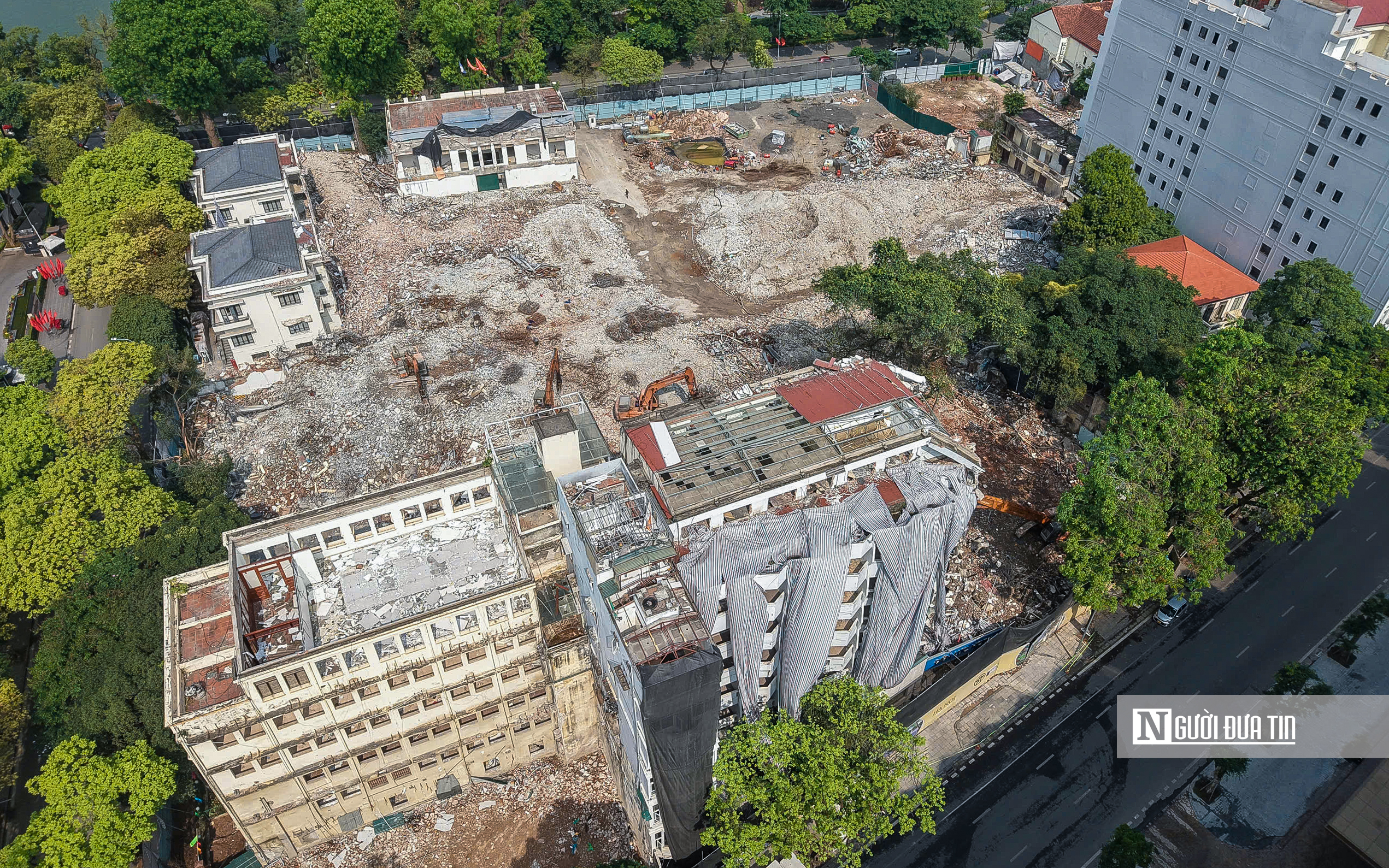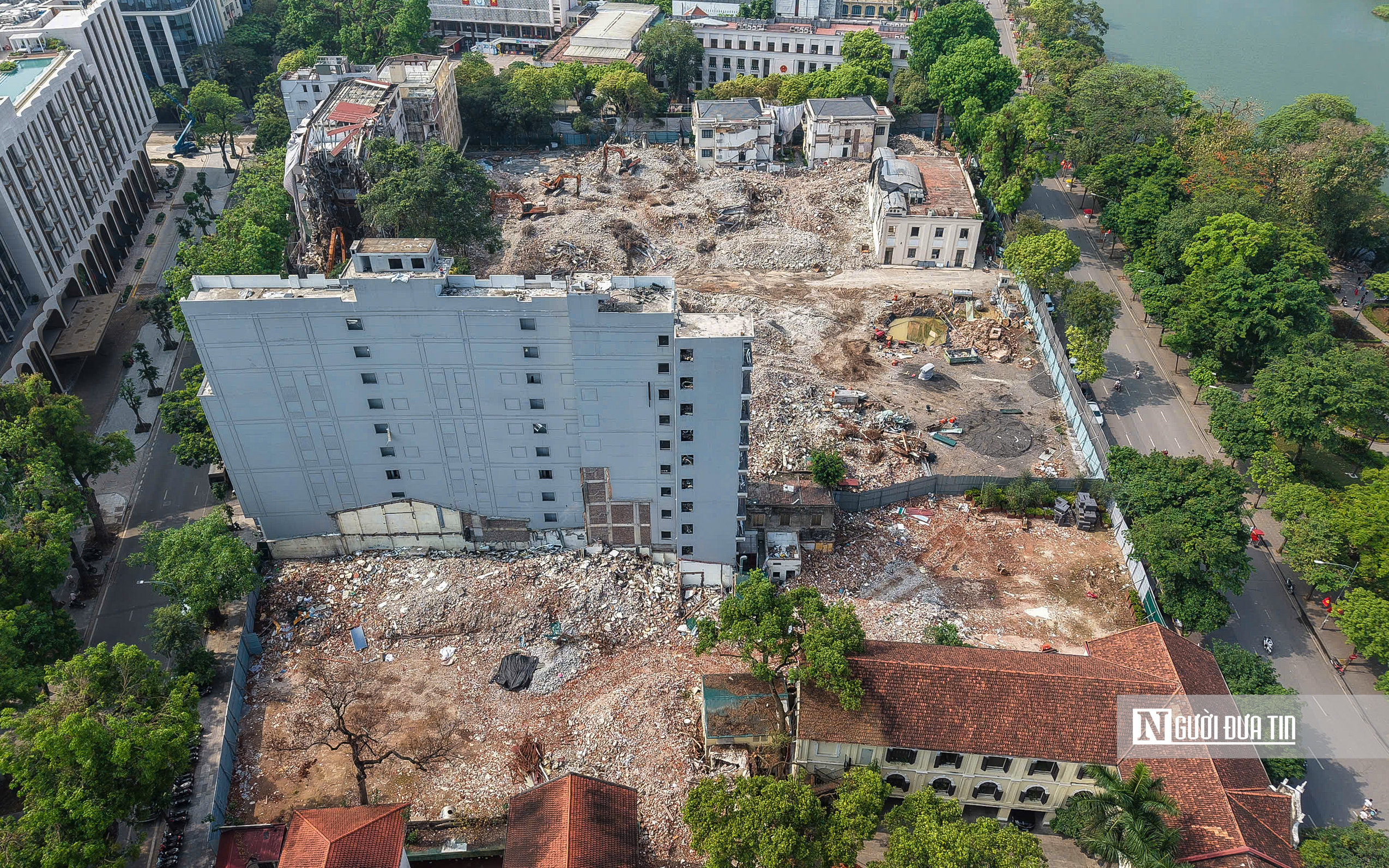 Từ trên cao có thể thấy phần lớn công trình đã được phá dỡ, nhường chỗ cho một khoảng không gian rộng lớn phủ kín gạch đá, vật liệu xây dựng và các cụm máy móc thi công hoạt động liên tục.