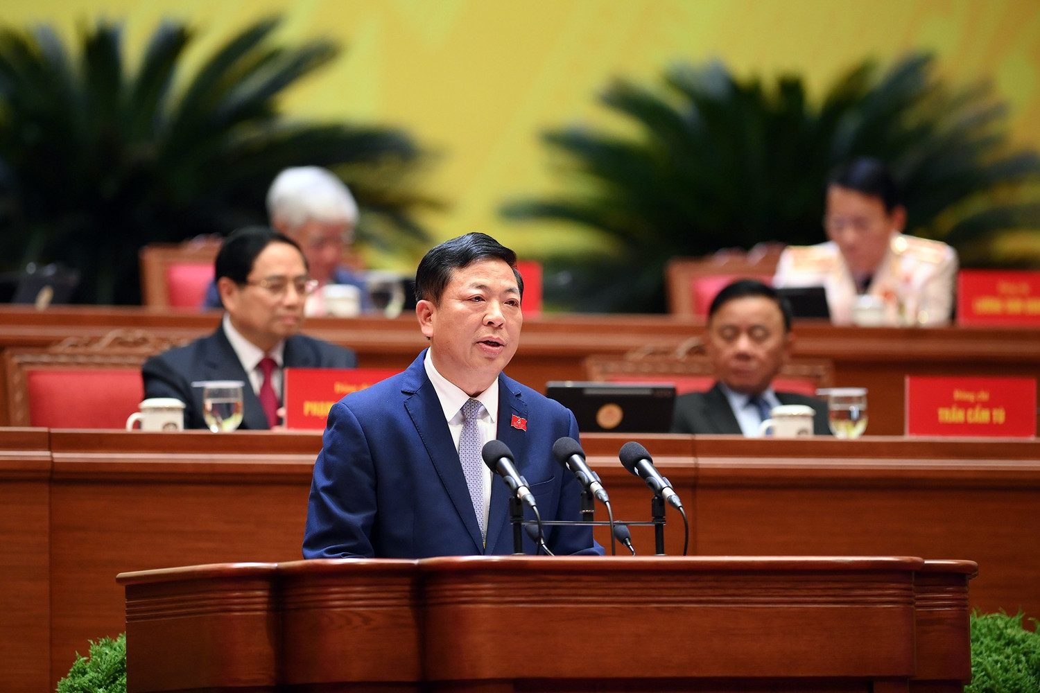 Đồng chí Nguyễn Văn Phong, Phó Bí thư Thường trực Thành ủy Hà Nội, tham luận về vấn đề "Đổi mới phương thức lãnh đạo xây dựng Đảng bộ thành phố Hà Nội trong sạch, vững mạnh, kiểu mẫu, góp phần đưa đất nước vững bước vào kỷ nguyên vươn mình của dân tộc". Ảnh: Nhân dân.