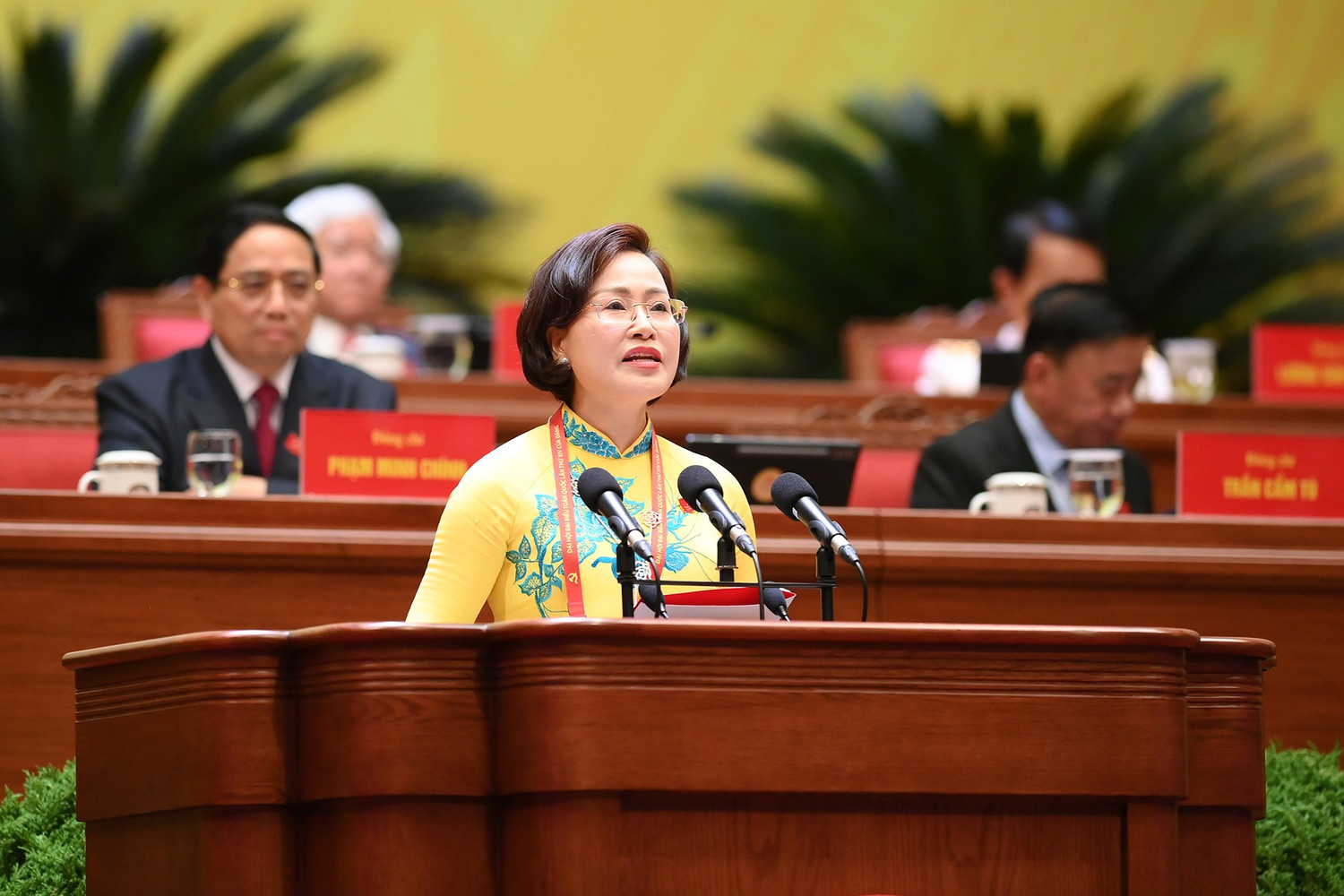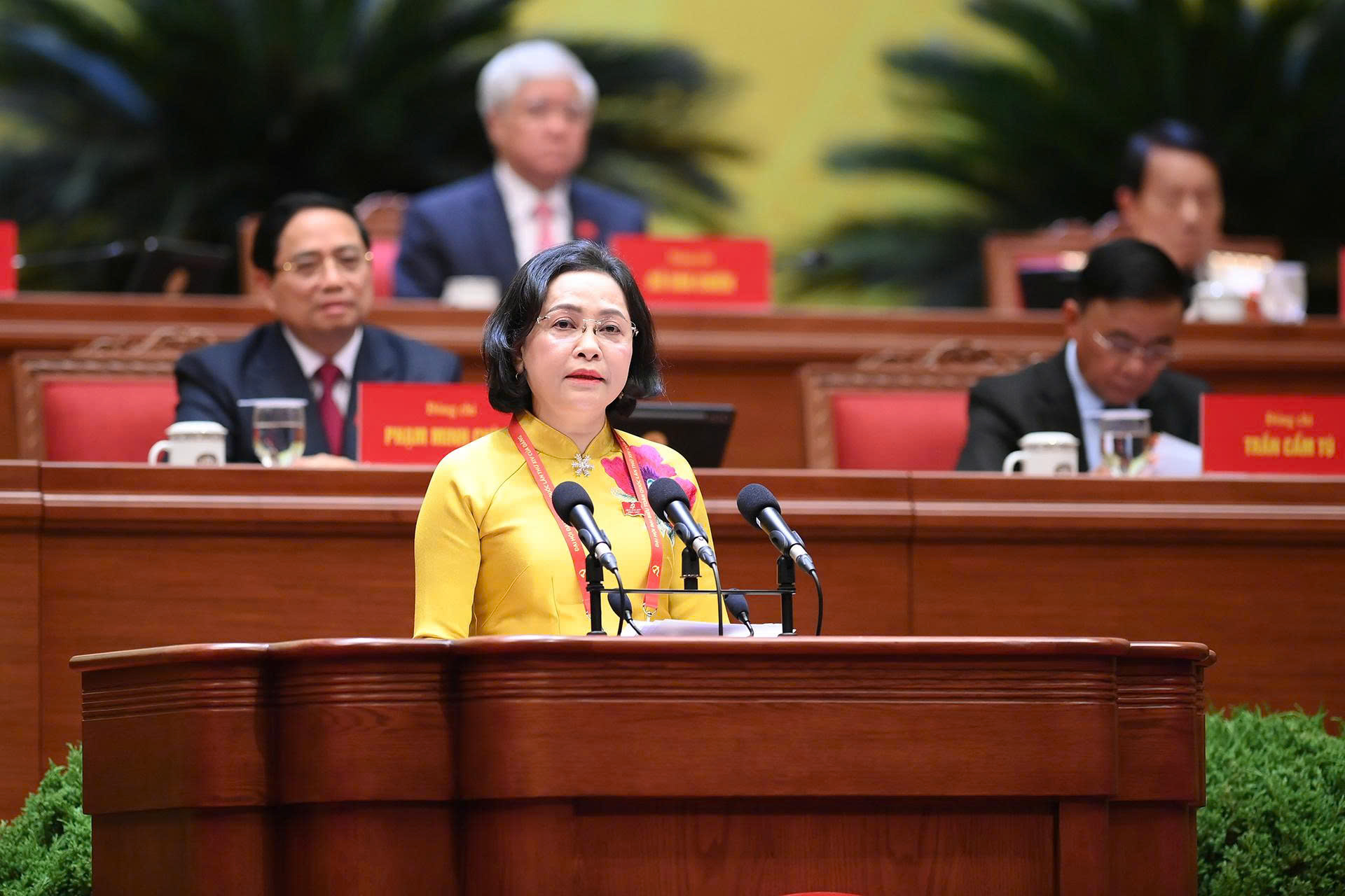 Đồng chí Hà Thị Nga, Ủy viên Trung ương Đảng, Phó Bí thư Thường trực Đảng ủy Mặt trận Tổ quốc, các đoàn thể Trung ương, Phó Chủ tịch, Tổng Thư ký Ủy ban Trung ương Mặt trận Tổ quốc Việt Nam, tham luận về vấn đề "Phát huy sức mạnh đoàn kết toàn dân tộc - nền tảng, động lực quan trọng thực hiện thắng lợi các mục tiêu phát triển đất nước trong kỷ nguyên mới". Ảnh: TTXVN.