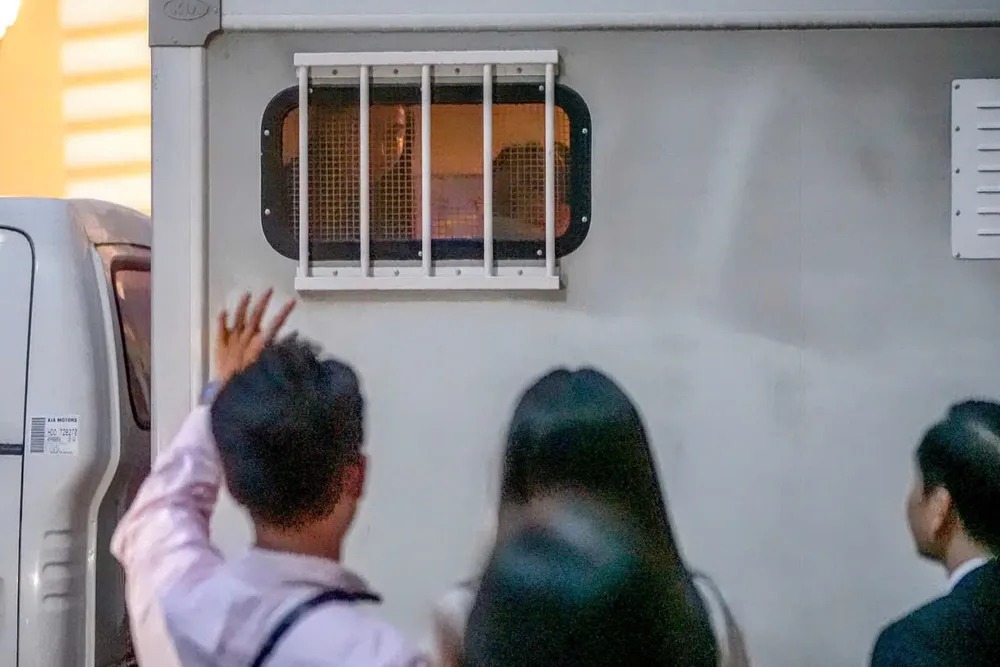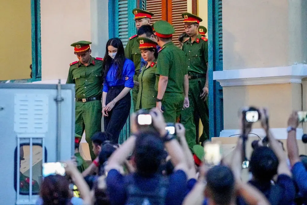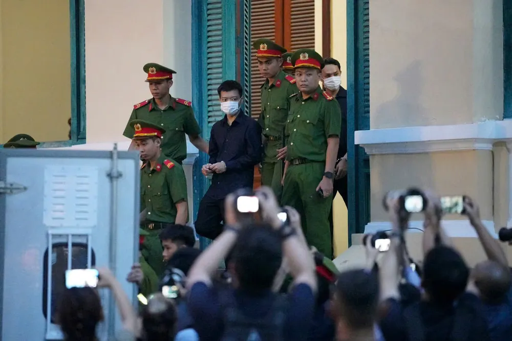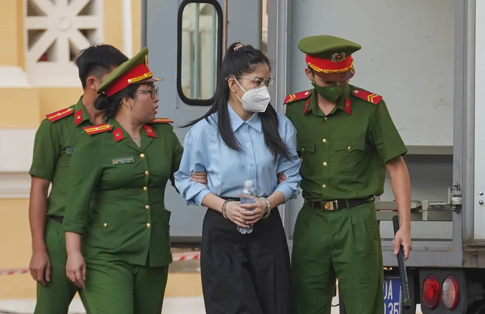 Kết thúc phiên xét xử, hoa hậu Thùy Tiên cùng các bị cáo được đưa lên xe dẫn giải rời tòa. Ảnh: PHẠM NGUYỄN