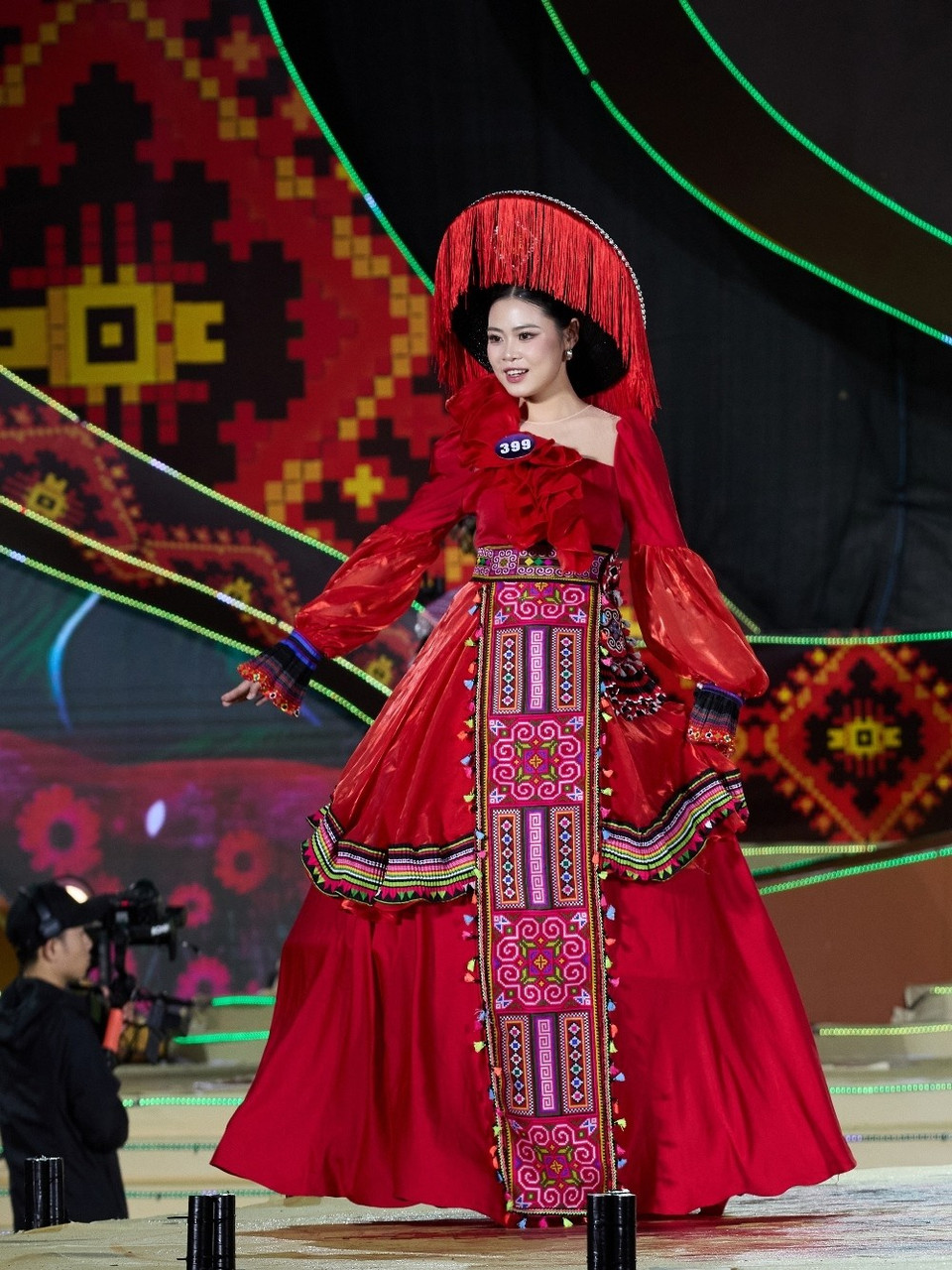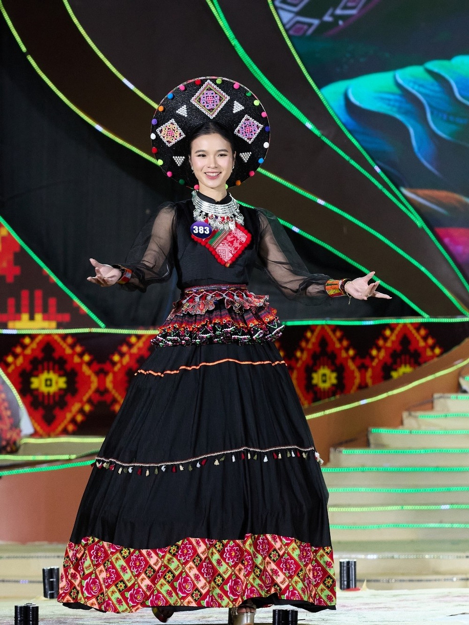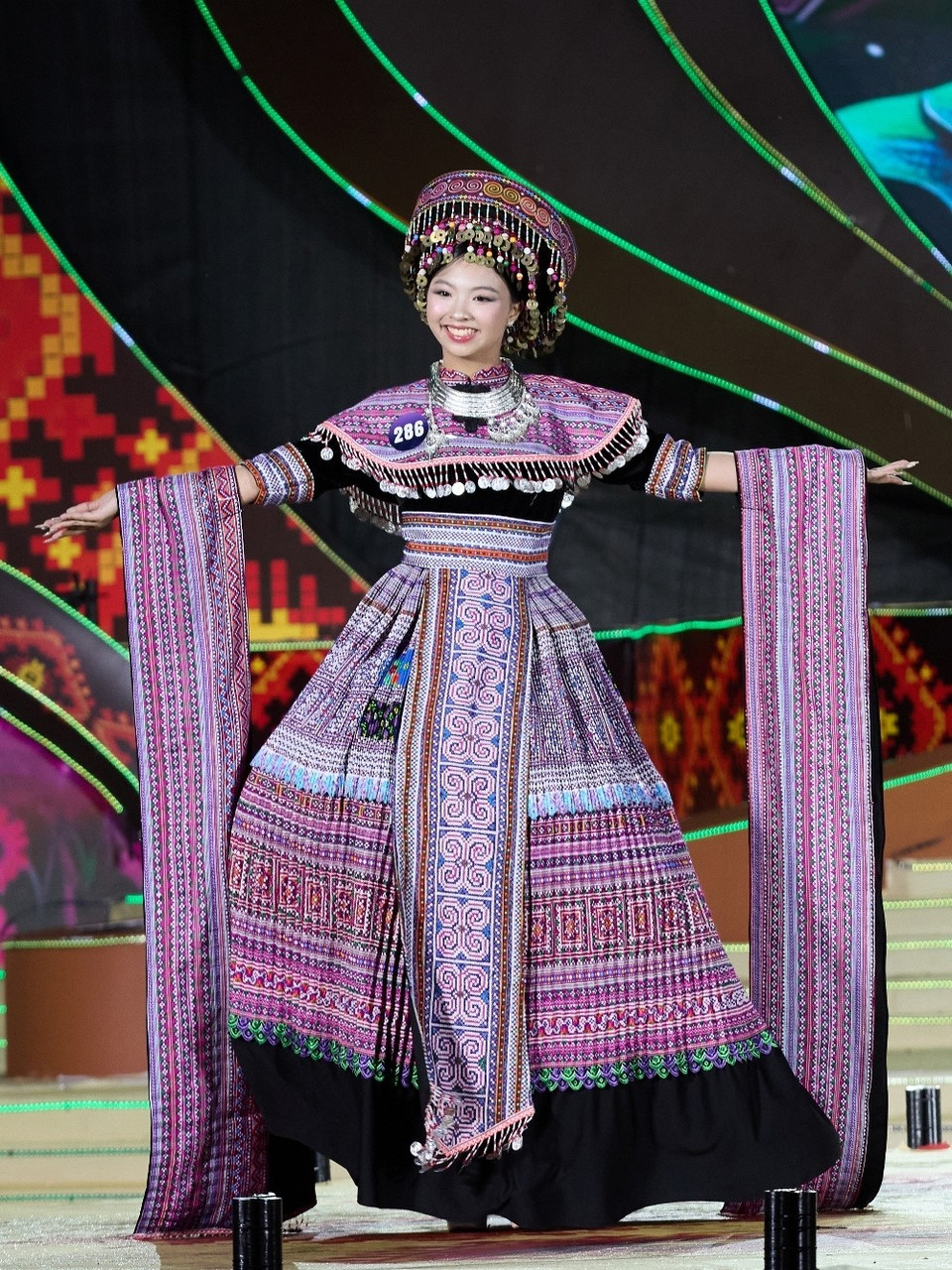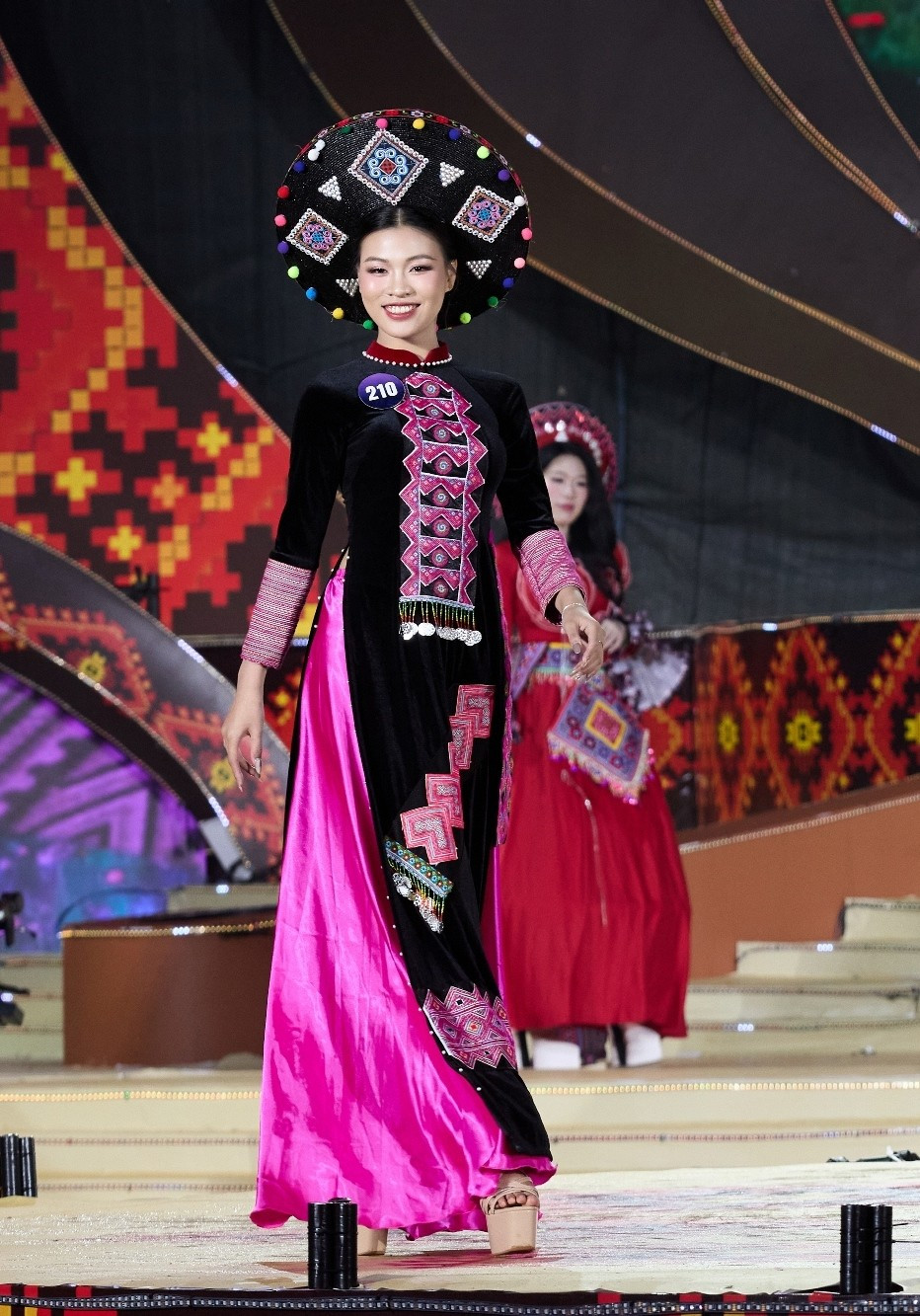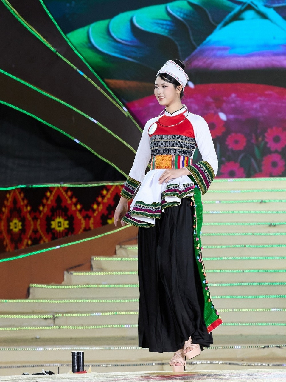 Sân khấu đêm chung kết được thiết kế hiện đại, lấy cảm hứng từ chiếc khăn Piêu, hoa ban và vẻ đẹp núi rừng Tây Bắc, kết hợp hoa văn thổ cẩm và hoa đào, với hệ thống ánh sáng chuyển động tinh tế. (Ảnh: CTV/Vietnam+)