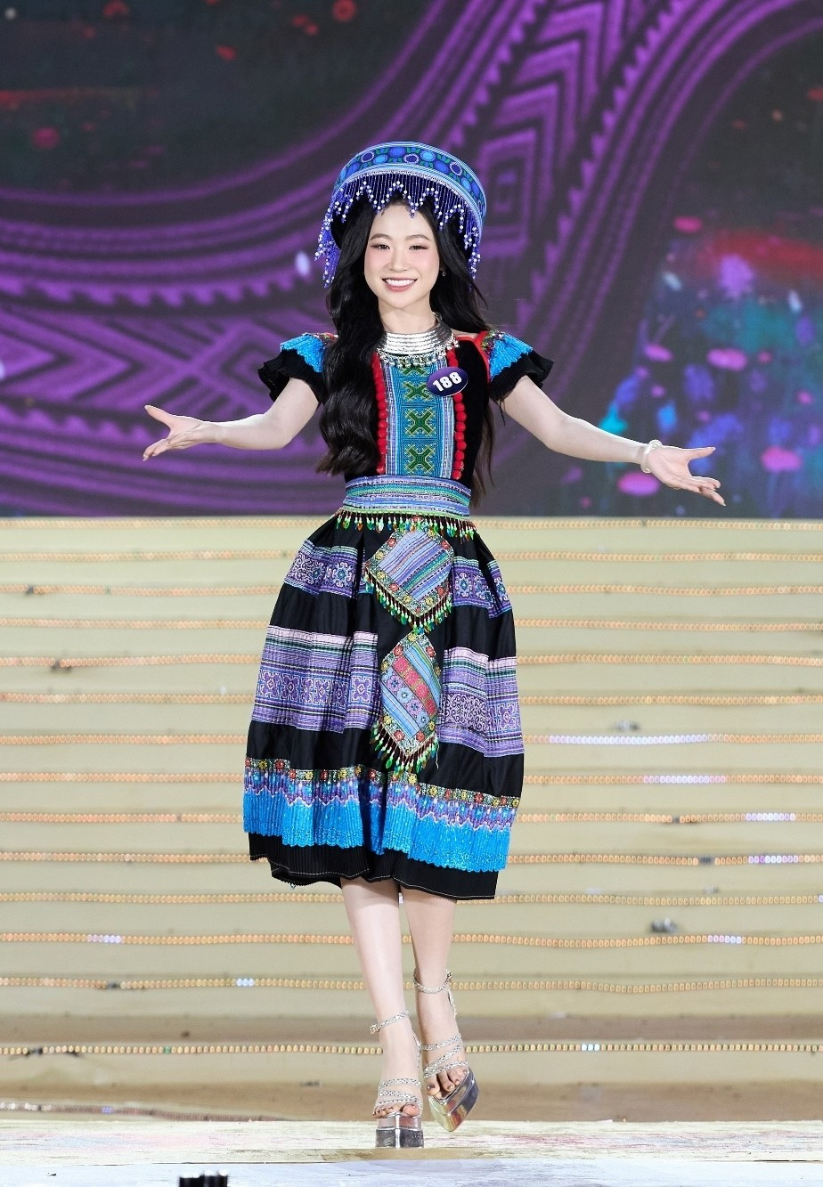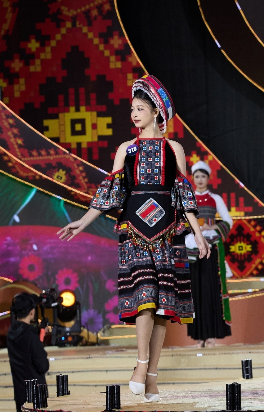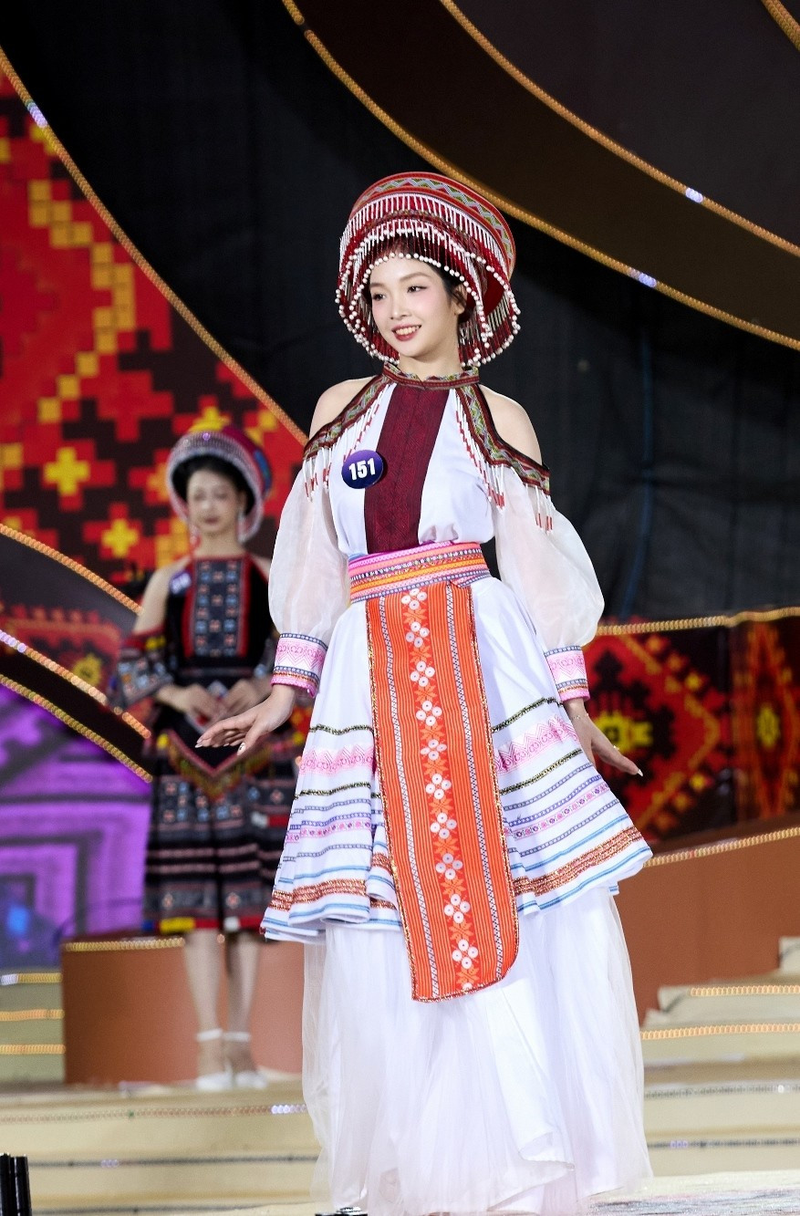 Trình diễn những bộ trang phục dạ hội nằm trong bộ sưu tập “Tinh hoa dân tộc Việt” của nhà thiết kế Triệu Lệ Quân, mỗi thí sinh kể một câu chuyện riêng, bằng chất liệu, họa tiết và màu sắc đặc trưng của thổ cẩm Tây Bắc. (Ảnh: CTV/Vietnam+)