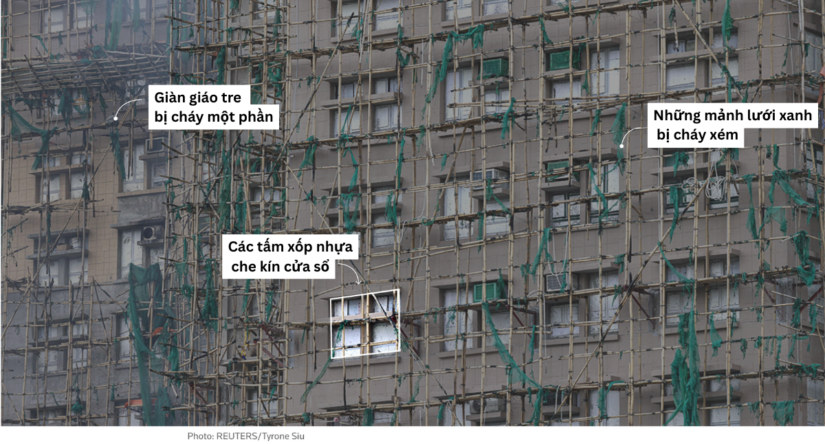 Giàn giáo tre, lưới bảo hộ che quanh tòa nhà cùng các tấm xốp nhựa che kín cửa sổ được cho là nguyên nhân khiến đám cháy lan rộng trong nhiều giờ. (Ảnh: REUTERS)