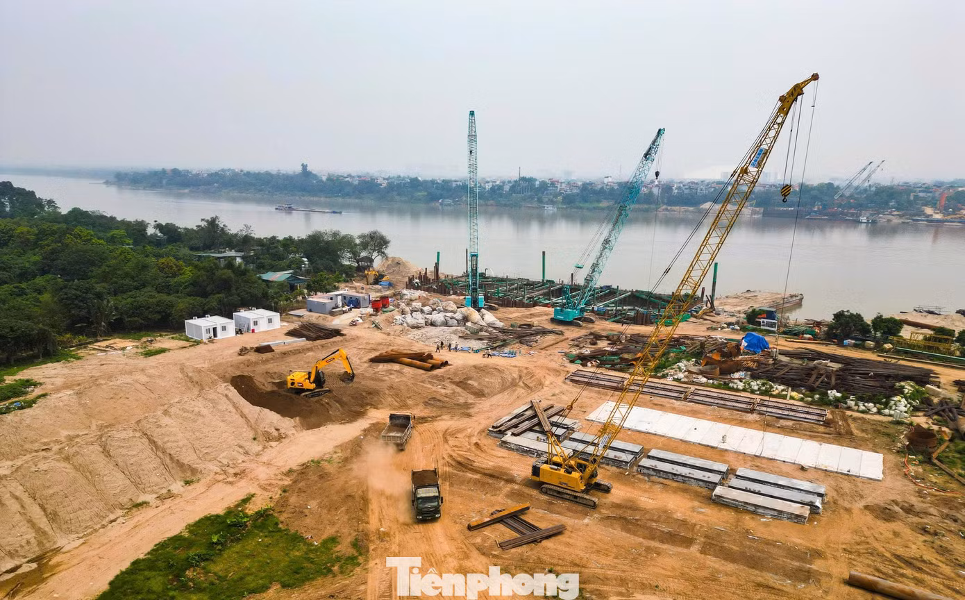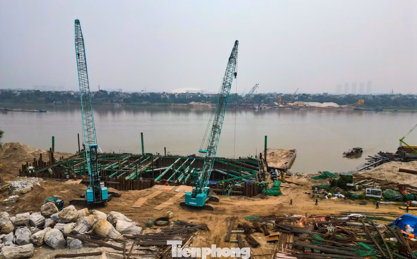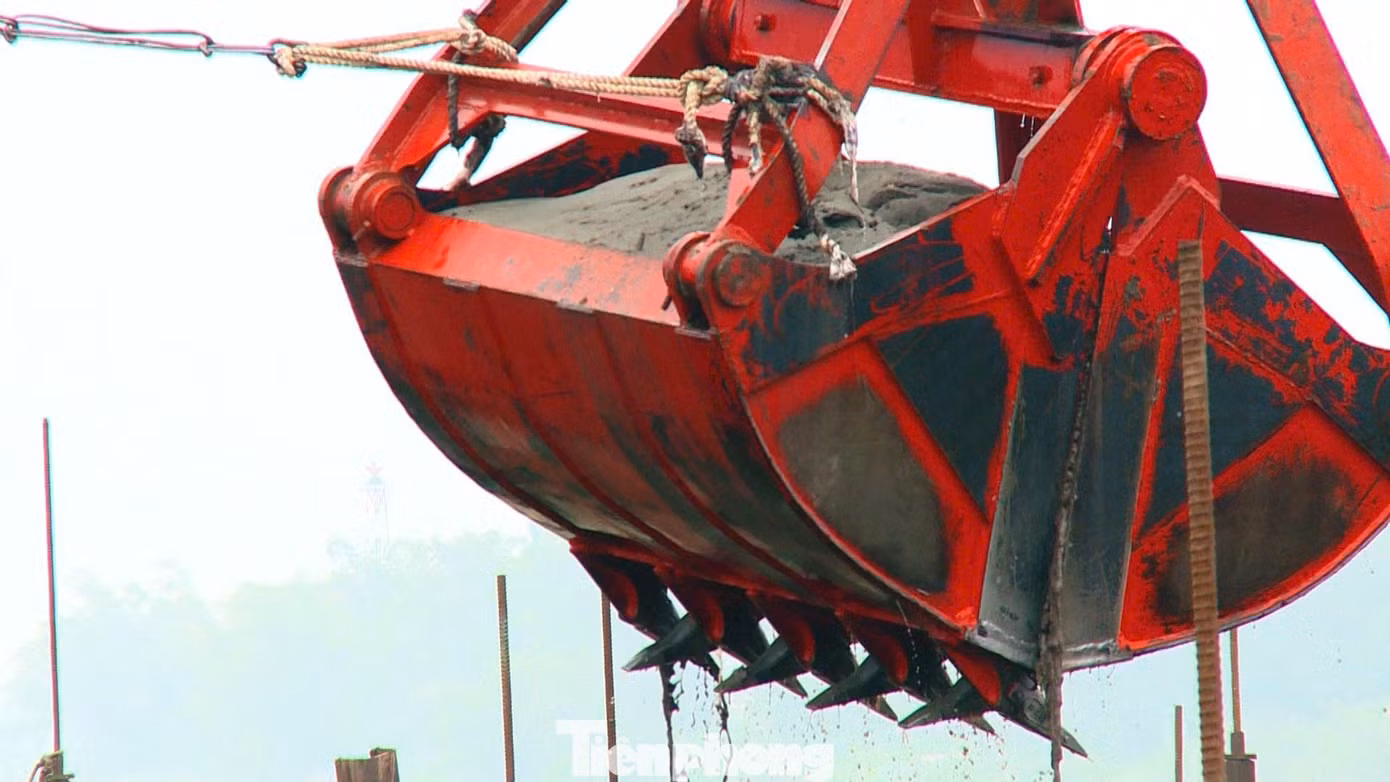 Thời gian này, hệ thống sà lan, trạm trộn và máy móc thiết bị hạng nặng được huy động tối đa ra công trường. Nhịp độ vận chuyển vật liệu như cát, đá, xi măng diễn ra liên tục trên mặt sông để phục vụ thi công.