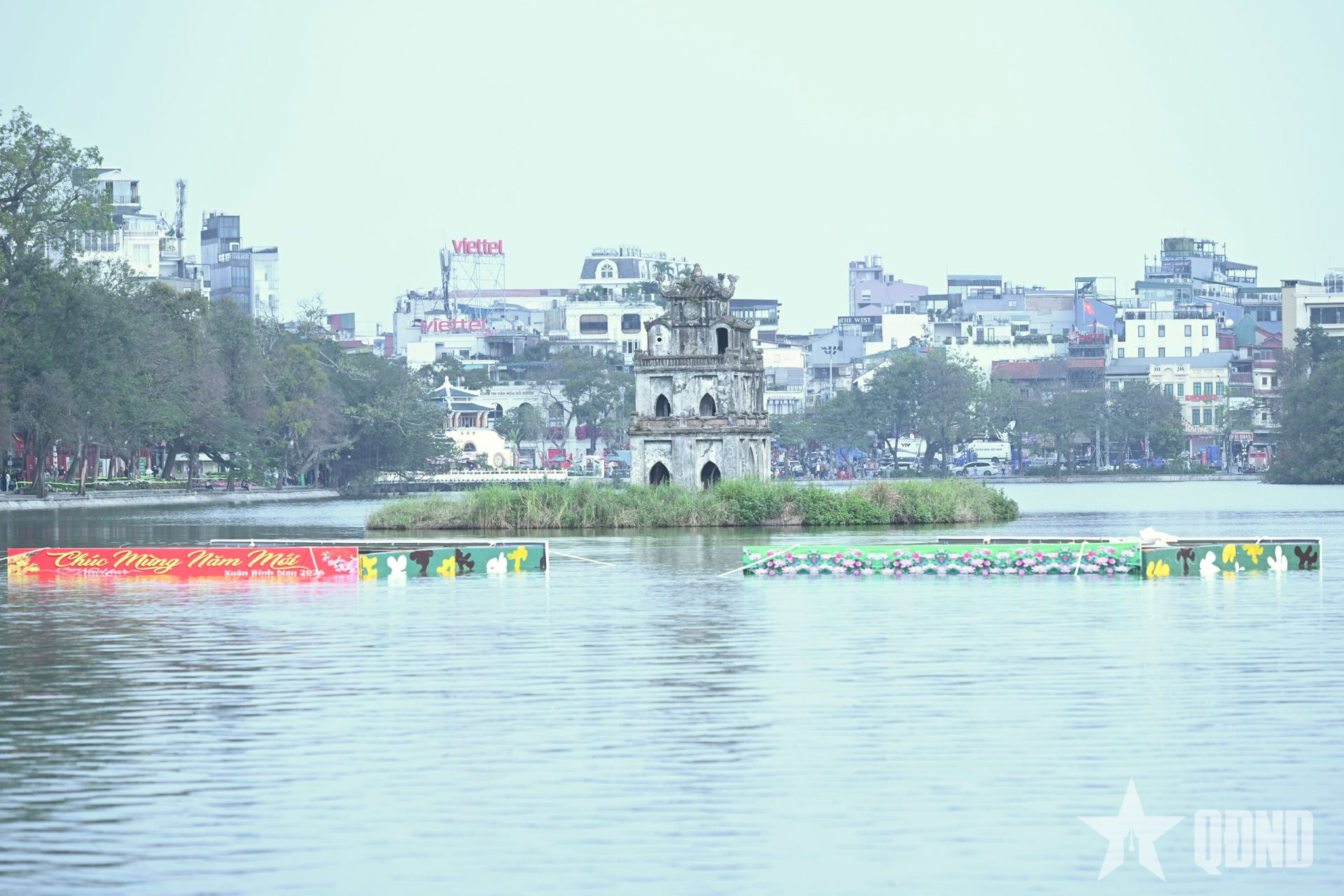 Các giàn phóng pháo hoa nổi trên mặt hồ Hoàn Kiếm.