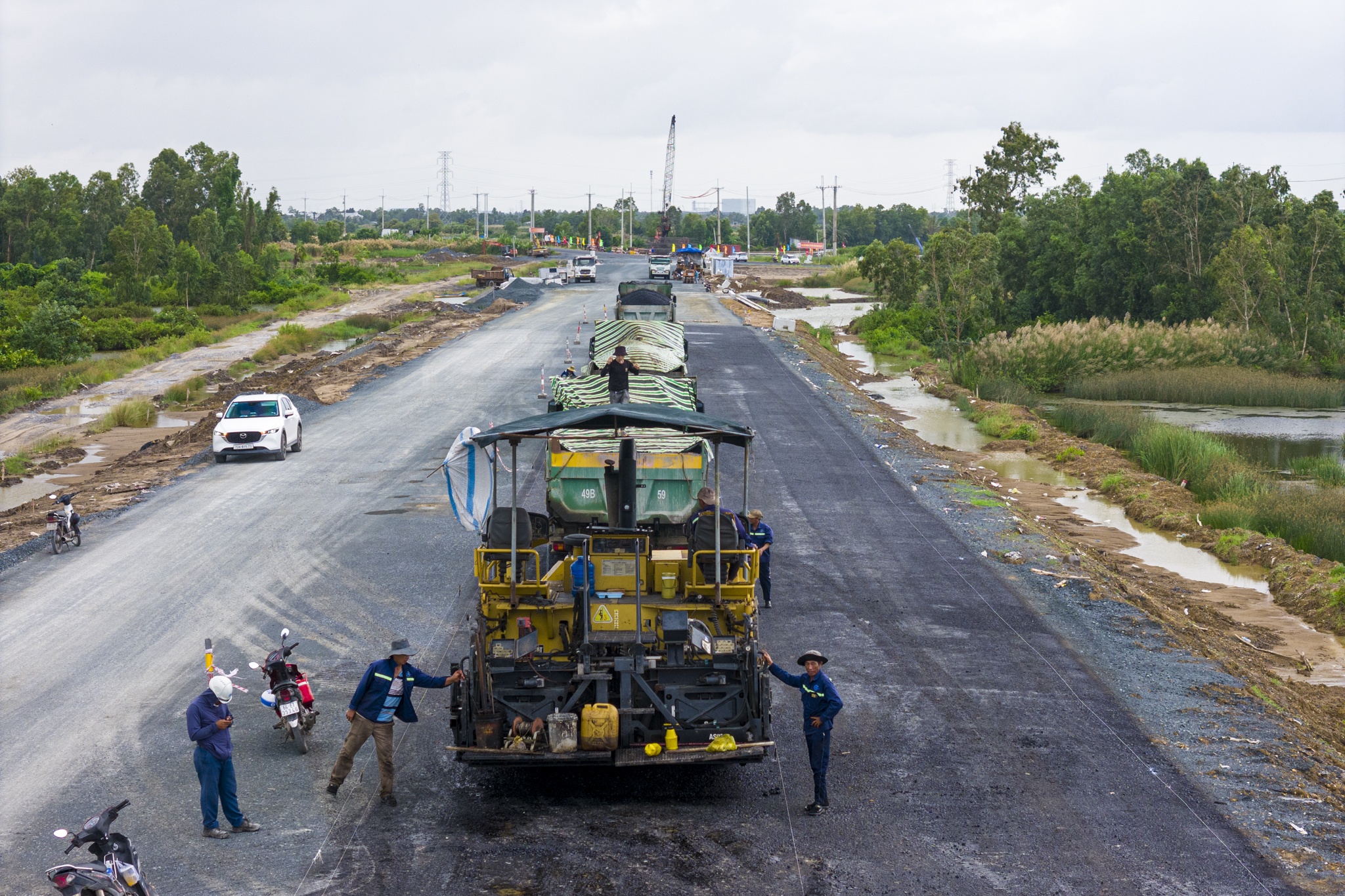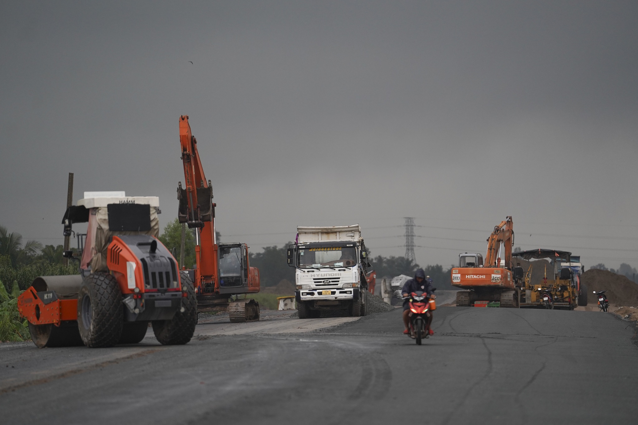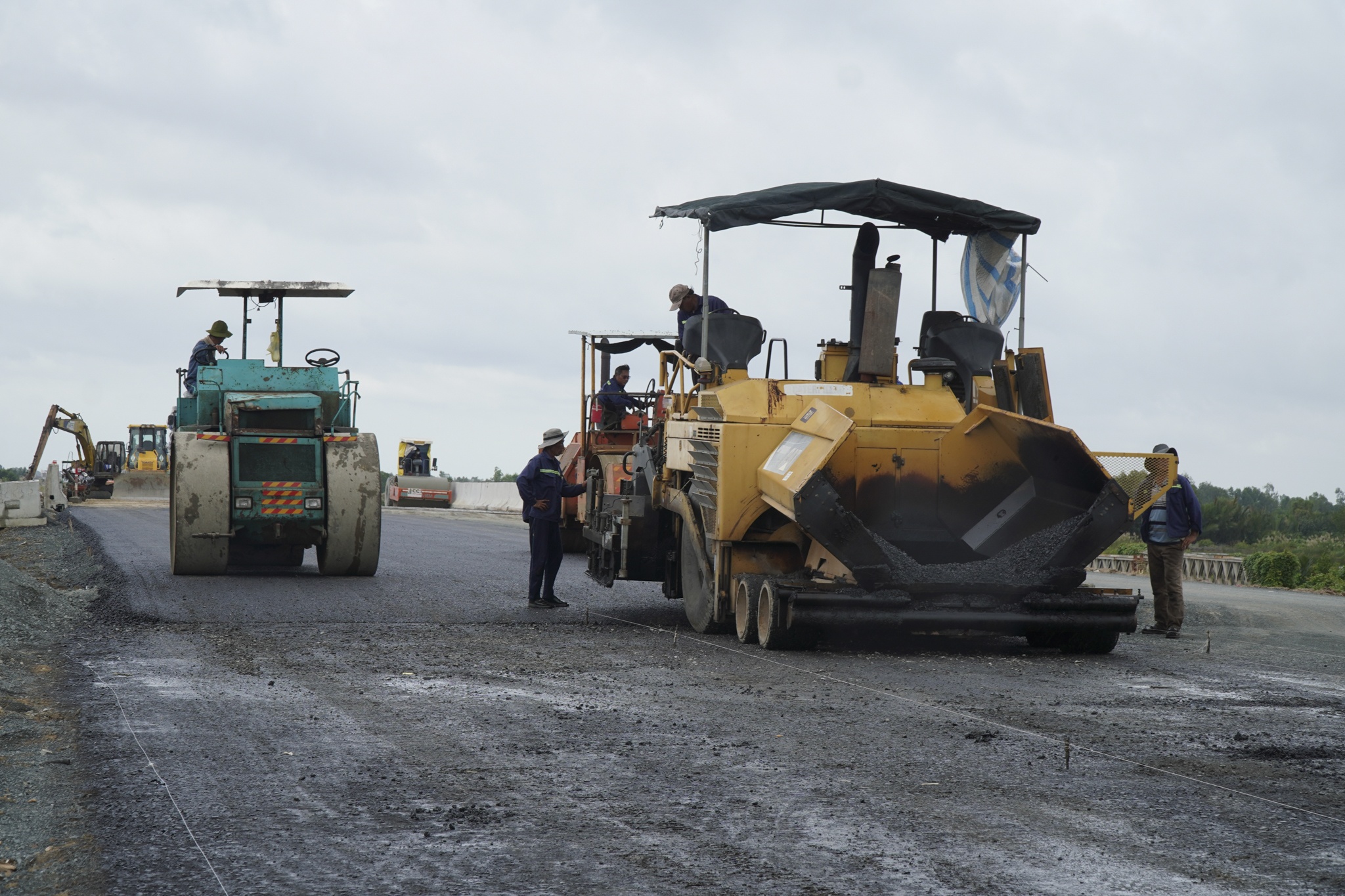 Tại điểm cuối của dự án đoạn qua xã Hồ Thị Kỷ, tỉnh Cà Mau, hàng trăm máy móc và công nhân khẩn trương tranh thủ thảm nhựa nền đường khi thời tiết bắt đầu hửng nắng.