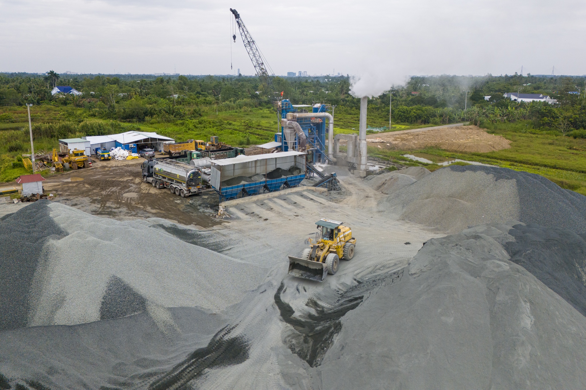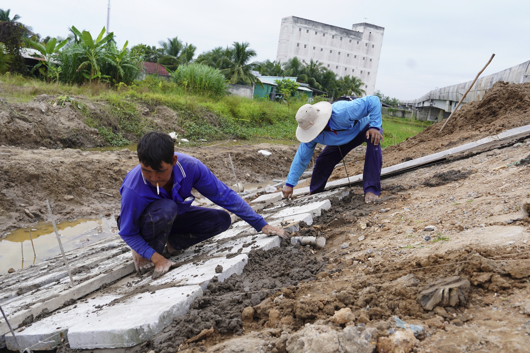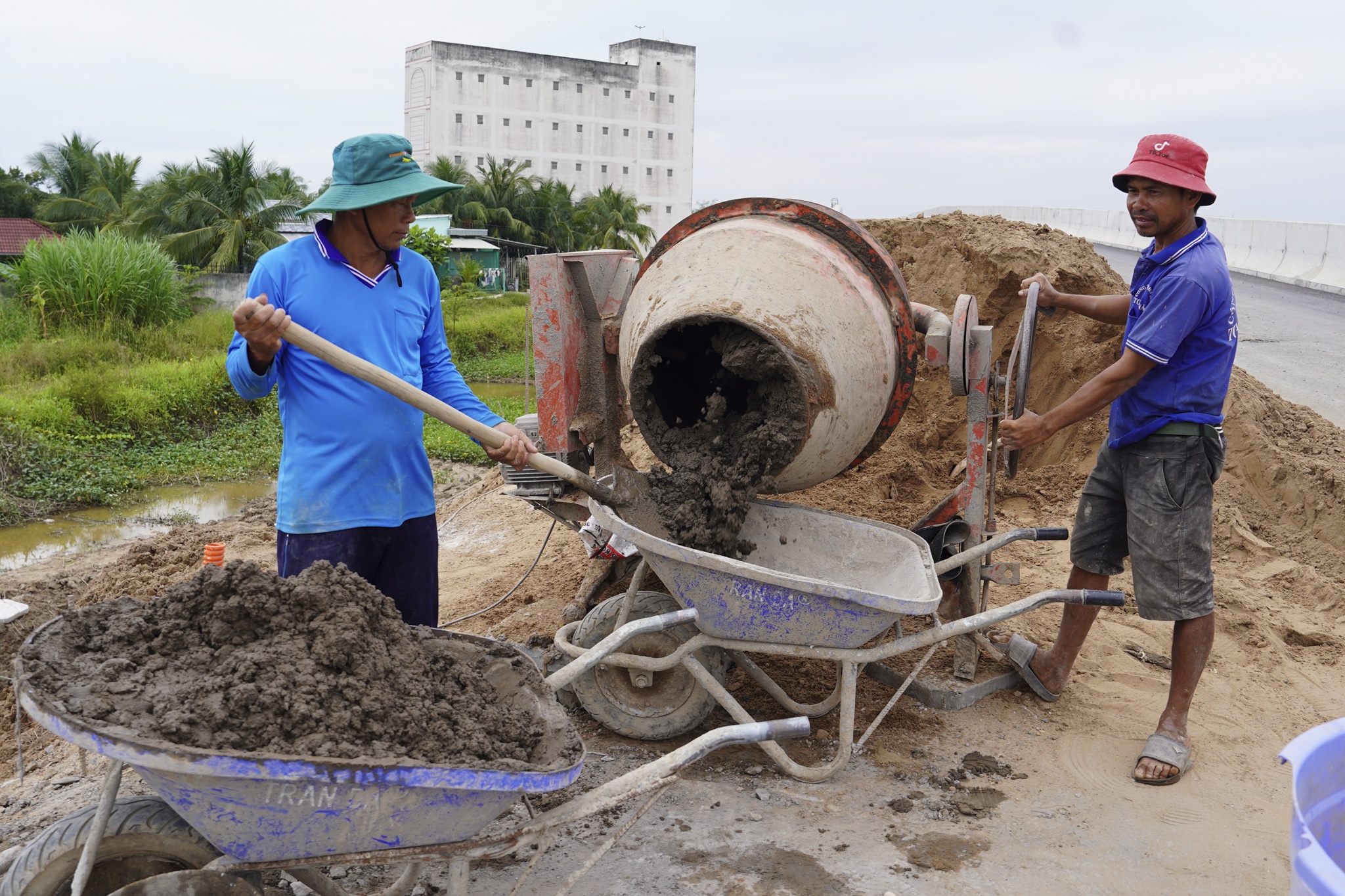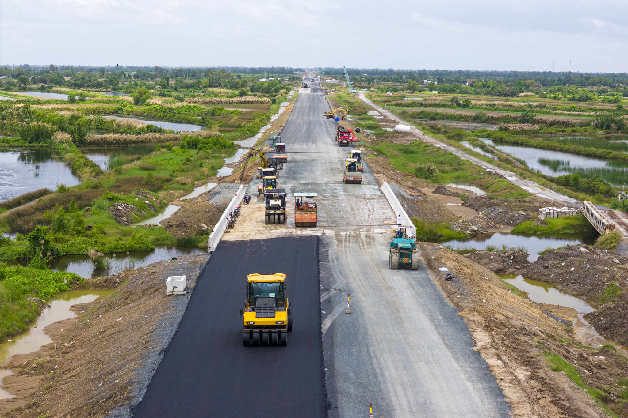 Tại điểm cuối của dự án đoạn qua xã Hồ Thị Kỷ, tỉnh Cà Mau, hàng trăm máy móc và công nhân khẩn trương tranh thủ thảm nhựa nền đường khi thời tiết bắt đầu hửng nắng.