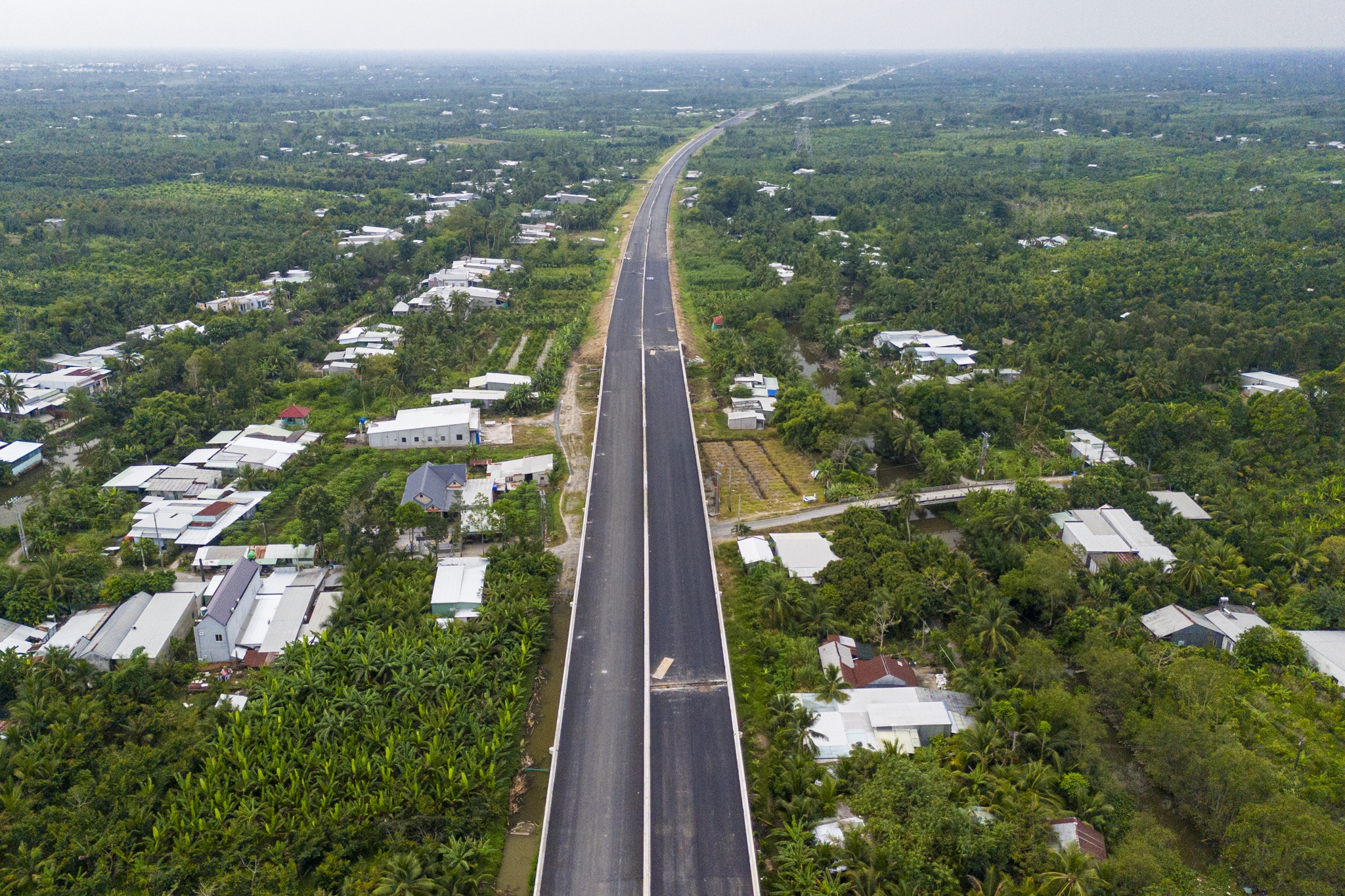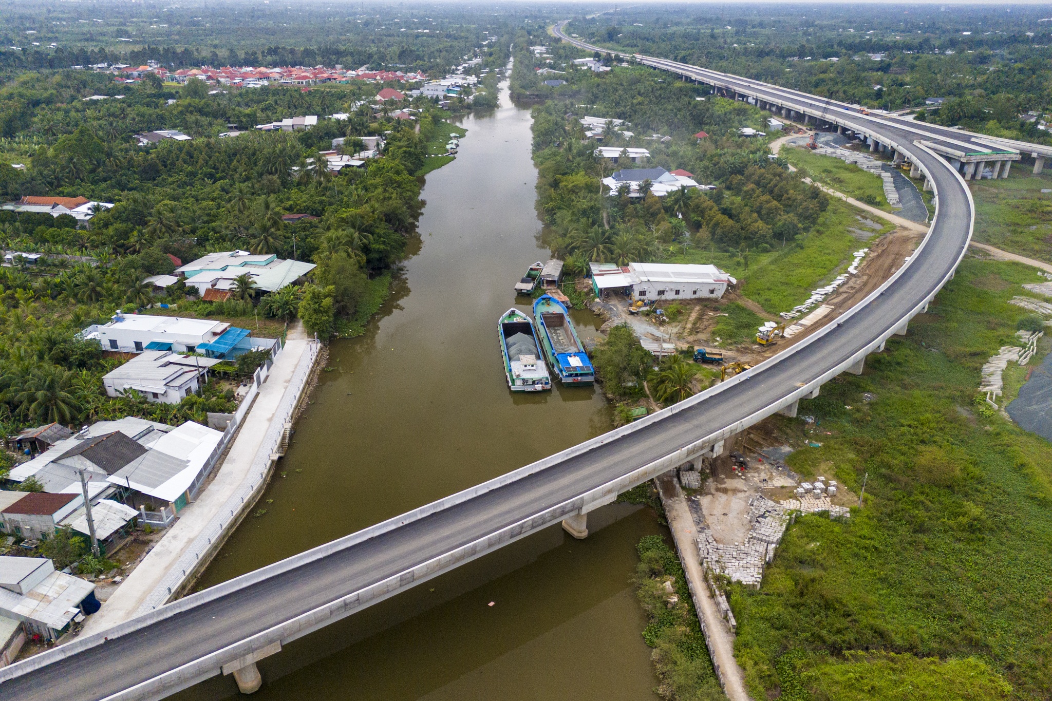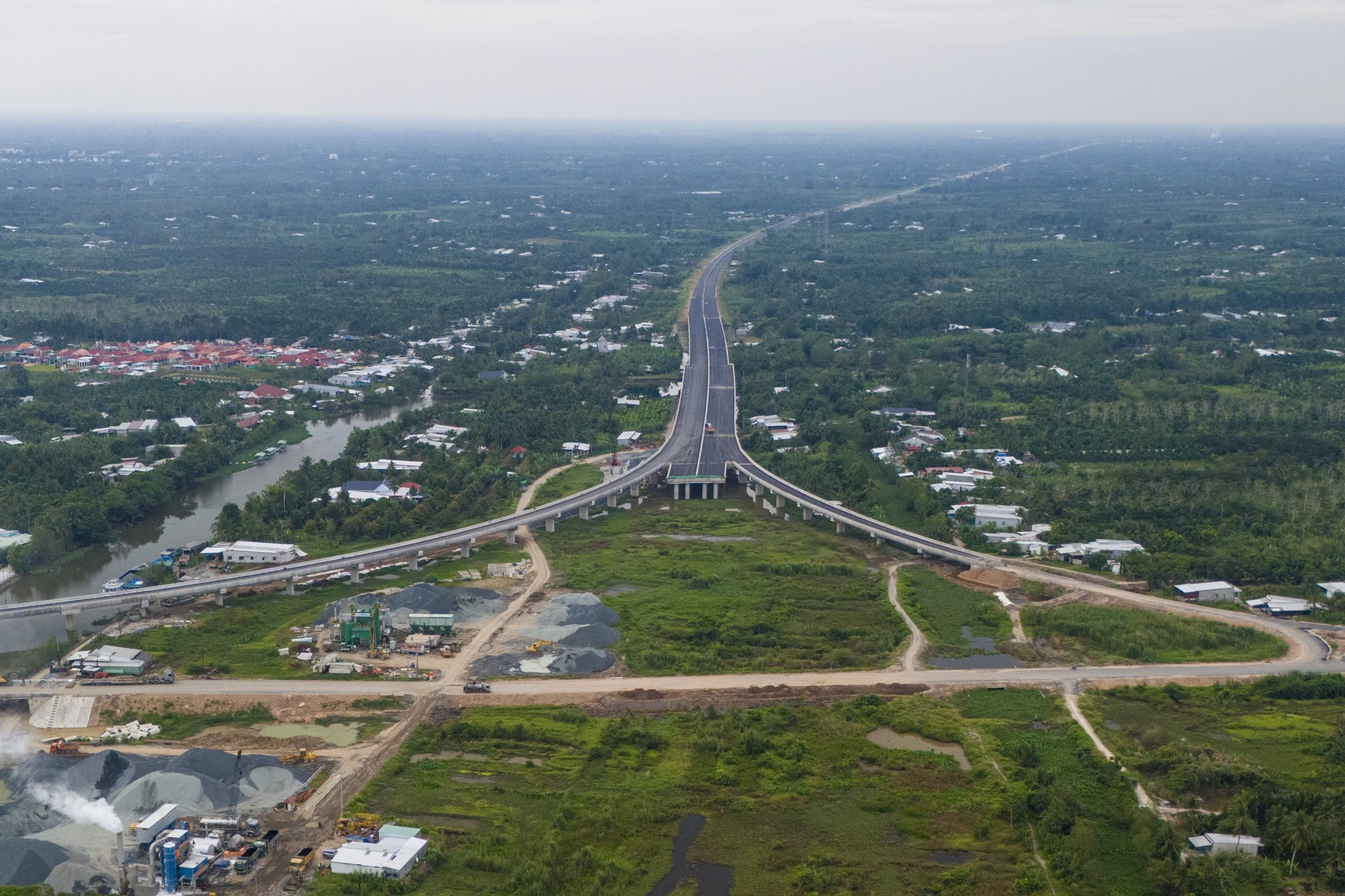 Toàn cảnh gần 7 km tuyến cao tốc Cần Thơ - Cà Mau đoạn từ điểm đầu đến Quốc lộ 1 nhìn từ trên cao.