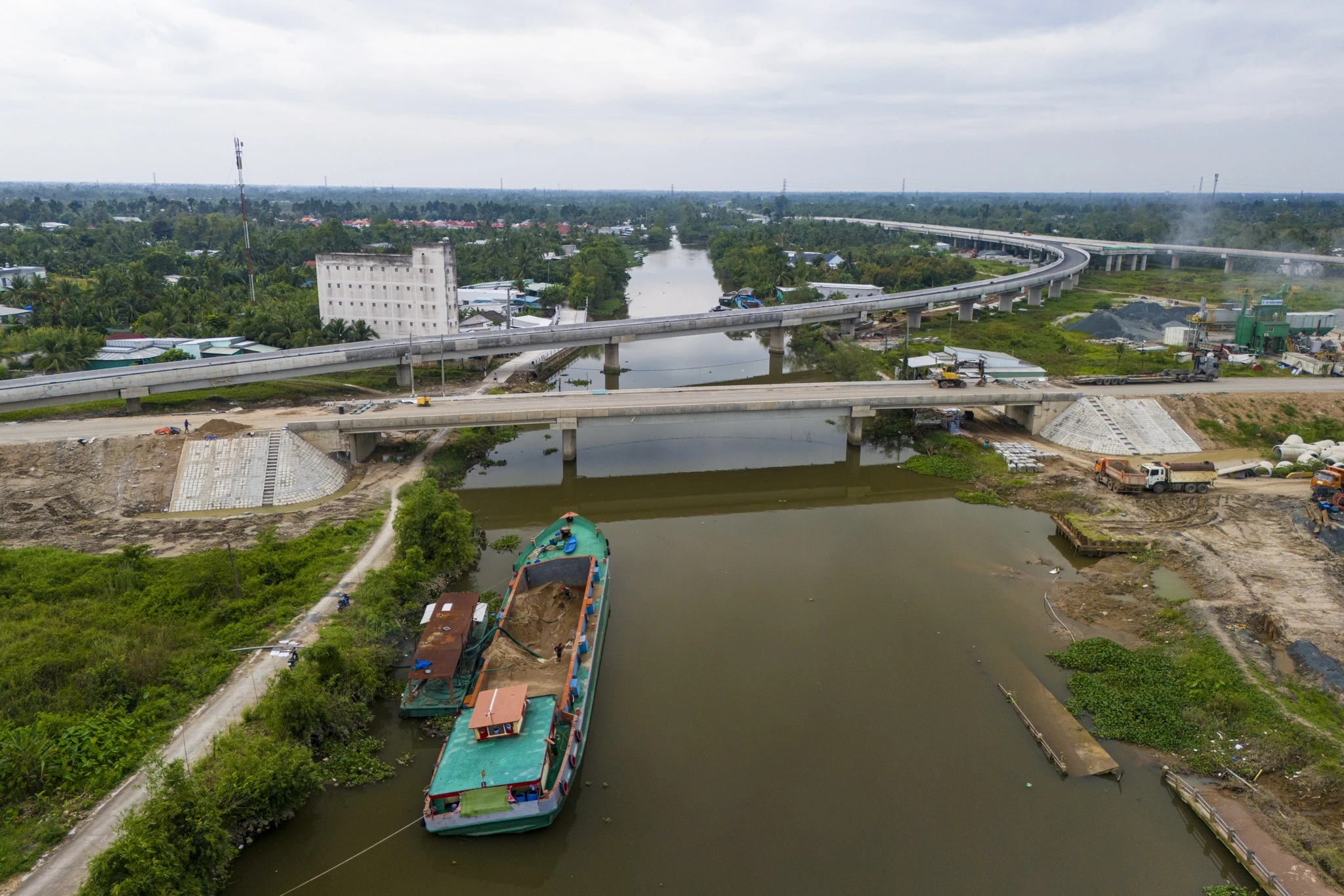 Tuyến cao tốc Cần Thơ - Cà Mau với tổng mức đầu tư khoảng 27.523 tỷ đồng được chia thành 2 dự án thành phần: Cần Thơ - Hậu Giang dài hơn 37 km và Hậu Giang - Cà Mau dài hơn 73 km. Dự án khởi công vào tháng 1/2023 và dự kiến hoàn thành cuối năm nay. Trong ảnh là nút giao IC2 đã hoàn thành cơ bản các hạng mục chính. Đây là điểm đầu của cao tốc Cần Thơ - Cà Mau thuộc địa phận thành phố Cần Thơ.