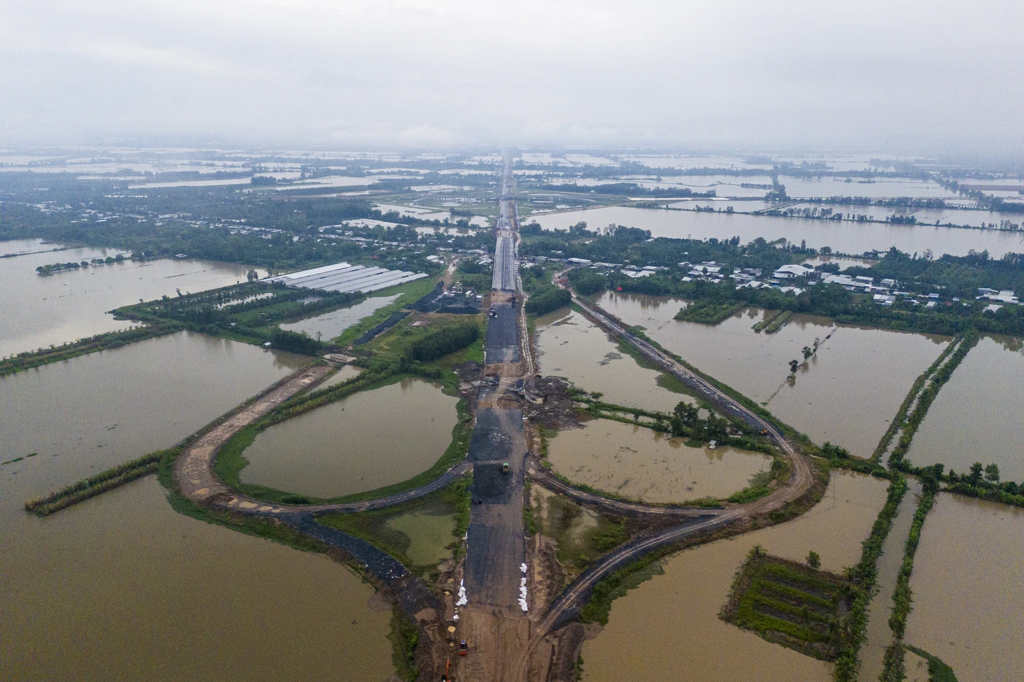 Riêng đoạn ưu tiên thông tuyến đạt khoảng 84,8%, các hạng mục chính như xử lý nền đất yếu, đắp nền, thi công cầu, cống và thảm bê tông nhựa đều ghi nhận tiến độ rõ rệt.