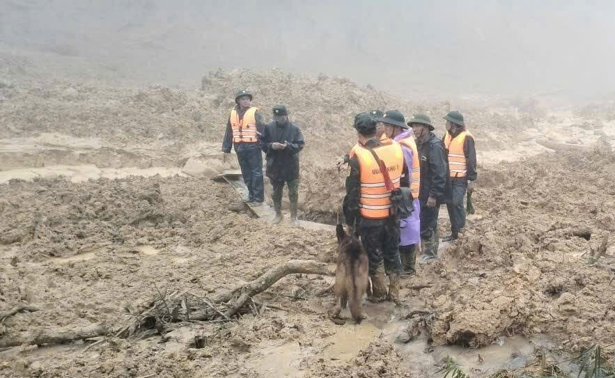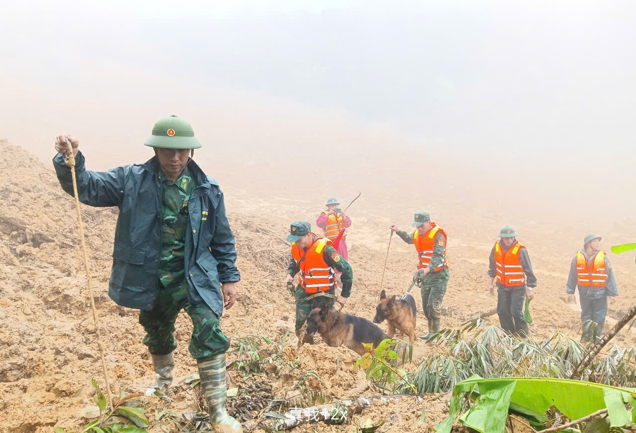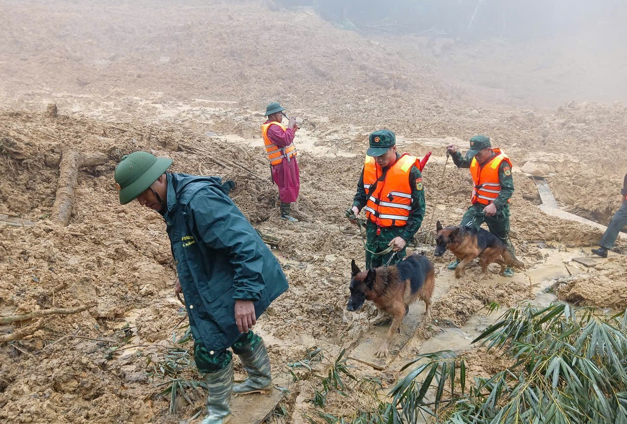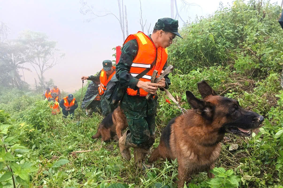 Chó nghiệp vụ được sử dụng để tìm kiếm các nạn nhân nghi bị vùi lấp dưới lớp đất đá, bùn nhão - nơi các phương tiện cơ giới khó tiếp cận. (Ảnh: B.P)