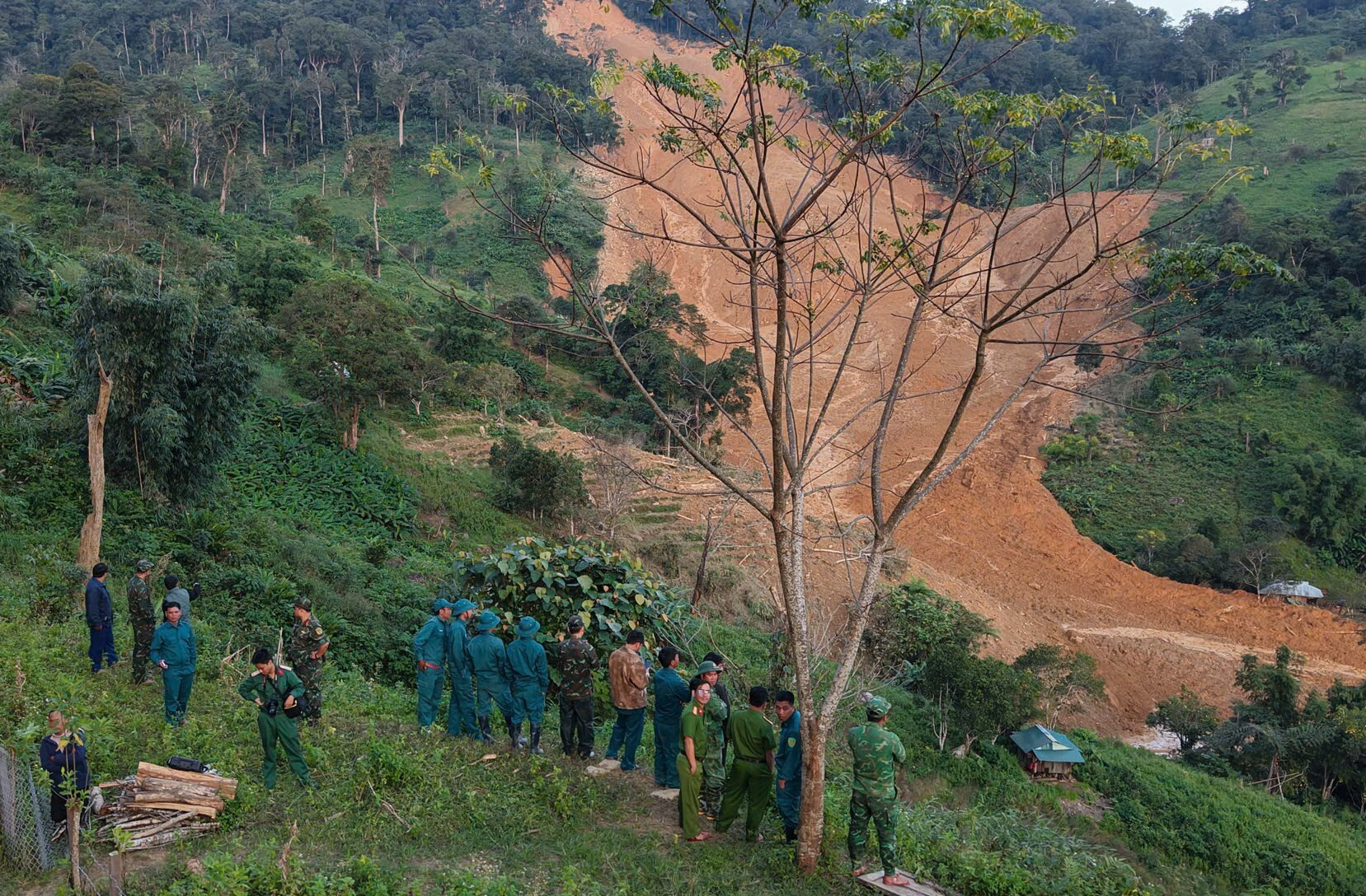 Trước tình hình thời tiết xấu, trưa 16/11, lực lượng chức năng phải tạm dừng việc tìm kiếm 3 nạn nhân mất tích trong vụ sạt lở núi kinh hoàng. (Ảnh: B.P)
