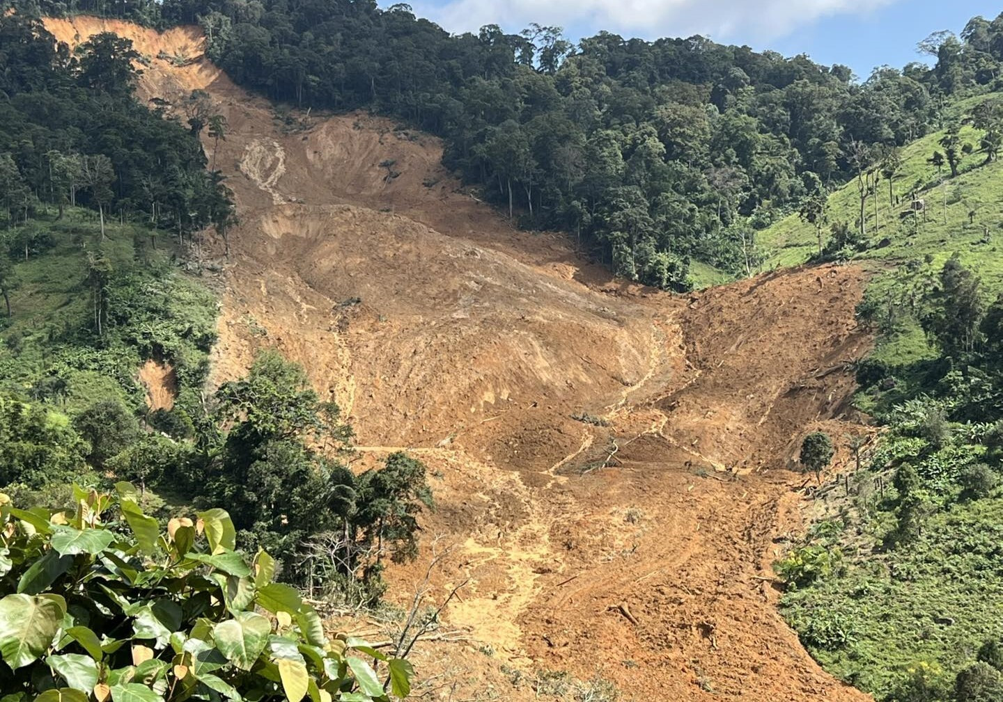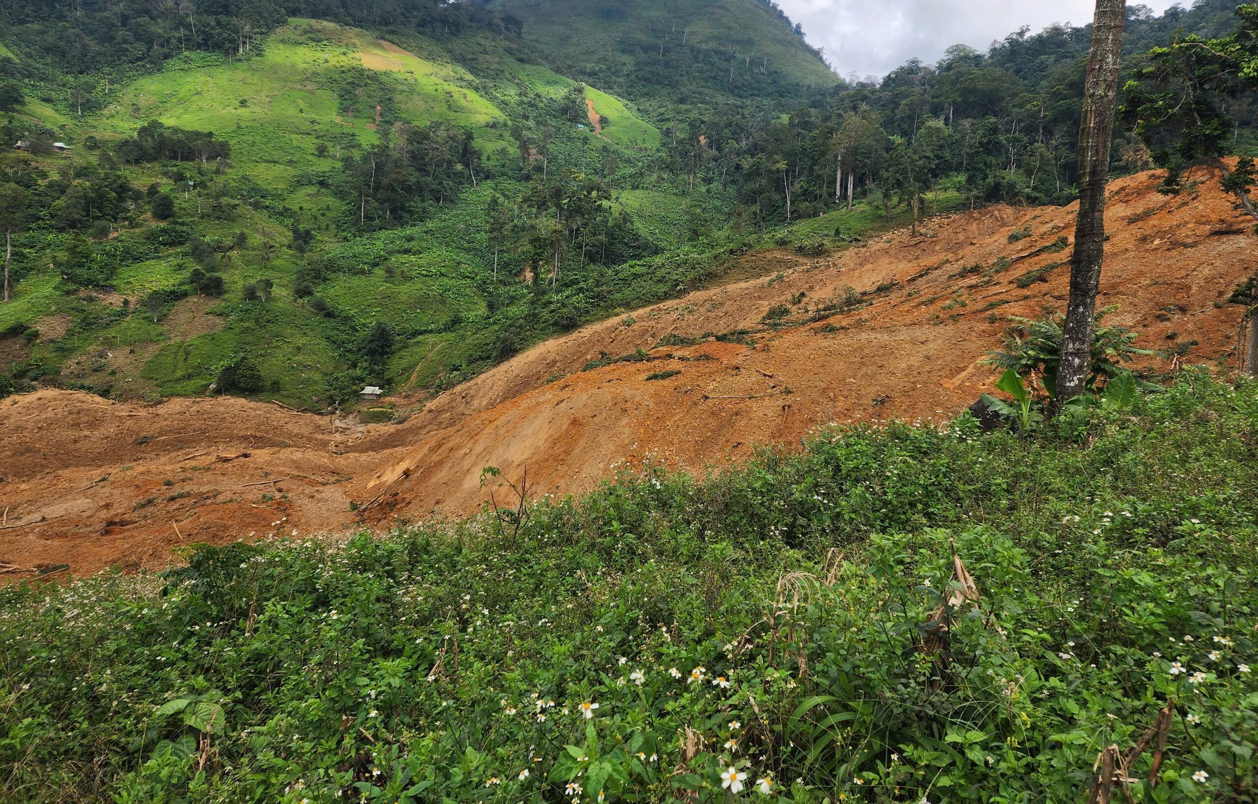 Thời điểm xảy ra sạt lở, trời nắng ráo. Khu vực bị sạt lở rộng lớn, kéo dài hơn 1km. Ước tính, cả triệu m³ đất, đá từ quả đồi trên cao đổ ập xuống. (Ảnh: B.P)