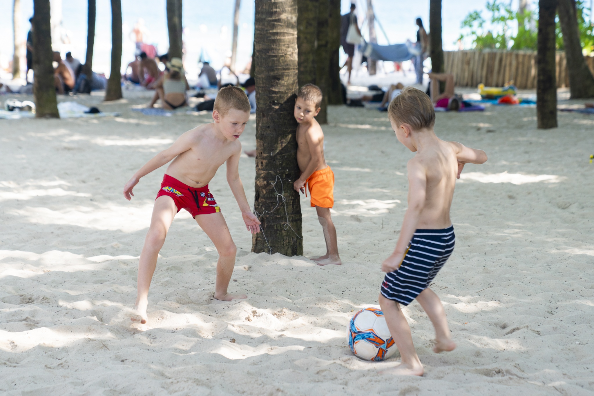 Trong khi bố mẹ thong thả phơi nắng trên ghế dài, lũ trẻ nhanh chóng kết bạn, rủ nhau đá bóng và nghịch cát dọc bờ biển.