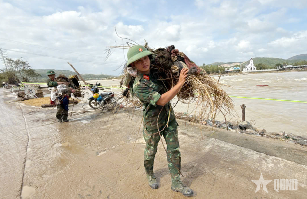 Bộ đội chung tay làm sạch các tuyến đường nơi tâm lũ. Ảnh: SƠN BÌNH