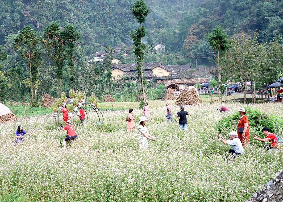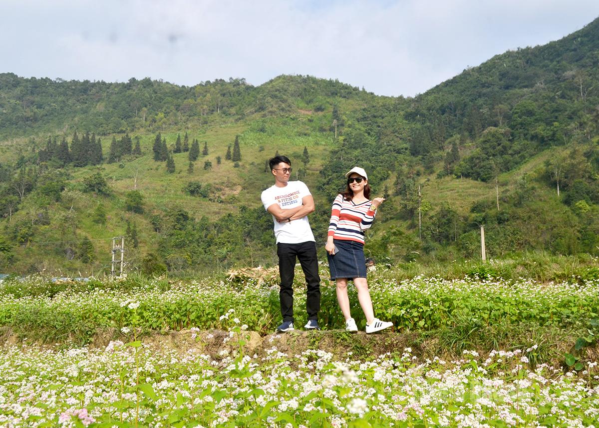 Du khách thích thú bên những cánh đồng hoa Tam giác mạch.