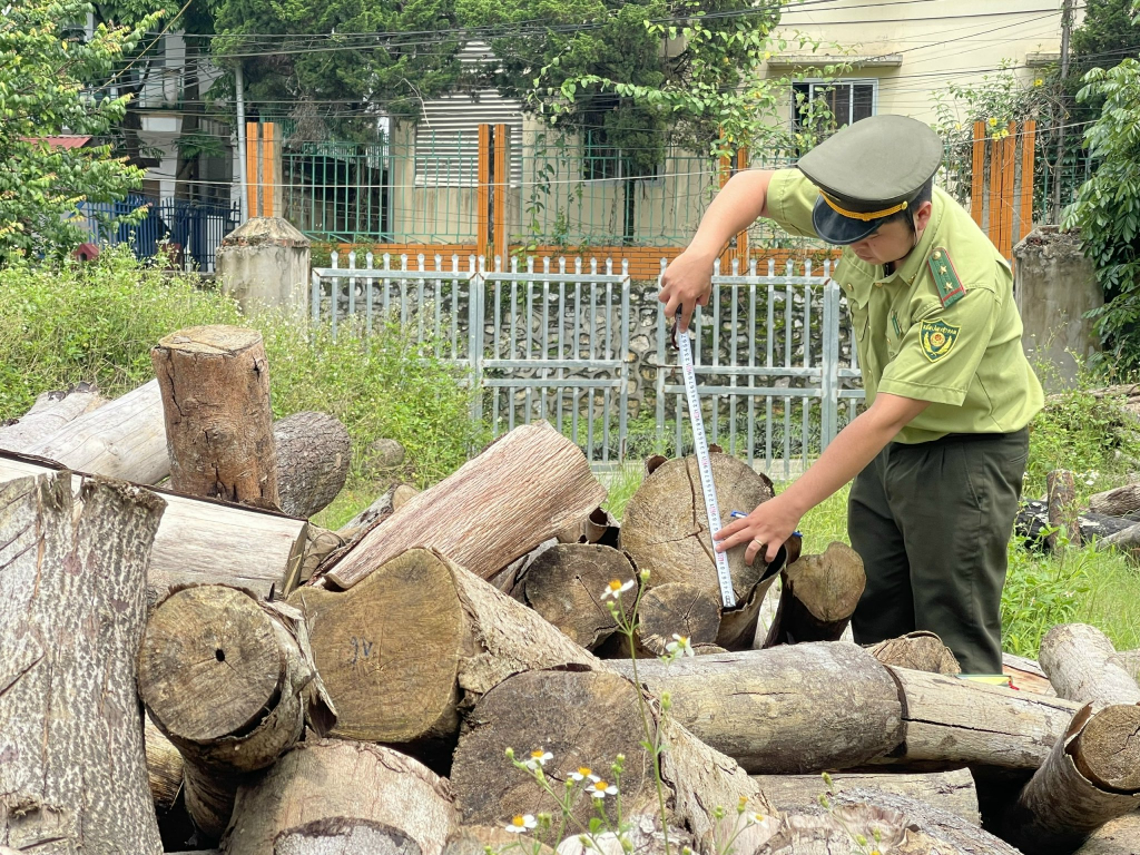 Cán bộ Chi cục Kiểm lâm kiểm tra tang vật gỗ vận chuyển lâm sản trái phép.