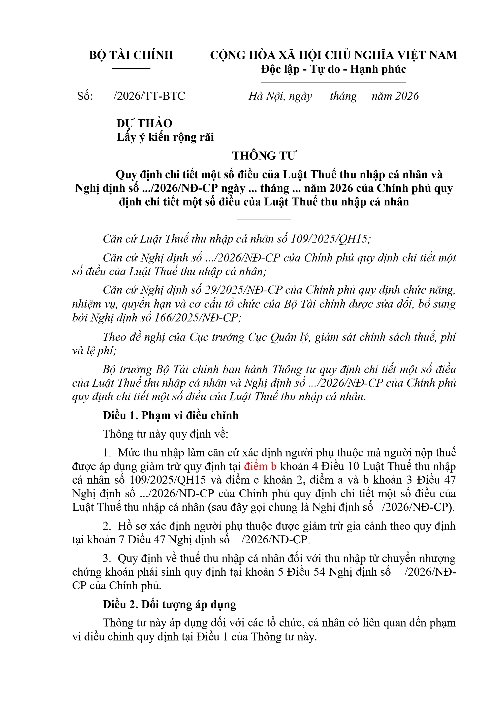TOÀN VĂN: Dự thảo Thông tư Quy định chi tiết một số điều của Luật Thuế thu nhập cá nhân và Nghị định số .../2026/NĐ-CP ngày ... tháng ... năm 2026 của Chính phủ quy định chi tiết một số điều của Luật Thuế thu nhập cá nhân./.