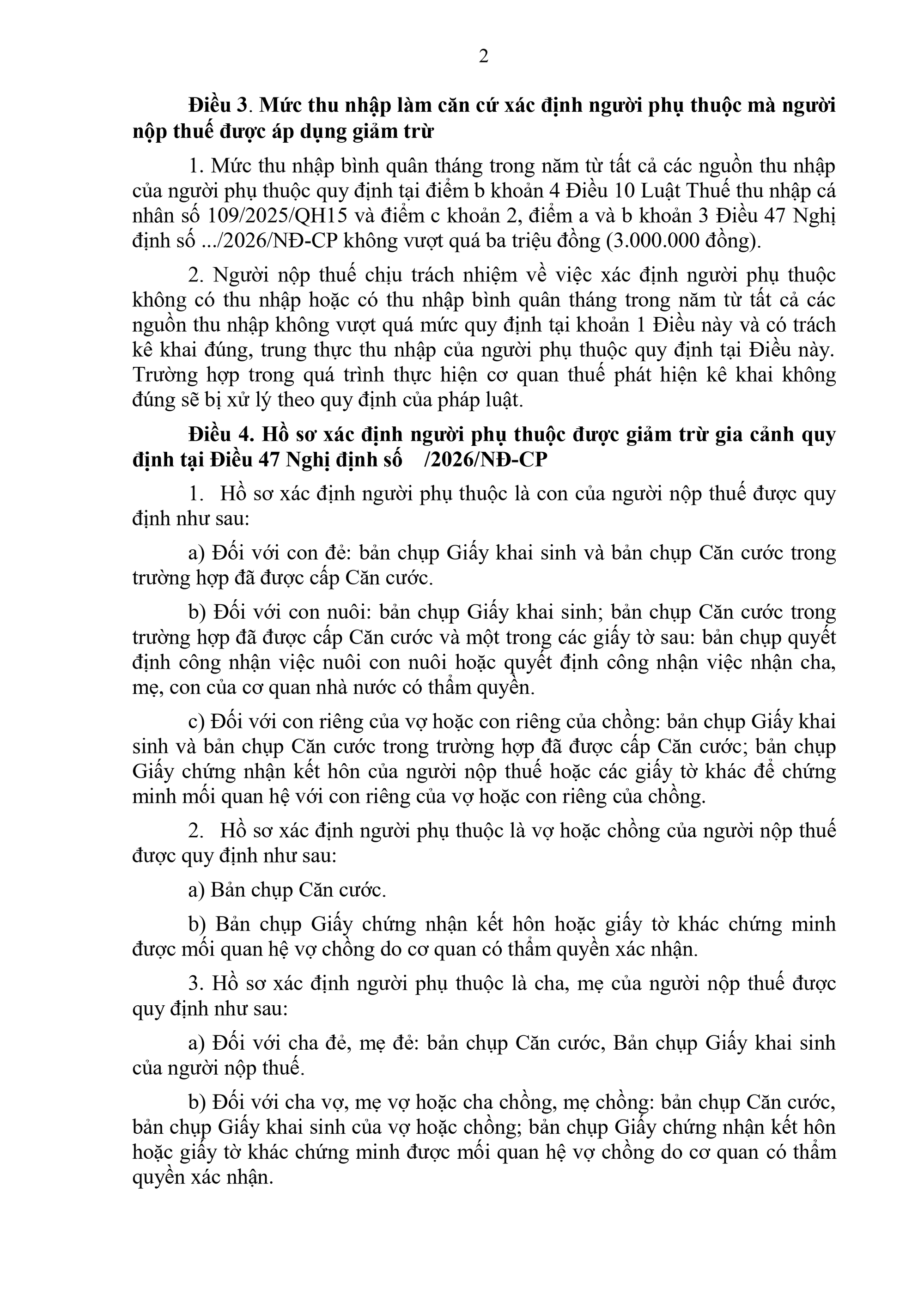 1. Mức thu nhập bình quân tháng trong năm từ tất cả các nguồn thu nhập của người phụ thuộc quy định tại điểm b khoản 4 Điều 10 Luật Thuế thu nhập cá nhân số 109/2025/QH15 và điểm c khoản 2, điểm a và b khoản 3 Điều 47 Nghị định số .../2026/NĐ-CP không vượt quá ba triệu đồng (3.000.000 đồng).