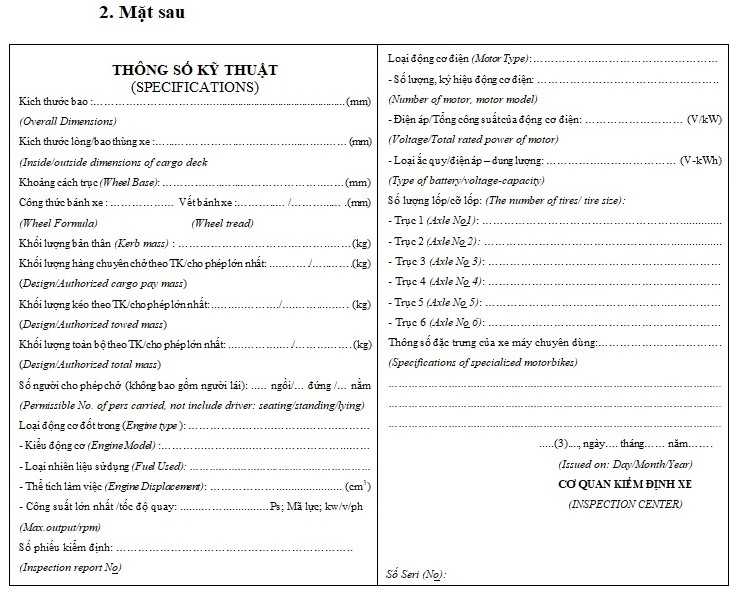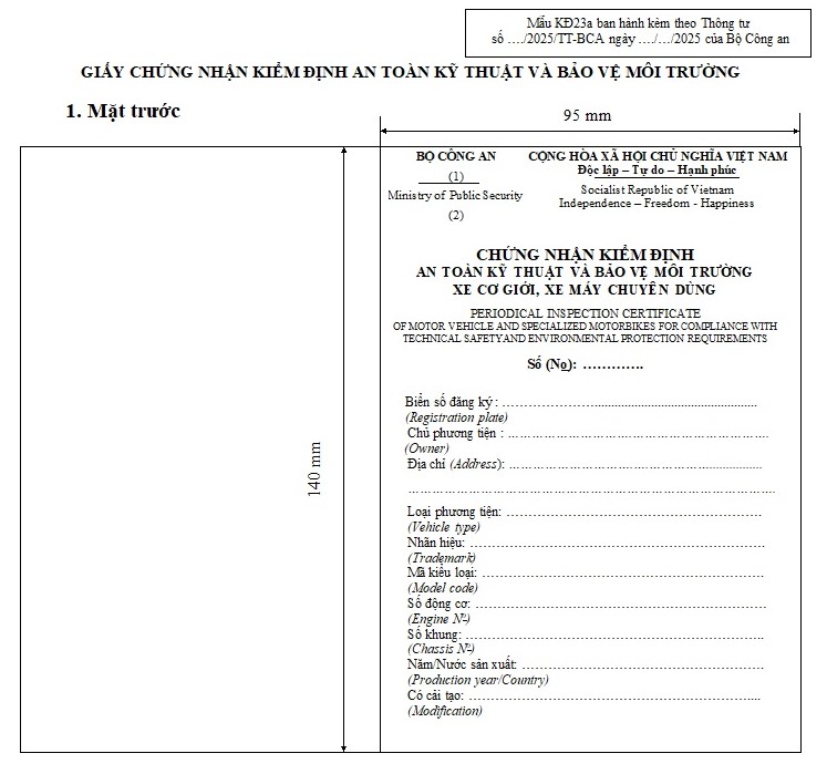 Ban hành kèm theo Thông tư là Biểu mẫu: Giấy chứng nhận kiểm định an toàn kỹ thuật và bảo vệ môi trường xe cơ giới, xe máy chuyên dùng (mẫu KĐ23a).
