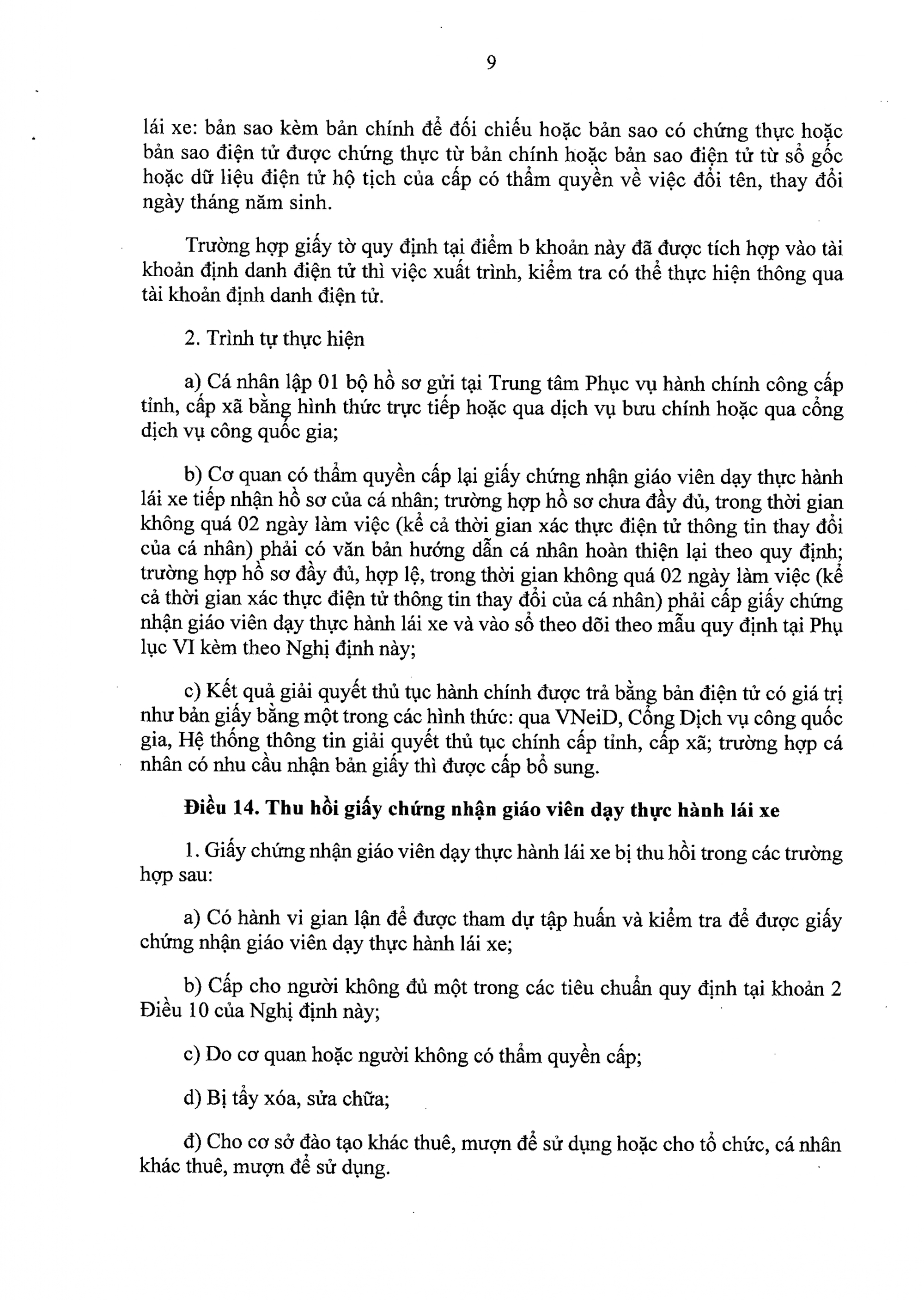 Trong thời hạn không quá 02 ngày làm việc kể từ ngày kết thúc chương trình tập huấn, cơ sở đào tạo có văn bản đề nghị kiểm tra cấp giấy chứng nhận giảng viên dạy thực hành lái xe theo mẫu quy định tại Phụ lục V kèm theo Nghị định này và hồ sơ của cá nhân tham dự tập huấn quy định tại khoản 1 Điều này gửi Trung tâm Phục vụ hành chính công cấp tỉnh, cấp xã bằng hình thức trực tiếp hoặc qua dịch vụ bưu chính hoặc qua cổng dịch vụ công quốc gia.