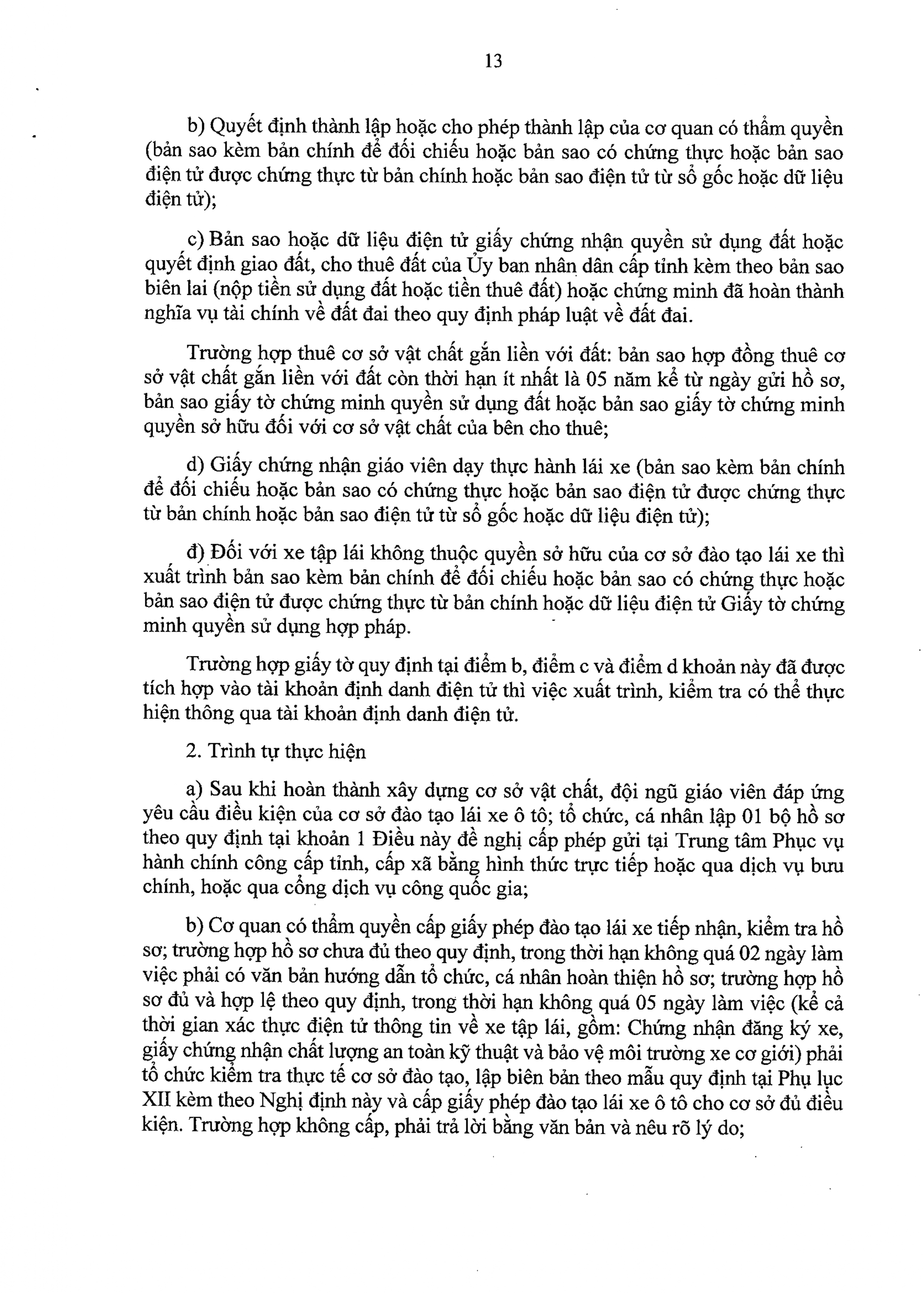 Cơ quan có thẩm quyền cấp giấy chứng nhận giáo viên dạy thực hành lái xe tiếp nhận danh sách do cơ sở đào tạo lập và hồ sơ cá nhân; trường hợp hồ sơ chưa đầy đủ, chính xác, trong thời hạn không quá 02 ngày làm việc (kể cả thời gian xác thực điện tử thông tin về giấy phép lái xe) phải có văn bản nêu rõ nội dung, lý do đề nghị cơ sở đào tạo lái xe bổ sung đầy đủ, chính xác; trường hợp hồ sơ đầy đủ, chính xác, trong thời hạn không quá 03 ngày làm việc (kể cả thời gian xác thực điện tử thông tin về giấy phép lái xe), phải tổ chức kiểm tra, đánh giá theo quy trình quy định tại Phụ lục II kèm theo Nghị định này.