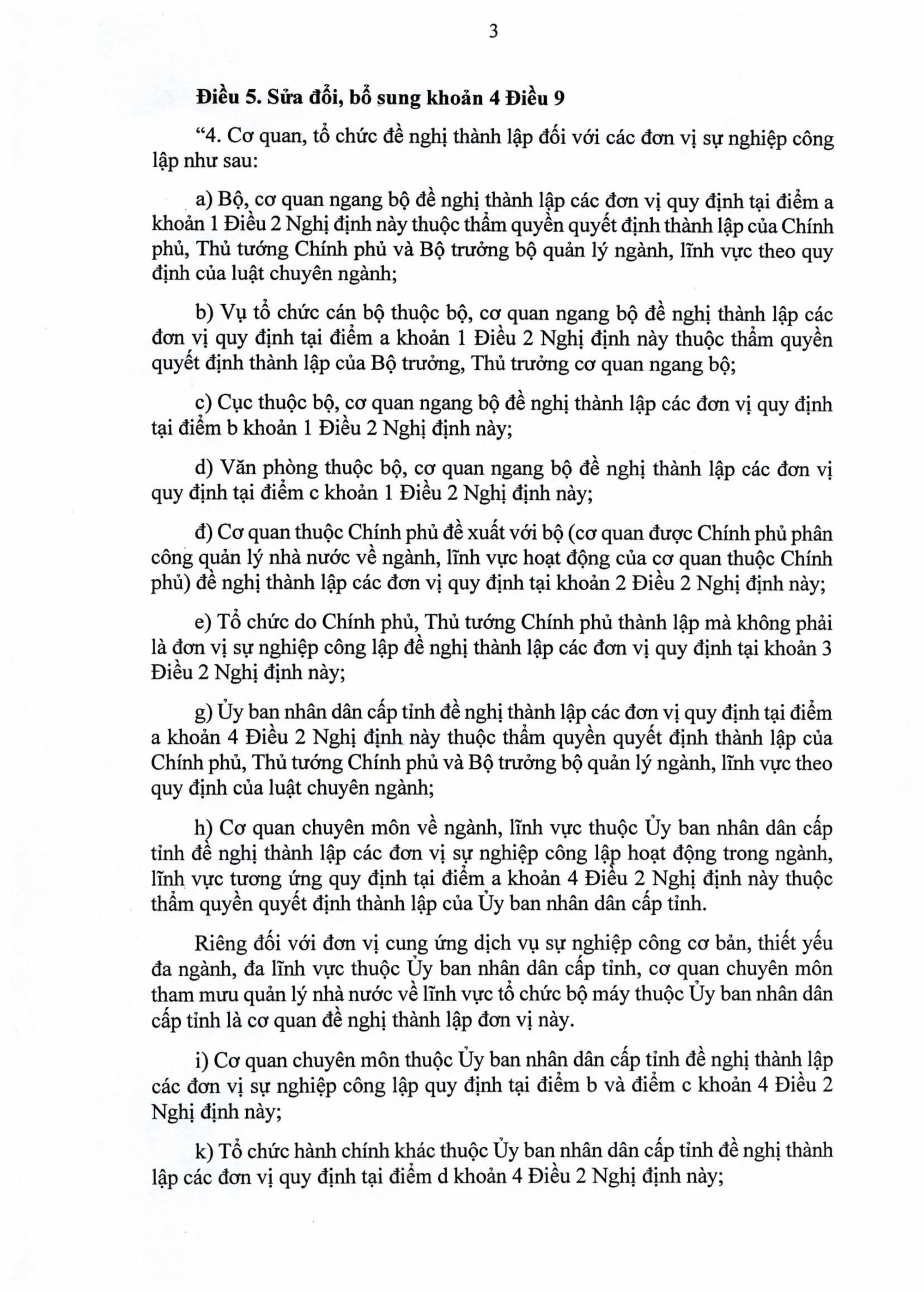 Theo đó, Nghị định số 283/2025/NĐ-CP sửa đổi, bổ sung một số khoản của Điều 2 (Đối tượng áp dụng); sửa đổi, bổ sung khoản 2 Điều 3 (Giải thích từ ngữ); Sửa đổi, bổ sung điểm c khoản 2 Điều 6 (tự chủ về tổ chức bộ máy); sửa đổi, bổ sung khoản 4 Điều 9 (Tờ trình thành lập); sửa đổi điểm d khoản 1 Điều 10 (Lấy ý kiến tham gia của các cơ quan, tổ chức liên quan); sửa đổi điểm đ khoản 1 Điều 13 (Thẩm định thành lập đơn vị sự nghiệp công lập); Bổ sung điều 18a (chuyển giao đơn vị sự nghiệp công lập); sửa đổi điểm b khoản 2 Điều 19 (Thẩm quyền của Chính phủ, Thủ tướng Chính phủ); sửa đổi, bổ sung khoản 1 Điều 21 (thẩm quyền và trách nhiệm của Bộ trưởng, Thủ trưởng cơ quan ngang bộ, Thủ trưởng cơ quan thuộc Chính phủ, người đứng đầu tổ chức do Chính phủ, Thủ tướng Chính phủ thành lập mà không phải là đơn vị sự nghiệp công lập); sửa đổi, bổ sung Điều 24 (Thẩm quyền và trách nhiệm của UBND cấp tỉnh, Chủ tịch UBND cấp tỉnh, UBND cấp huyện); sửa đổi, bổ sung Điều 27 (Quy định chuyển tiếp); sửa đổi, bổ sung Điều 28 (Áp dụng quy định của Nghị định này đối với đối tượng khác); Sửa đổi, bổ sung, thay thế, bãi bỏ một số quy định của Nghị định số 120/2020/NĐ-CP của Chính phủ quy định về thành lập, tổ chức lại, giải thể đơn vị sự nghiệp công lập…