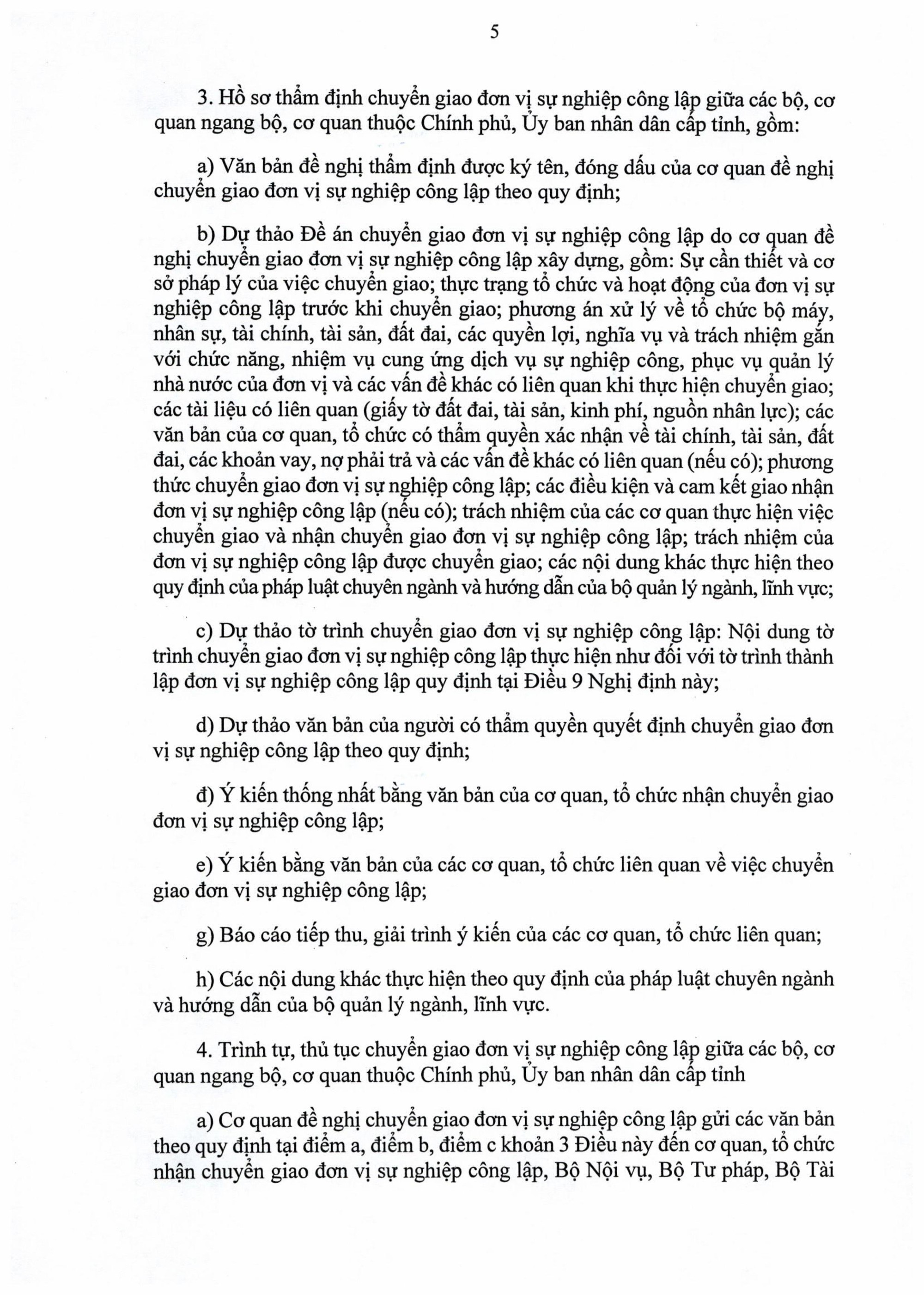 Bộ trưởng, Thủ trưởng cơ quan ngang bộ, Thủ trưởng cơ quan thuộc Chính phủ quyết định việc áp dụng các quy định về hồ sơ, trình tự, thủ tục tại khoản 3, khoản 4 Điều này để thực hiện chuyển giao đơn vị sự nghiệp công lập giữa các tổ chức, đơn vị thuộc bộ, cơ quan ngang bộ, cơ quan thuộc Chính phủ.