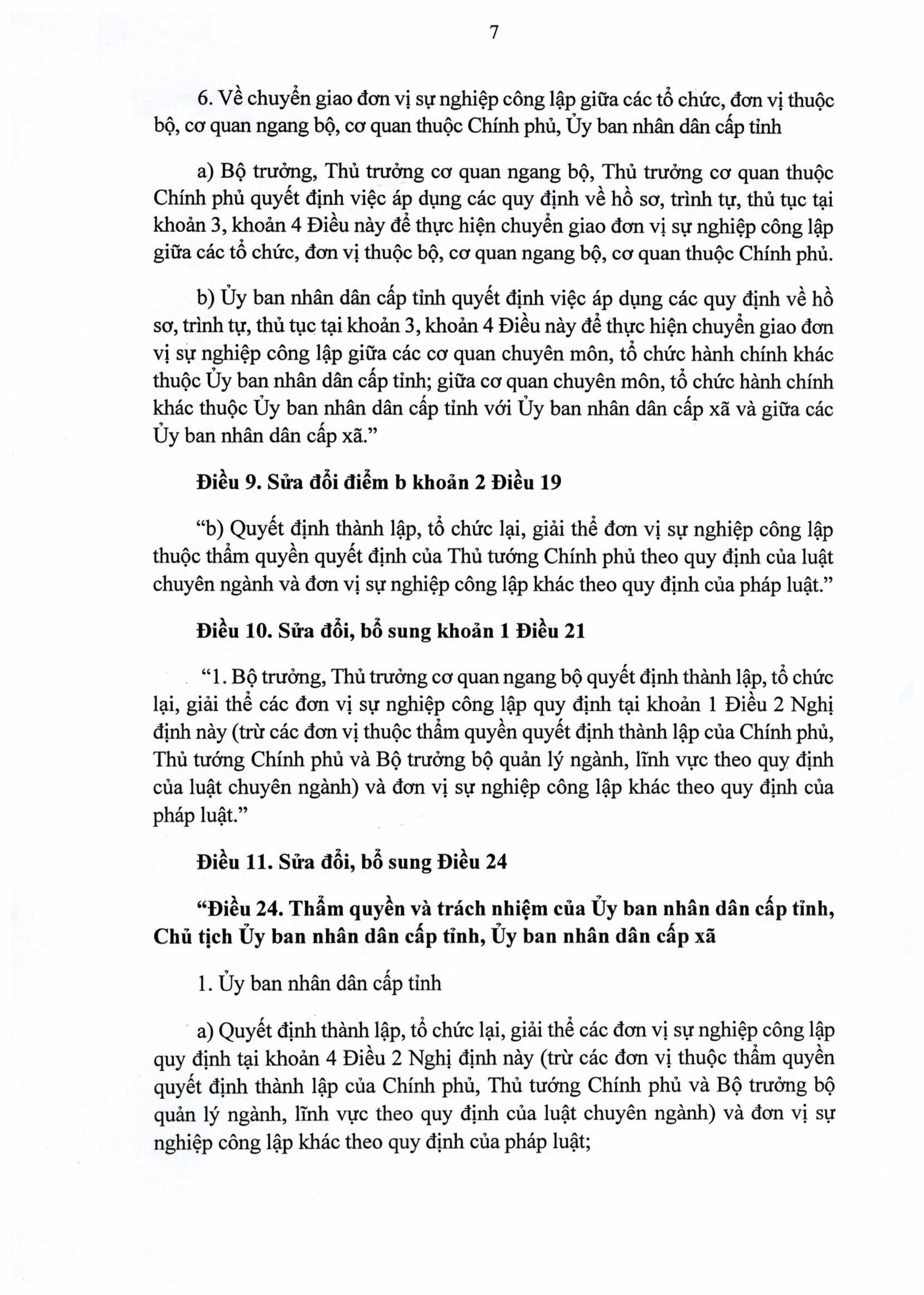 Thủ tướng Chính phủ quyết định việc chuyển giao đơn vị sự nghiệp công lập giữa các bộ, cơ quan ngang bộ, cơ quan thuộc Chính phủ (trừ các đơn vị sự nghiệp công lập thuộc cơ cấu tổ chức của bộ, cơ quan ngang bộ, cơ quan thuộc Chính phủ); giữa bộ, cơ quan ngang bộ, cơ quan thuộc Chính phủ với Ủy ban nhân dân cấp tỉnh và giữa các Ủy ban nhân dân cấp tỉnh.