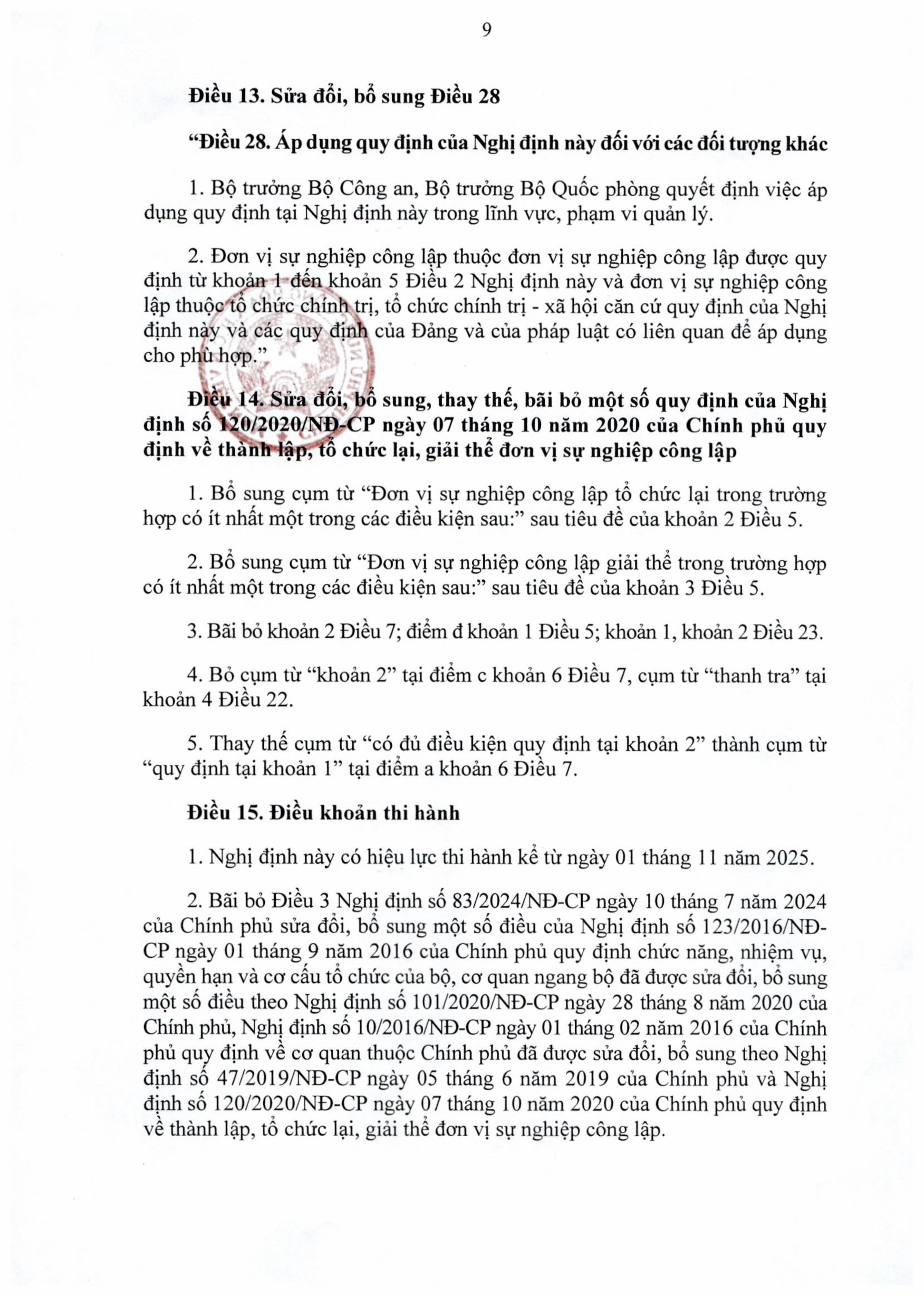 Chính phủ ban hành Nghị định số 283/2025/NĐ-CP ngày 31/10/2025 sửa đổi, bổ sung một số điều của Nghị định số 120/2020/NĐ-CP ngày 7/10/2020 của Chính phủ quy định về thành lập, tổ chức lại, giải thể đơn vị sự nghiệp công lập.