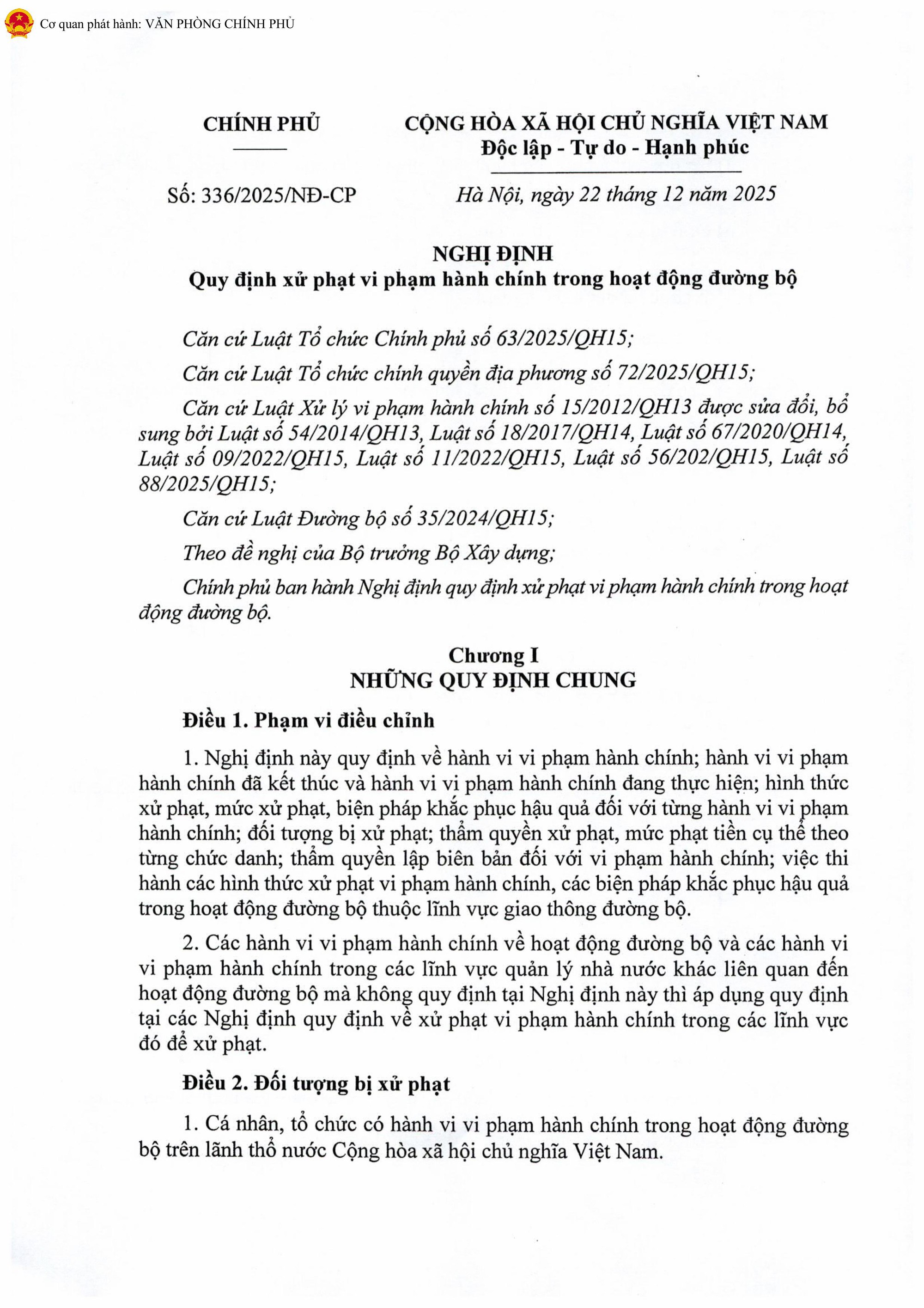 Chính phủ vừa ban hành Nghị định số 336/2025/NĐ-CP ngày 22/12/2025 quy định xử phạt vi phạm hành chính trong hoạt động đường bộ.