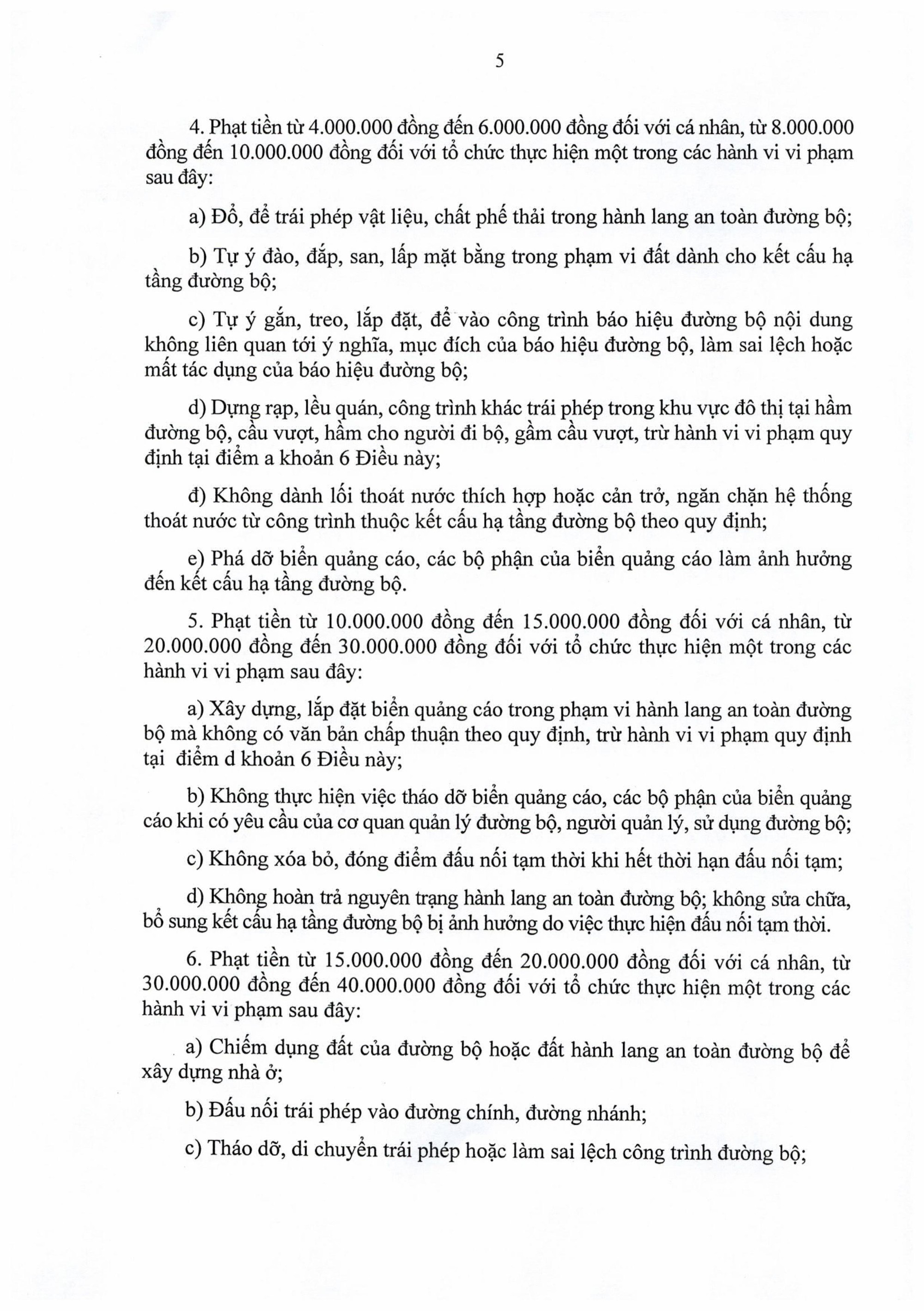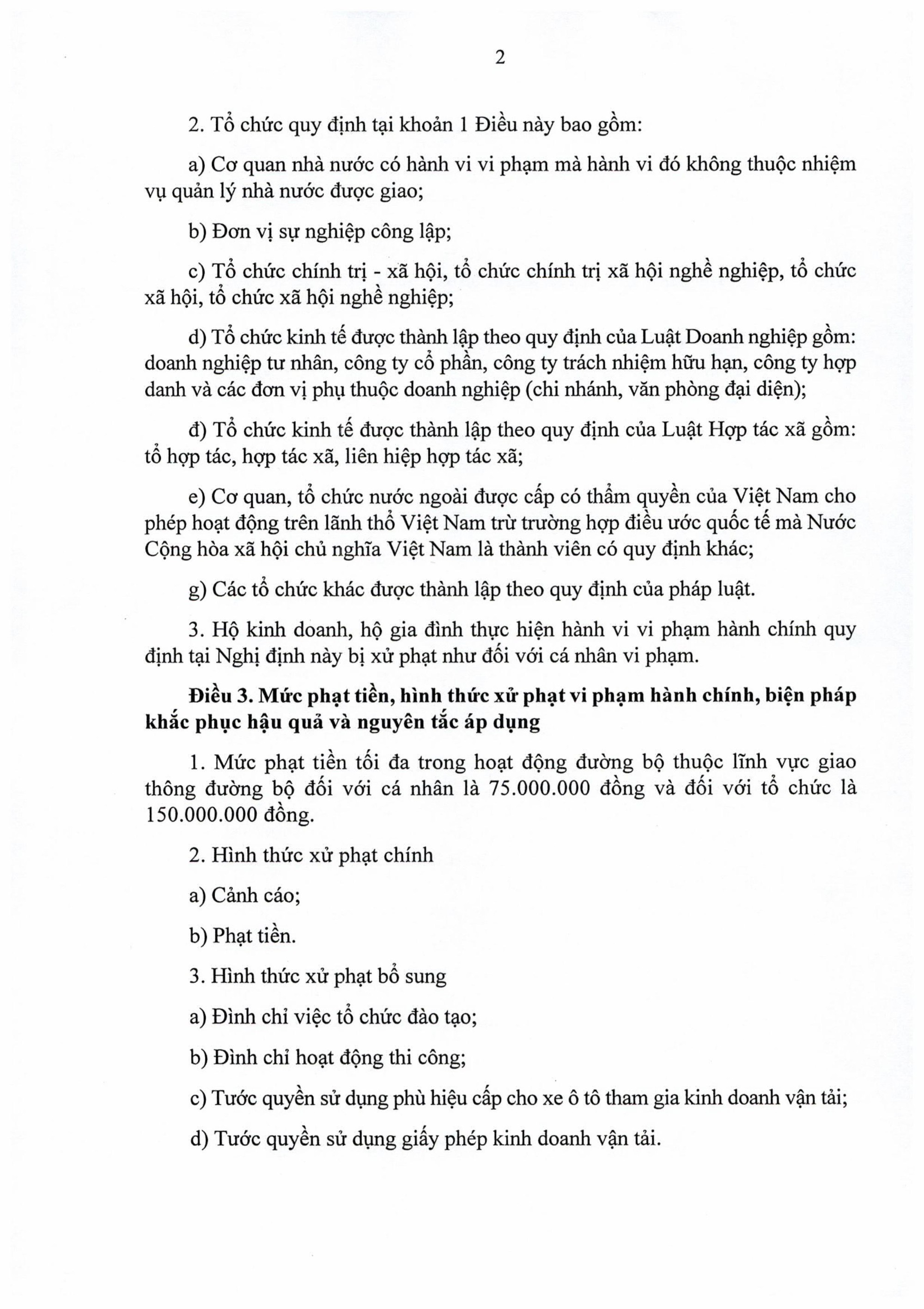 Đáng chú ý, tại khoản 1, Điều 3, quy định: "Mức phạt tiền tối đa trong hoạt động đường bộ thuộc lĩnh vực giao thông đường bộ đối với cá nhân là 75.000.000 đồng và đối với tổ chức là 150.000.000 đồng".