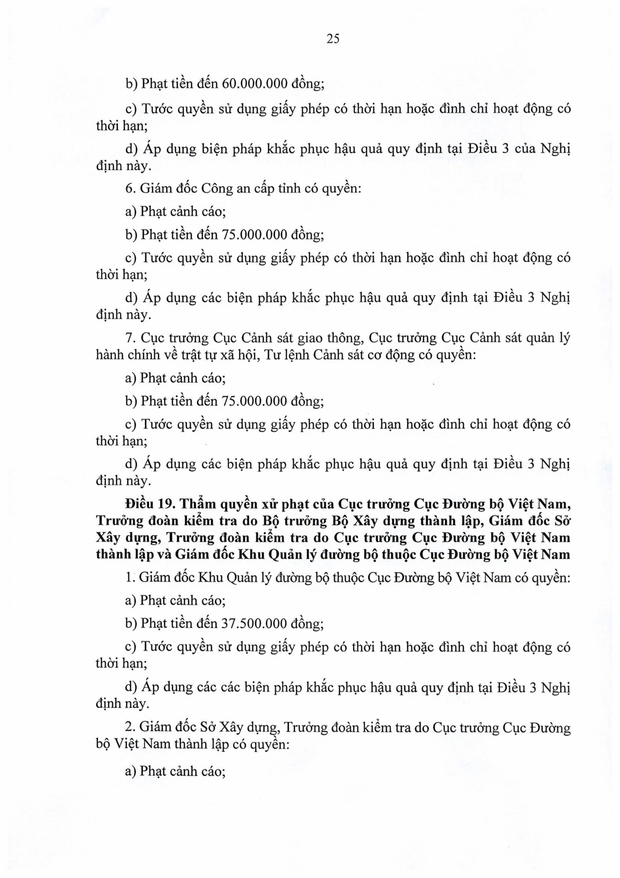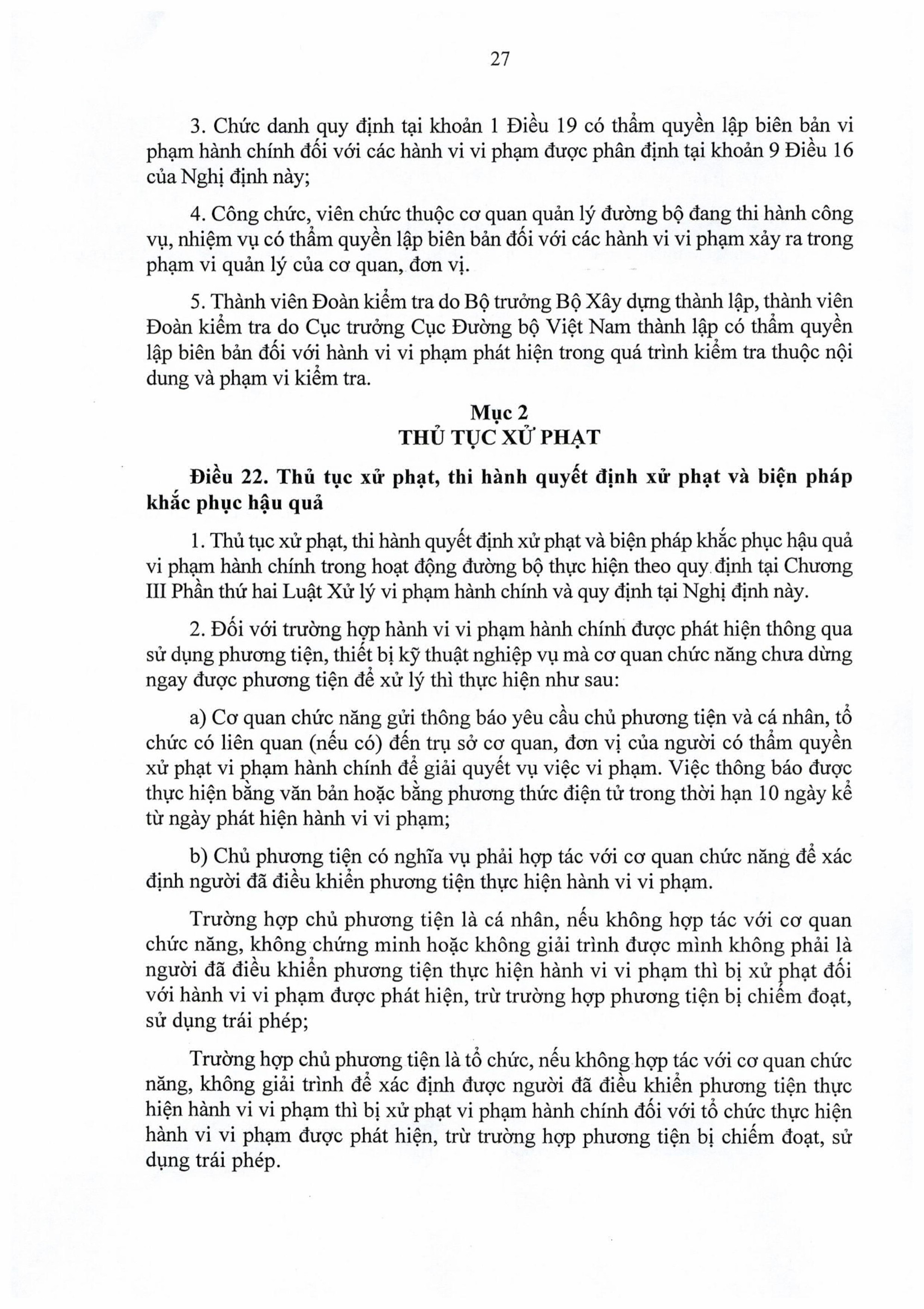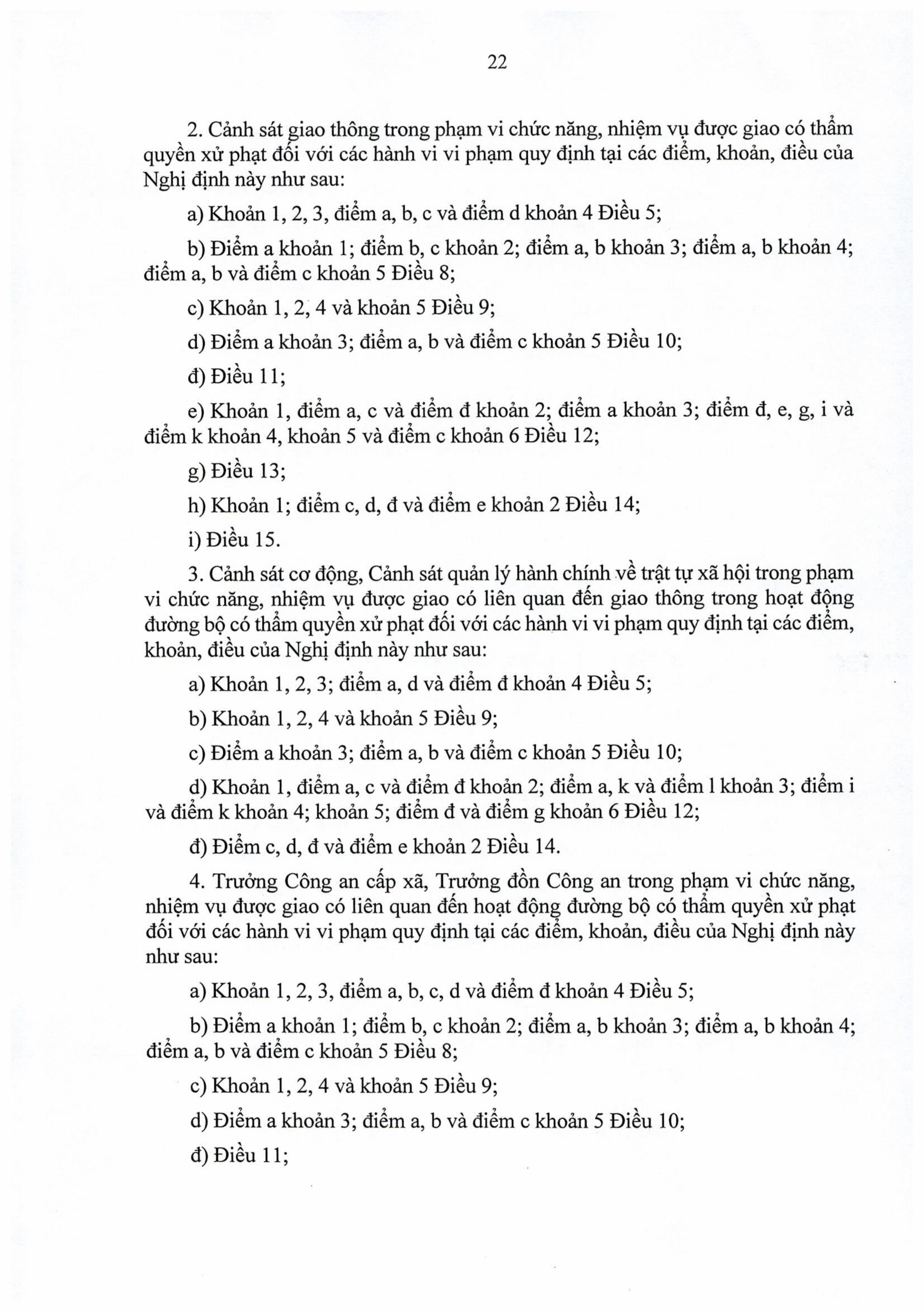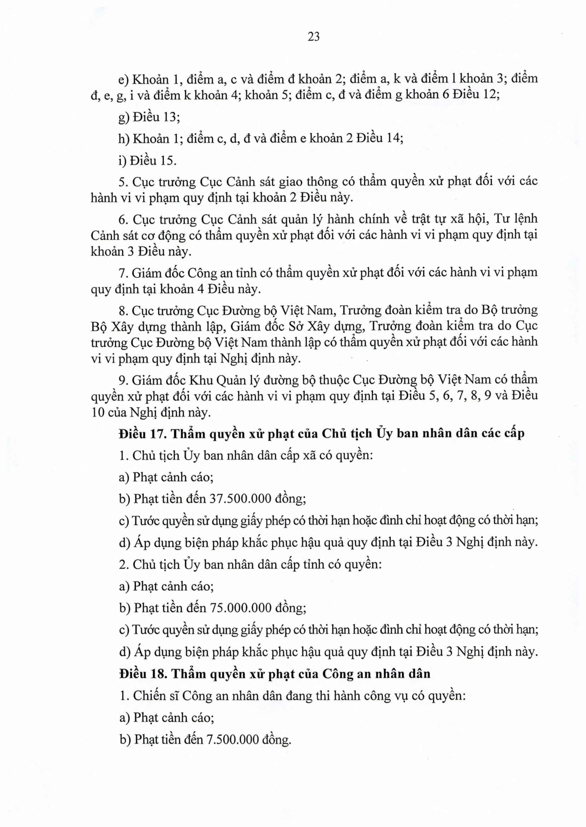 Nghị định cũng quy định rõ đối tượng bị xử phạt; thẩm quyền xử phạt, mực phạt tiền cụ thể theo từng chức danh; thẩm quyền lập biên bản đối với vi phạm hành chính; việc thi hành các hình thức xử phạt vi phạm hành chính, các biện pháp khắc phục hậu quả trong hoạt động đường bộ thuộc lĩnh vực giao thông đường bộ.