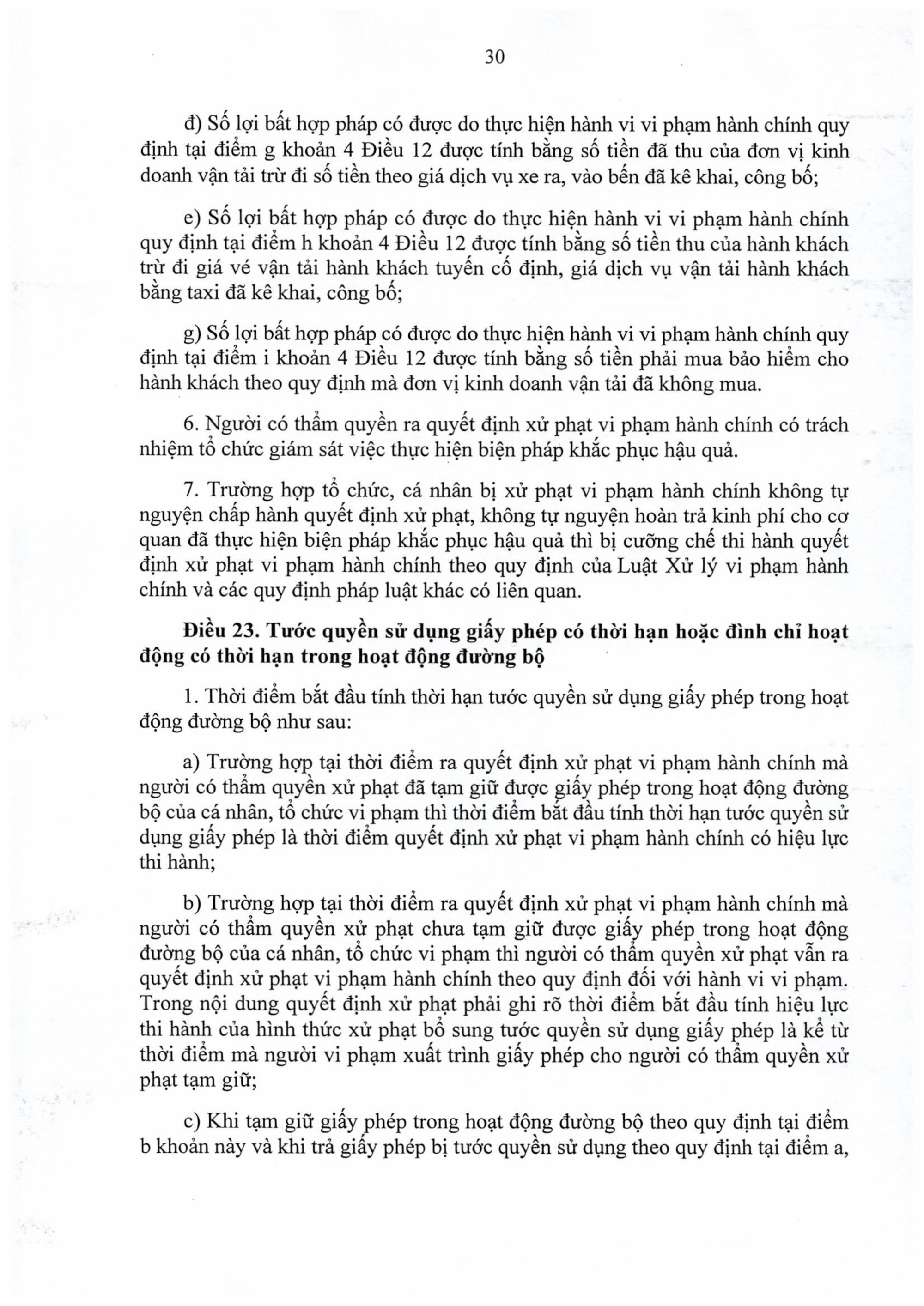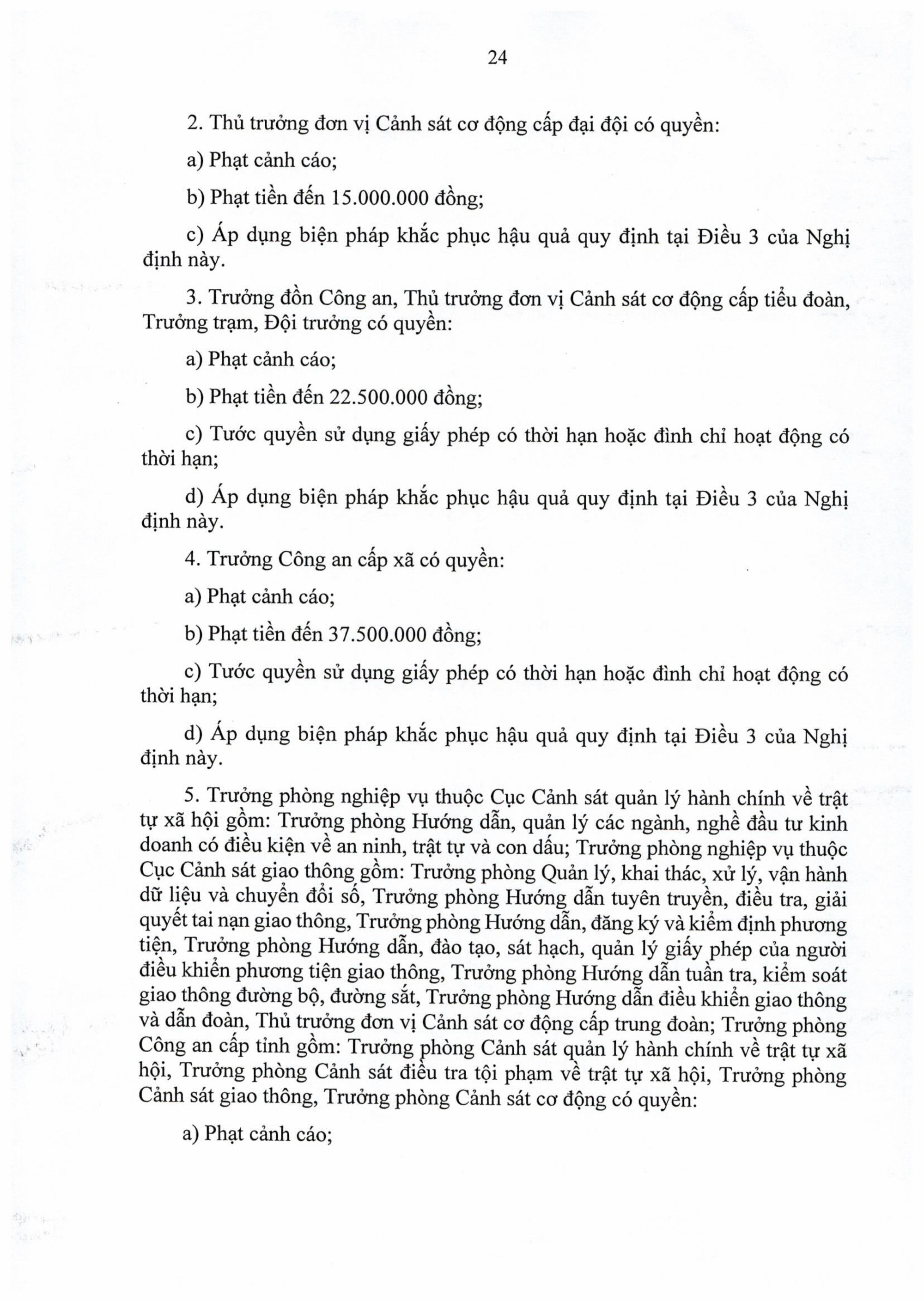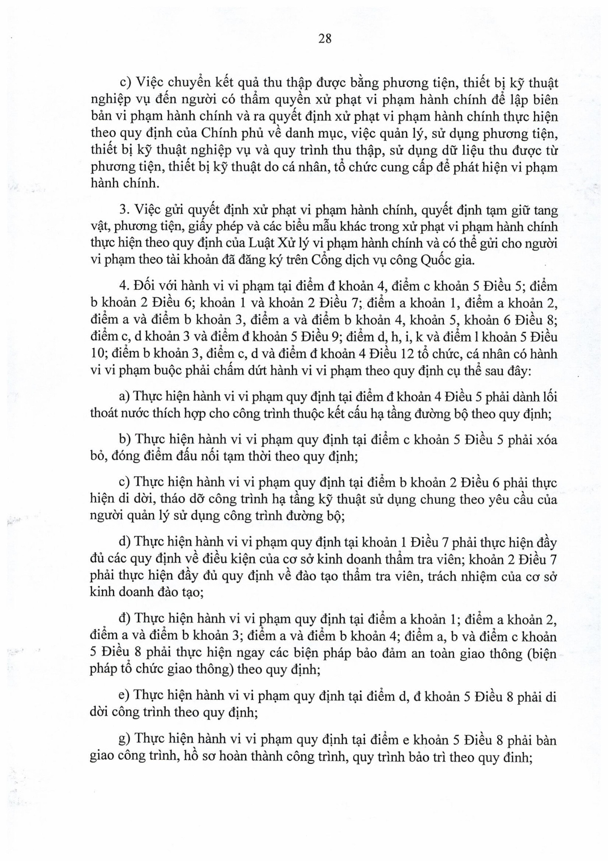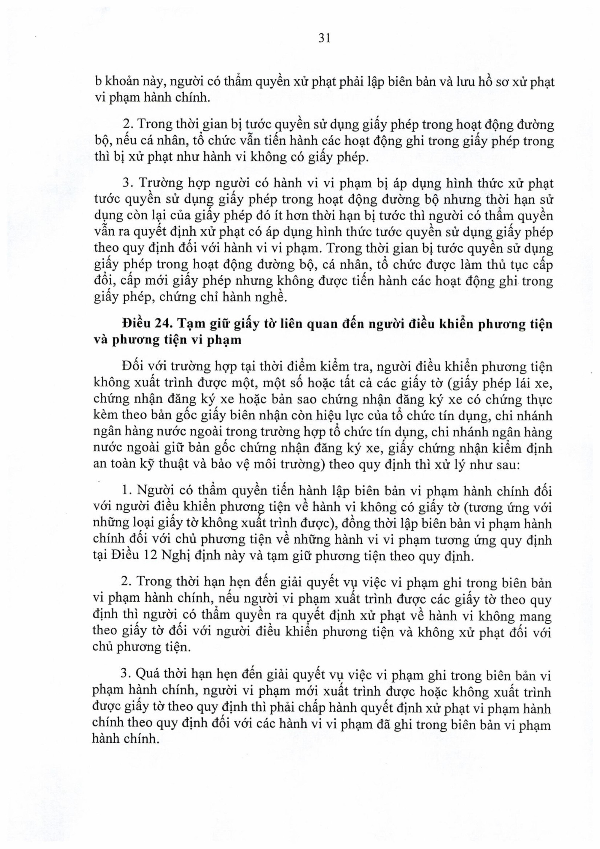Nghị định cũng quy định rõ đối tượng bị xử phạt; thẩm quyền xử phạt, mực phạt tiền cụ thể theo từng chức danh; thẩm quyền lập biên bản đối với vi phạm hành chính; việc thi hành các hình thức xử phạt vi phạm hành chính, các biện pháp khắc phục hậu quả trong hoạt động đường bộ thuộc lĩnh vực giao thông đường bộ.