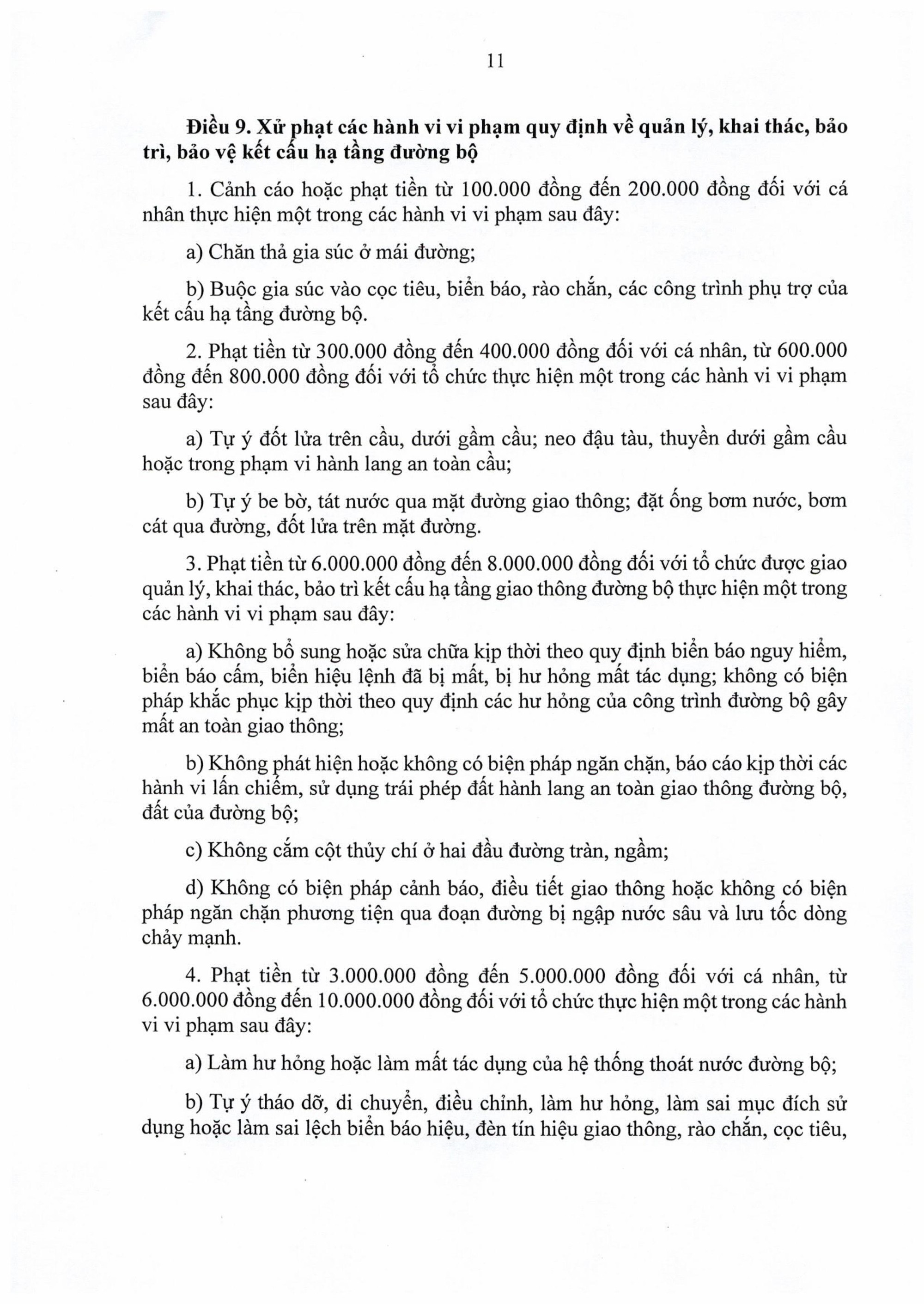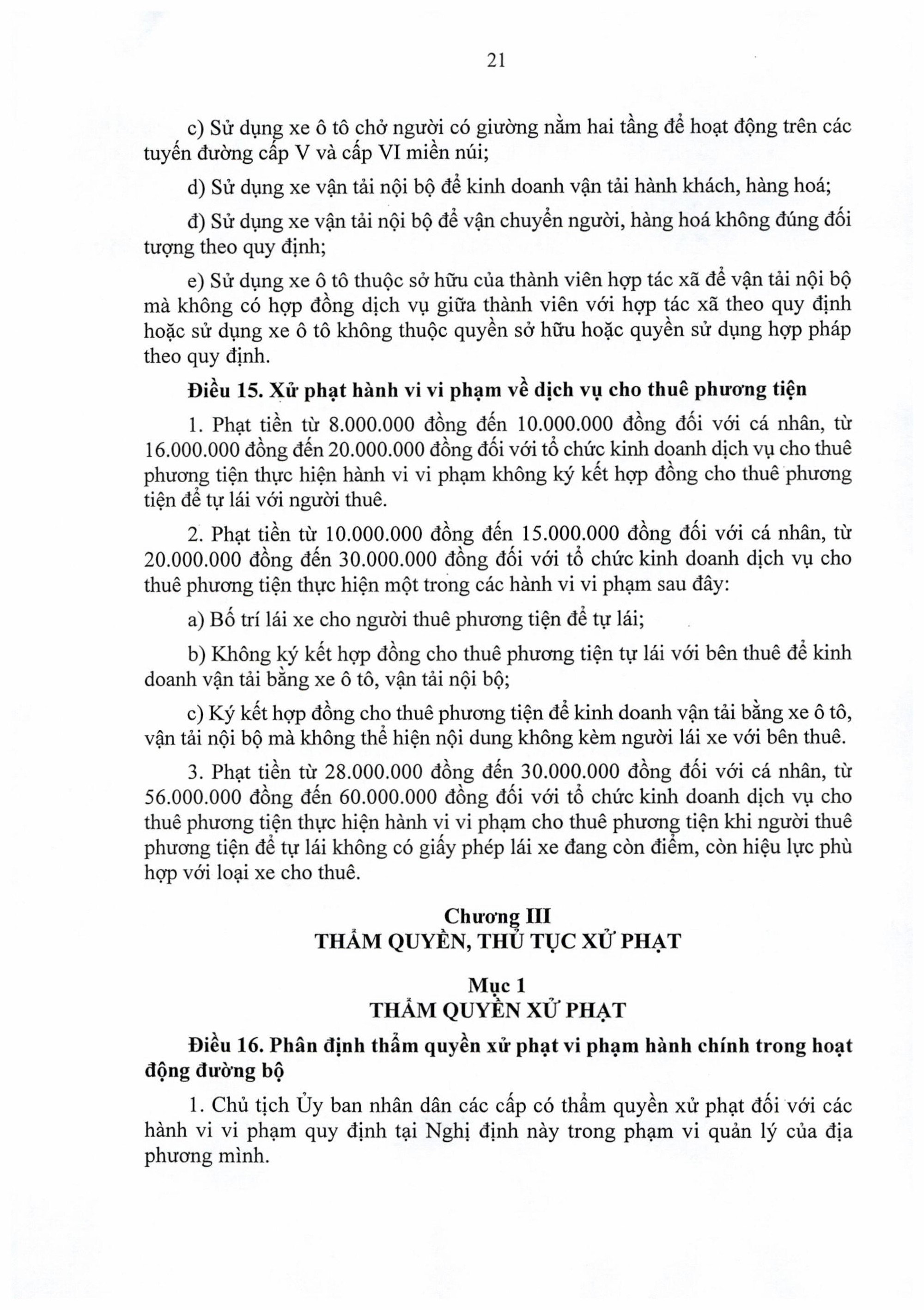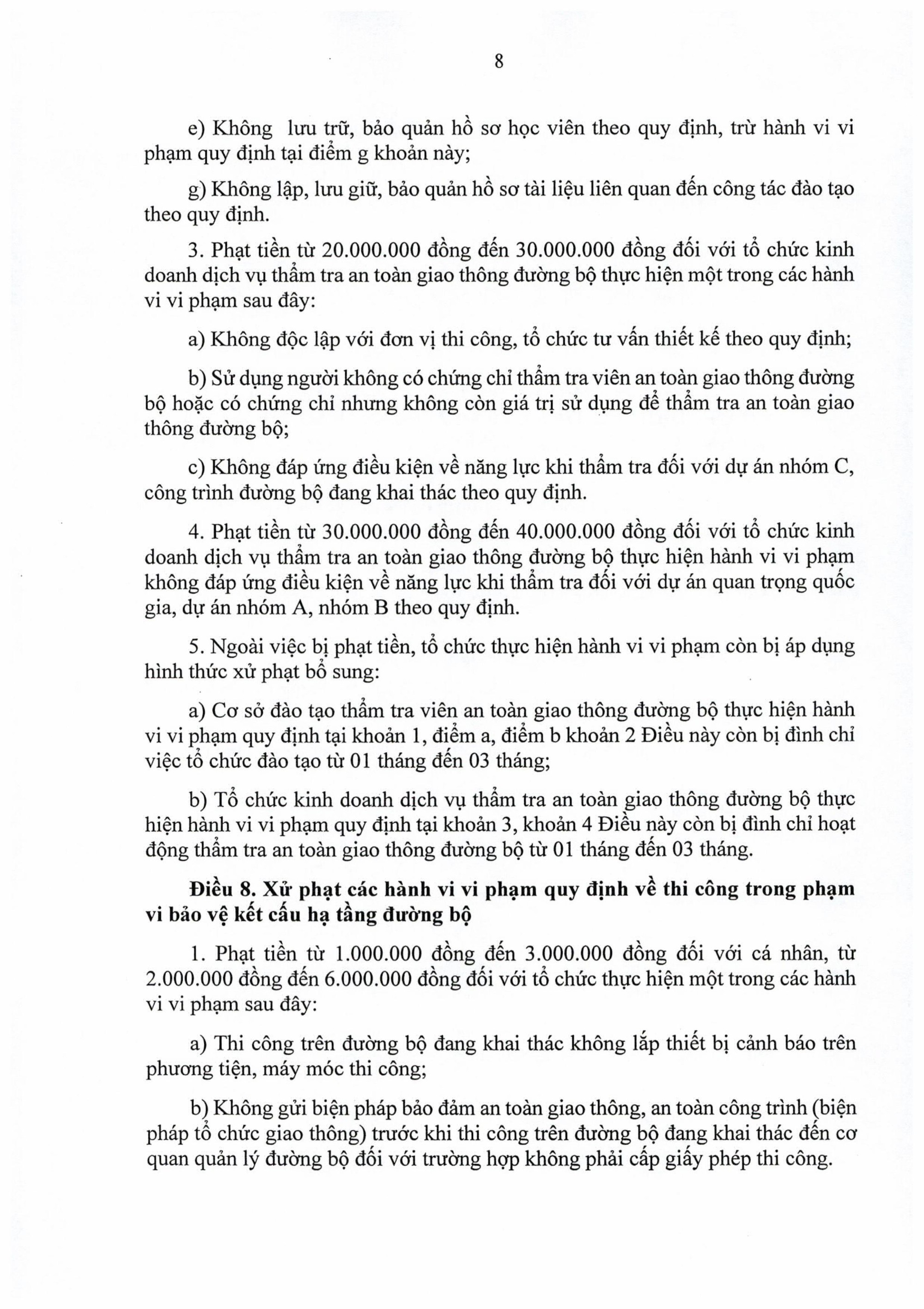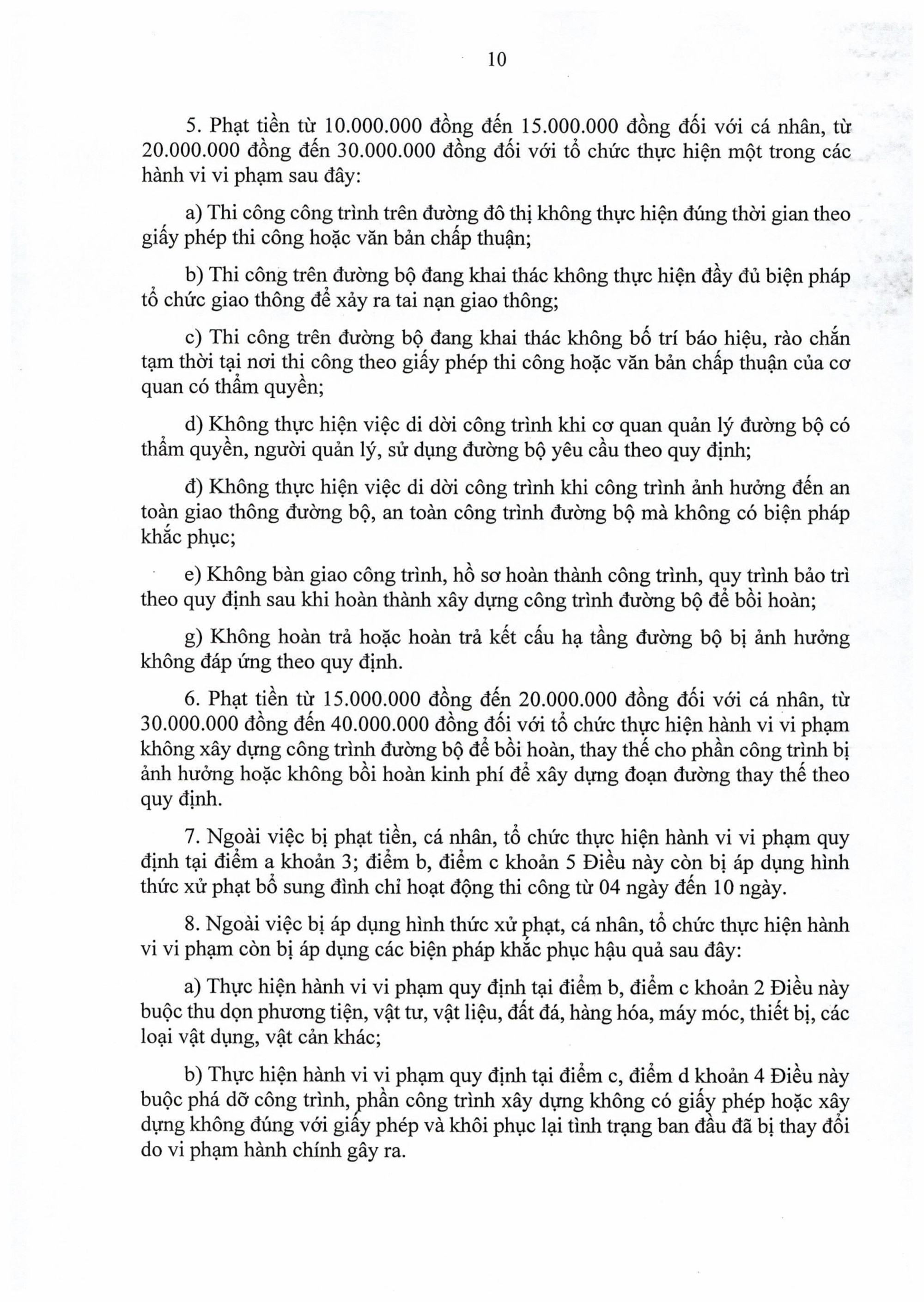 Nghị định cũng quy định rõ đối tượng bị xử phạt; thẩm quyền xử phạt, mực phạt tiền cụ thể theo từng chức danh; thẩm quyền lập biên bản đối với vi phạm hành chính; việc thi hành các hình thức xử phạt vi phạm hành chính, các biện pháp khắc phục hậu quả trong hoạt động đường bộ thuộc lĩnh vực giao thông đường bộ.
