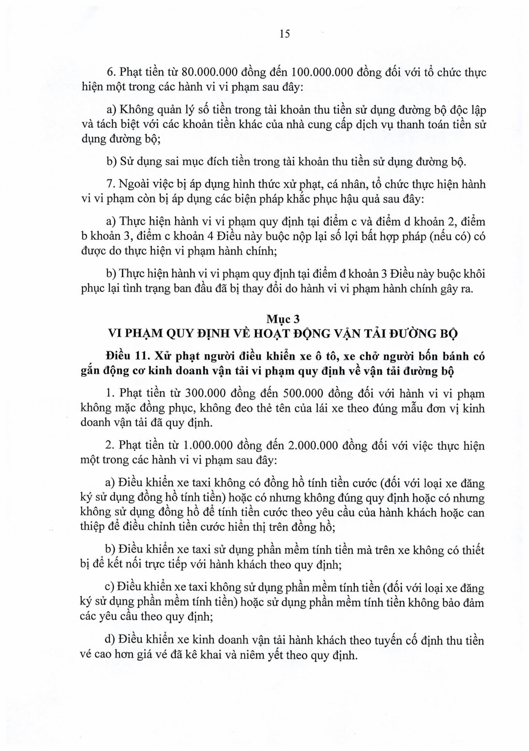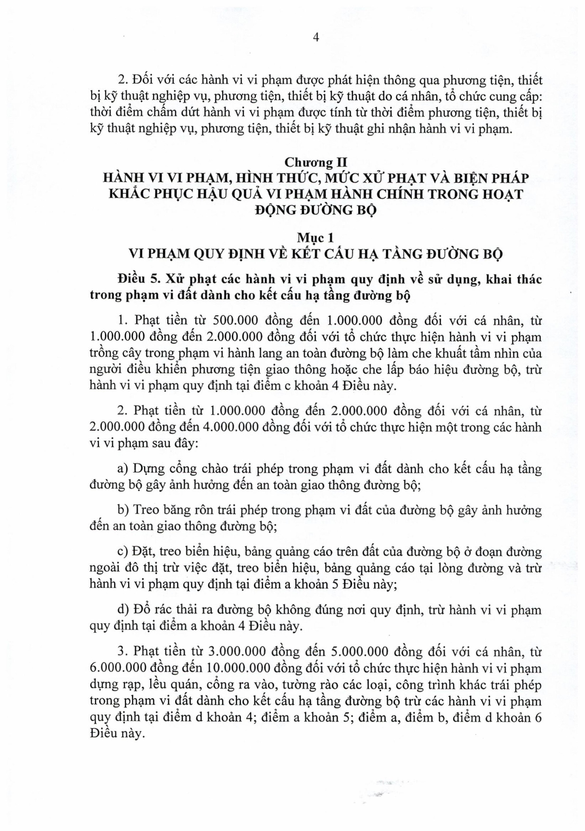 Chương II quy định về hành vi vi phạm, hình thức, mức xử phạt và biện pháp khắc phục hậu quả vi phạm hành chính trong hoạt động đường bộ (từ Điều 5 đến Điều 15).